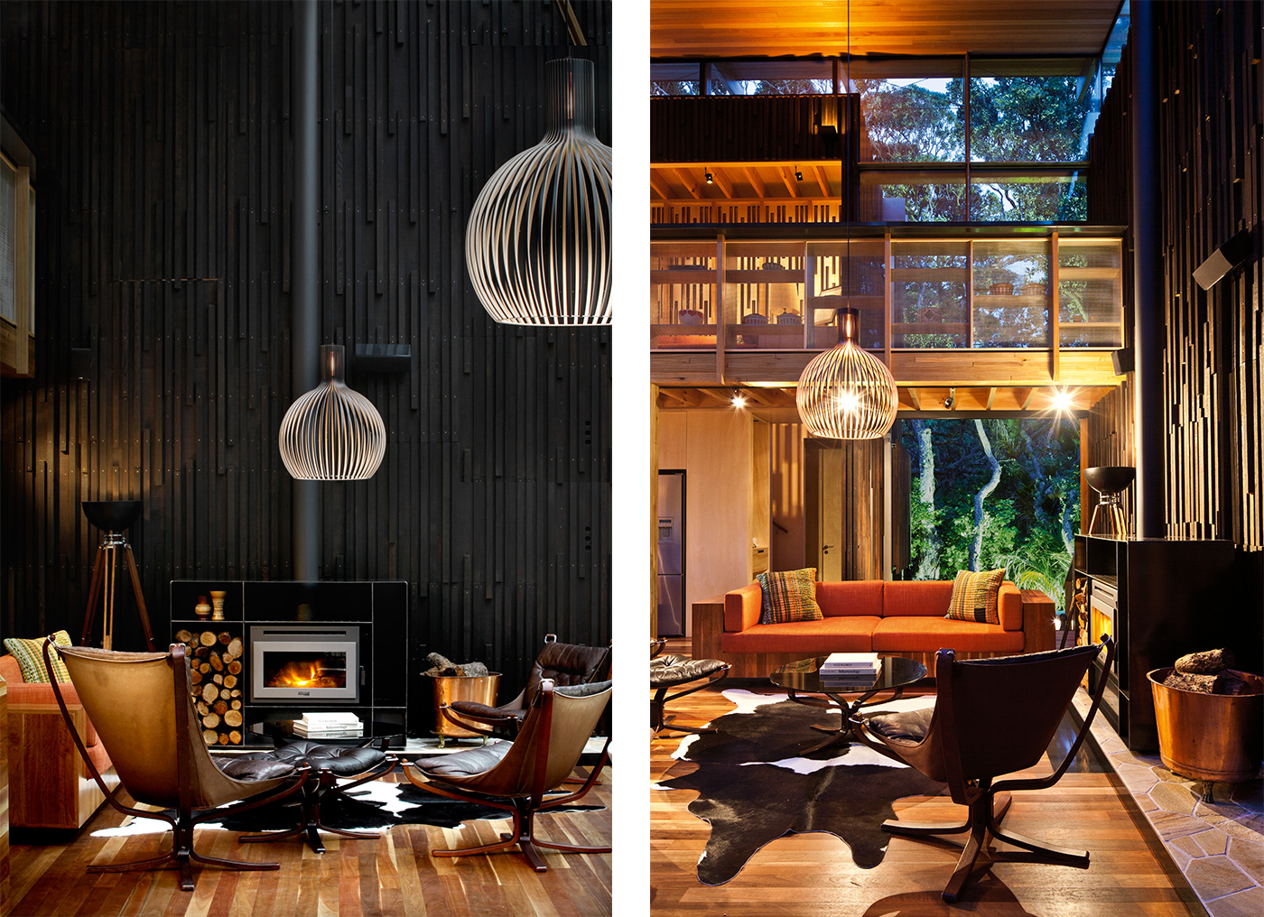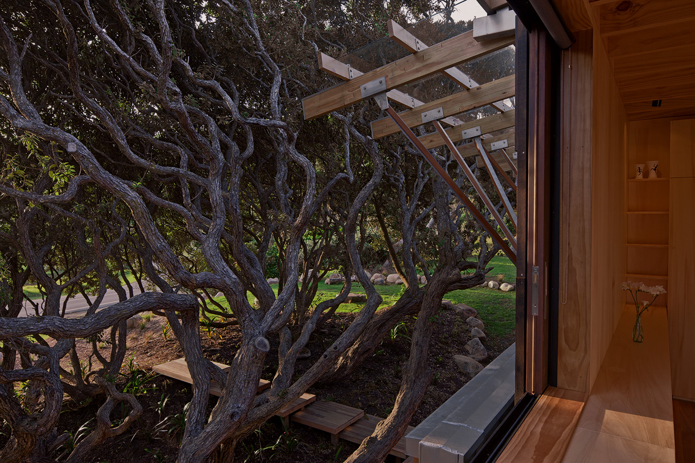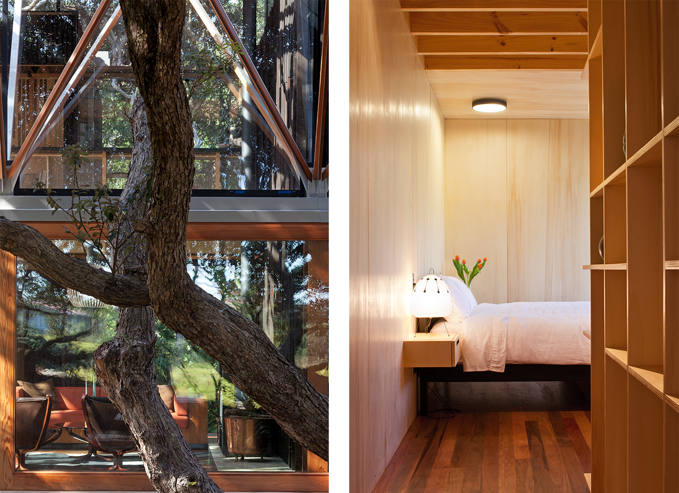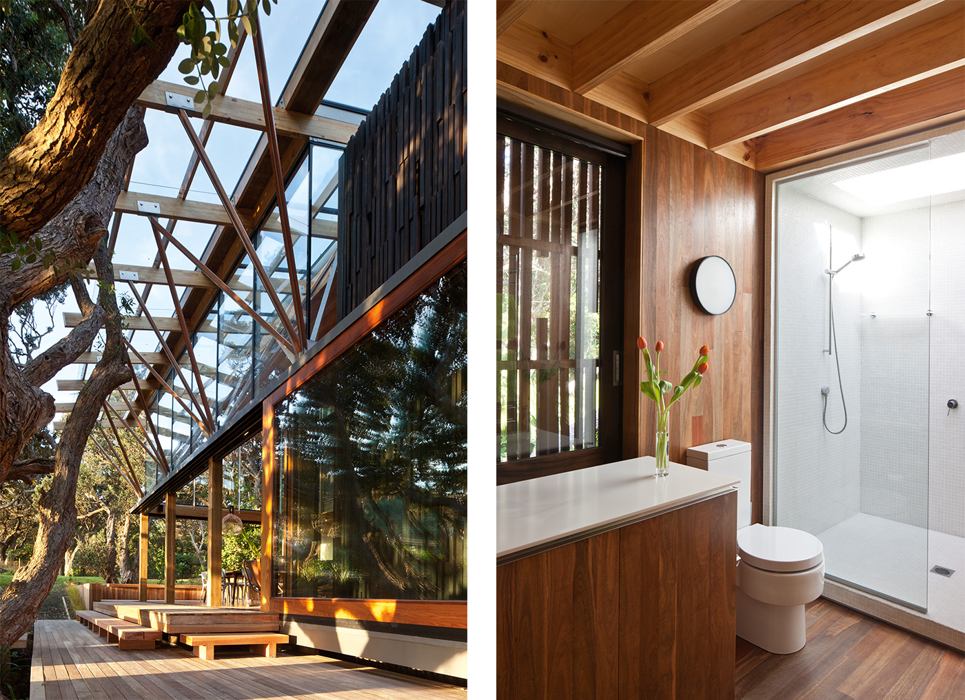 These blocks are clad in dark cedar boards with battens arranged in a pattern that loosely mimics pohutukawa bark, while the light poplar ply that lines their interiors suggests the hollowed-out timber inside the trees. Between these two forms is a lofty living, kitchen and dining area where the part-glass roof is dramatically held up by ethereal, painstakingly realised geometric branches of steel and timber. The views reach all the way to the top of the pohutukawa canopy.