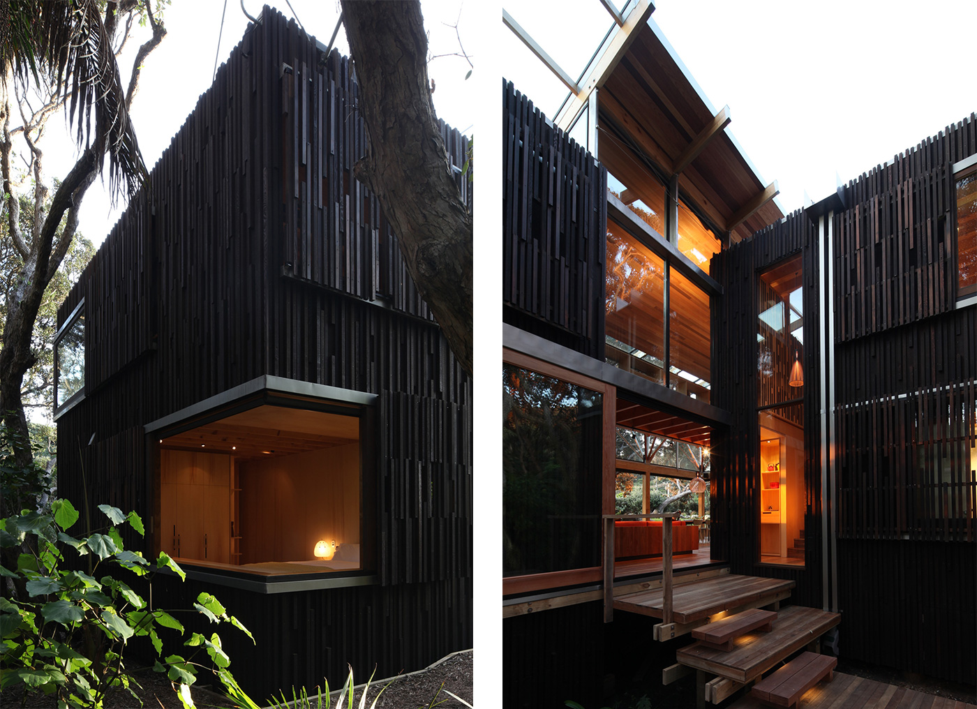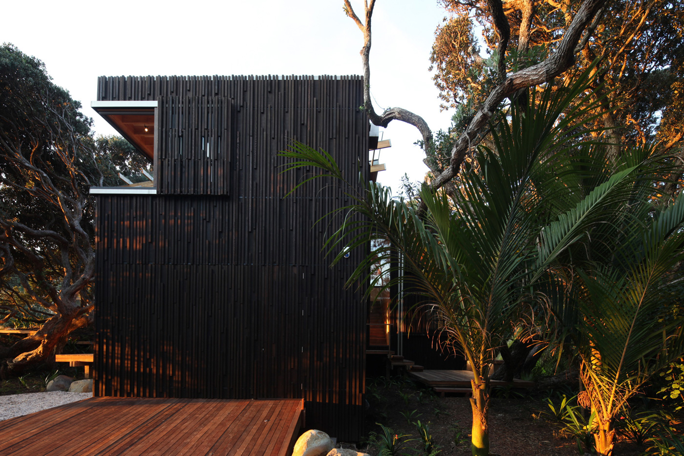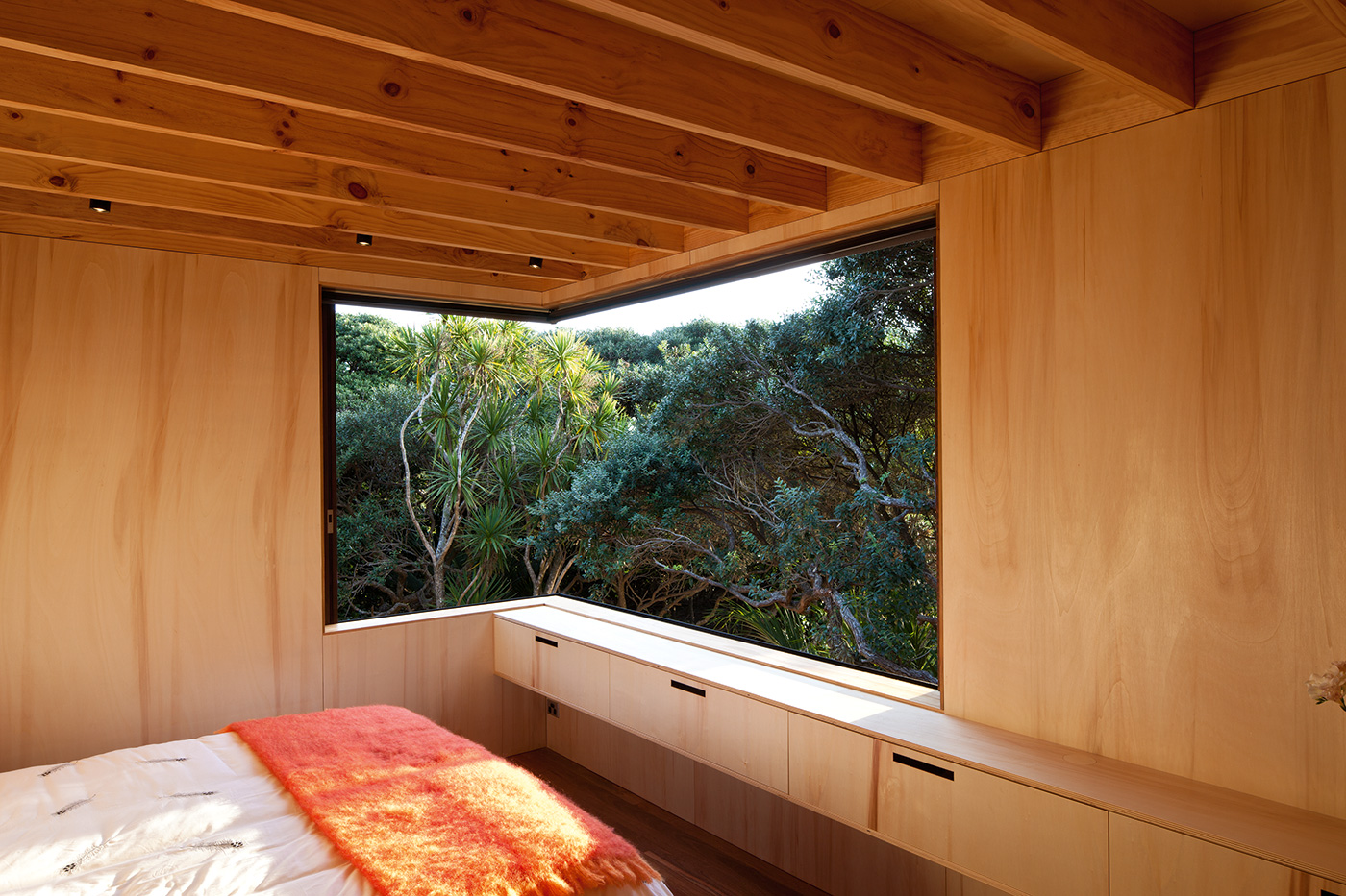 The home offers other perspectives on the copse of which it now forms the heart. The main bedroom has windows that slide away to offer a nicely cropped view of the canopy (and a slice of the beach), while the same approach in the downstairs bedroom yields a dense panorama of thick nikau trunks and vivid undergrowth. The mezzanine bridge that connects the dark-clad timber volumes features a built-in daybed sheltered by the sloping cedar ceiling and featuring a view across the living pavilion to the treetops outside. The back corner of the living area opens and steps down to a sheltered deck that catches the morning sun and looks onto more nikau palms at the rear of the home.