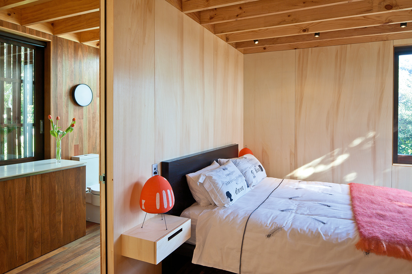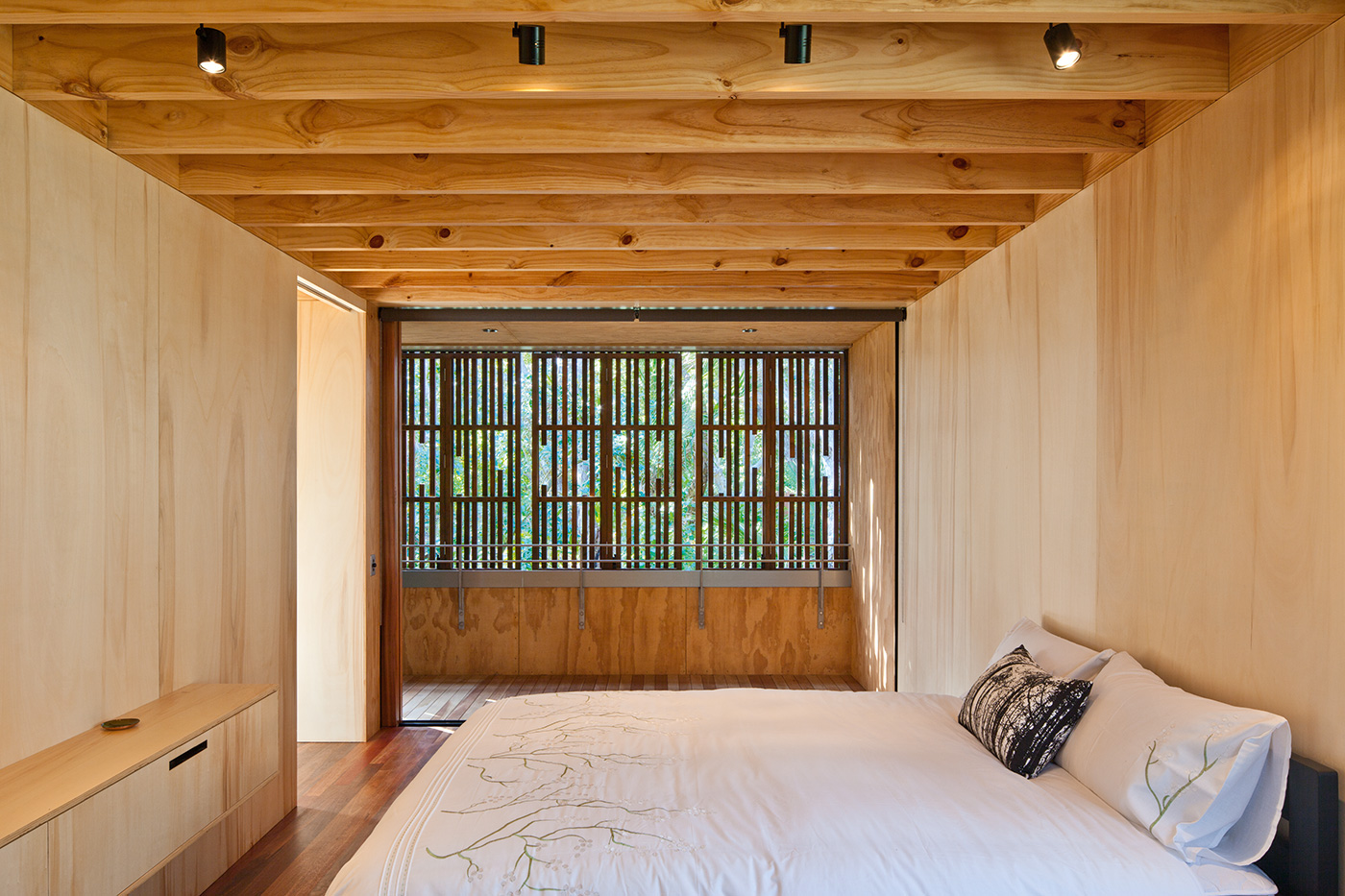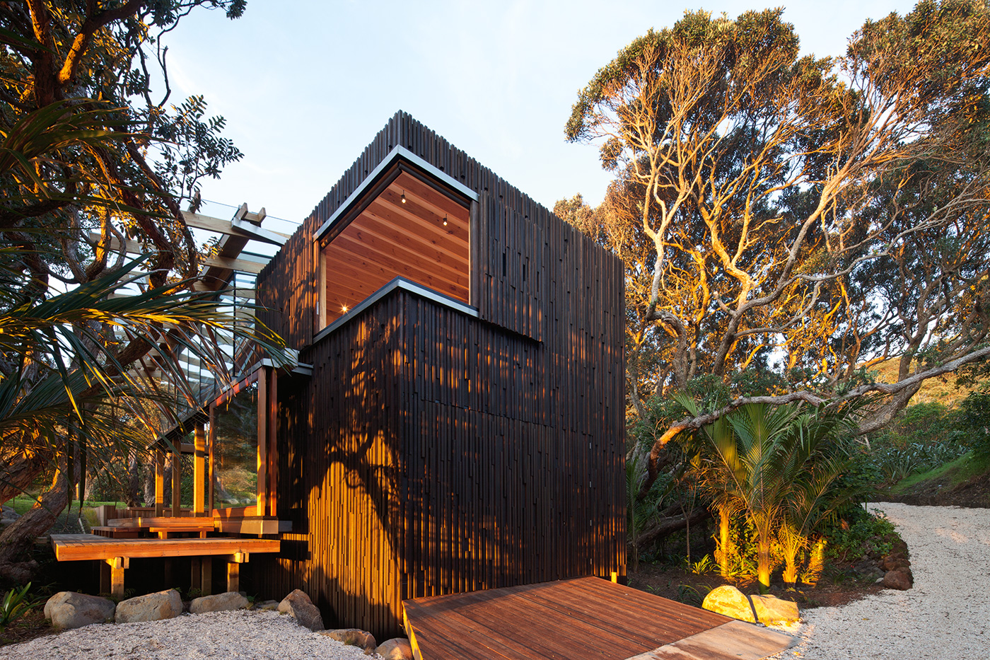 The home offers other perspectives on the copse of which it now forms the heart. The main bedroom has windows that slide away to offer a nicely cropped view of the canopy (and a slice of the beach), while the same approach in the downstairs bedroom yields a dense panorama of thick nikau trunks and vivid undergrowth. The mezzanine bridge that connects the dark-clad timber volumes features a built-in daybed sheltered by the sloping cedar ceiling and featuring a view across the living pavilion to the treetops outside. The back corner of the living area opens and steps down to a sheltered deck that catches the morning sun and looks onto more nikau palms at the rear of the home.