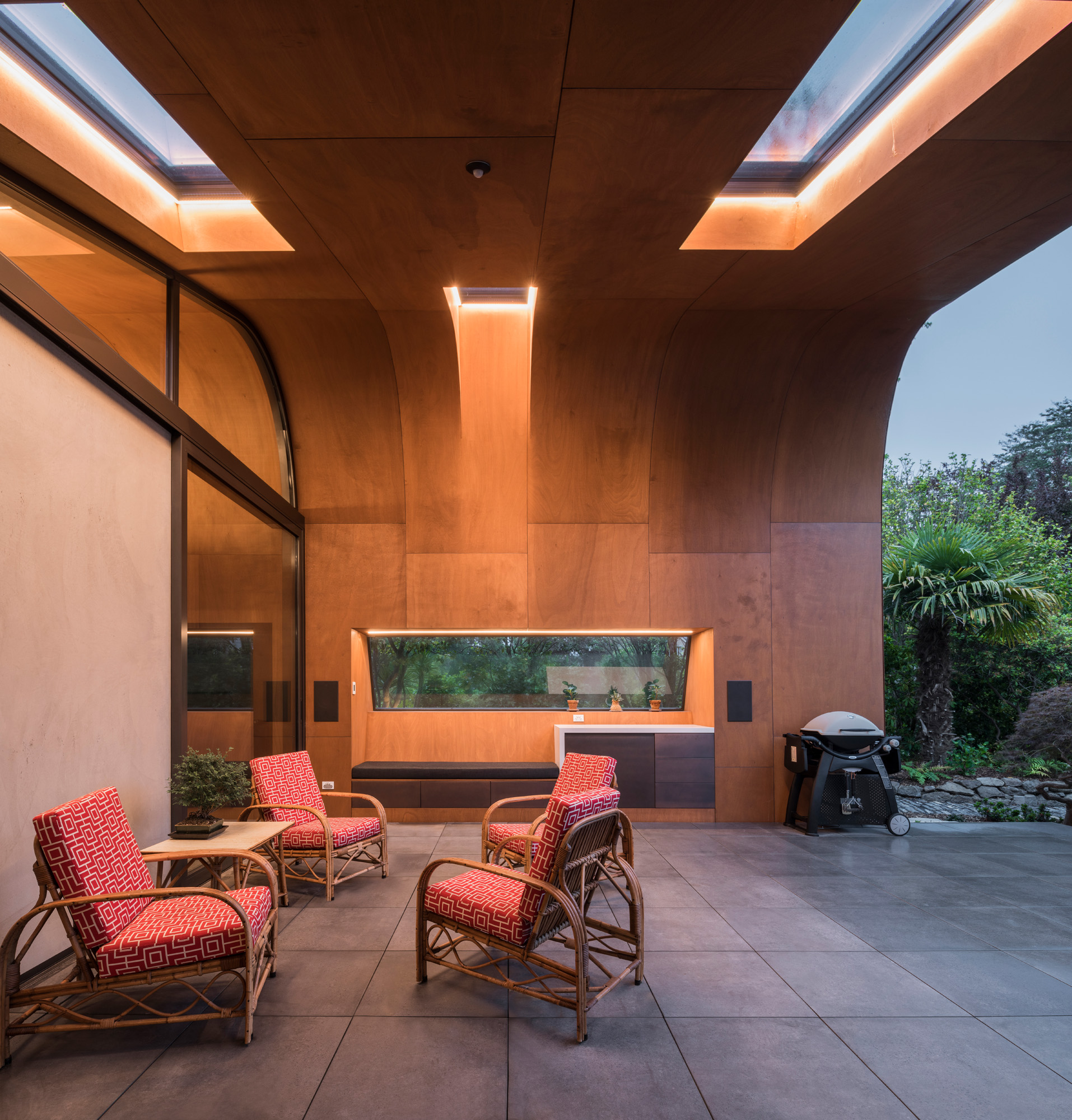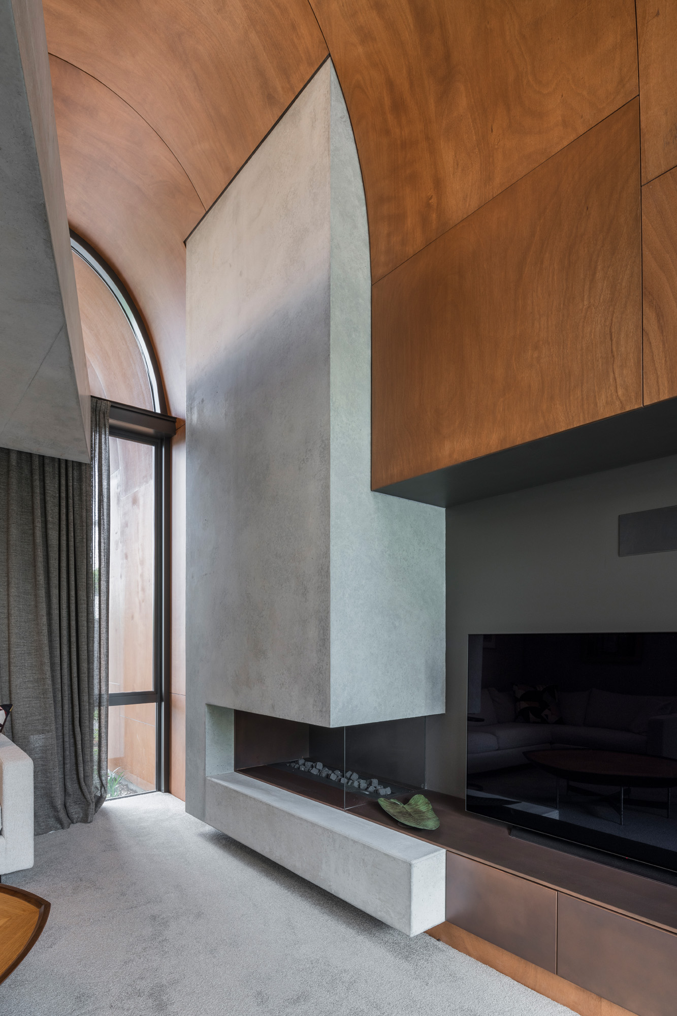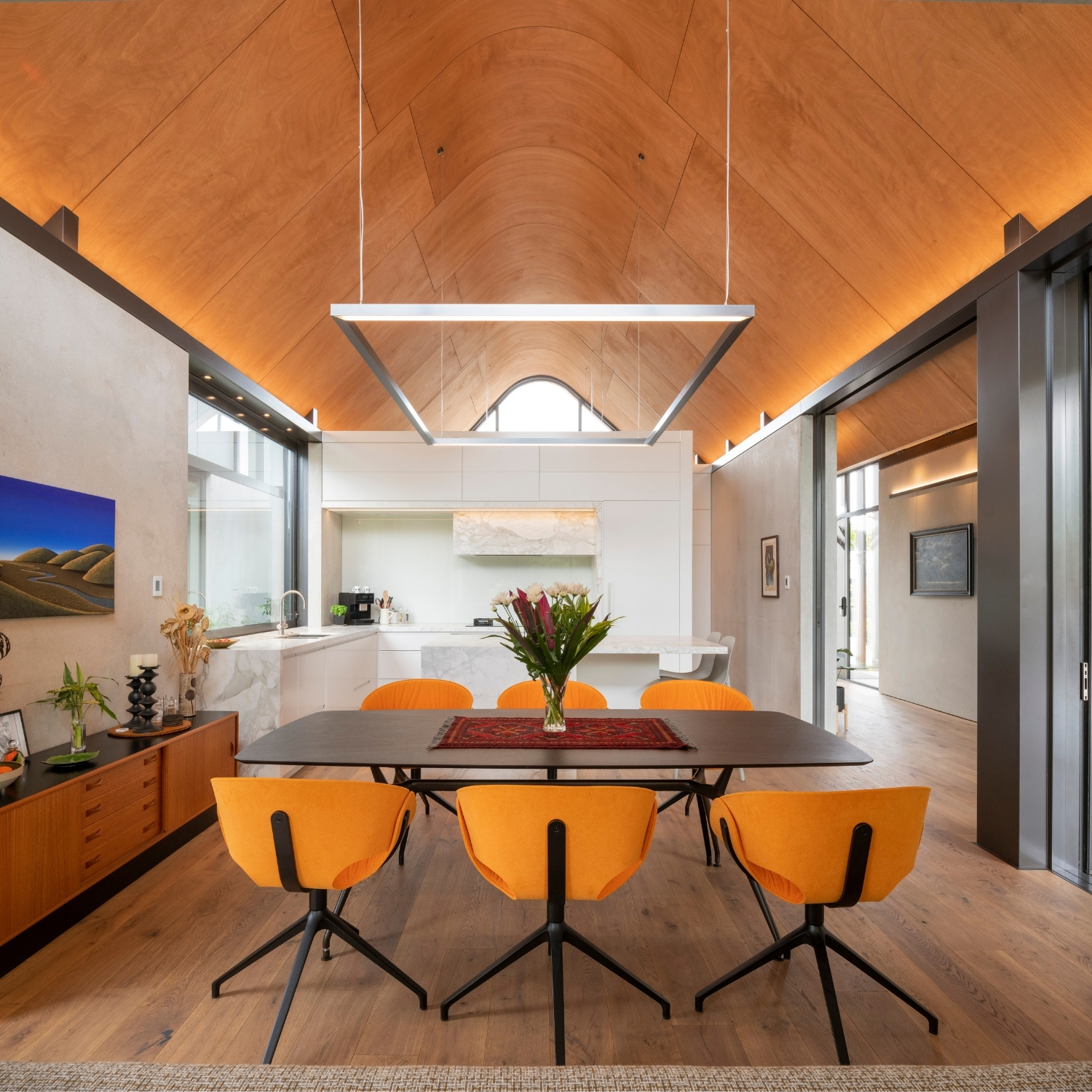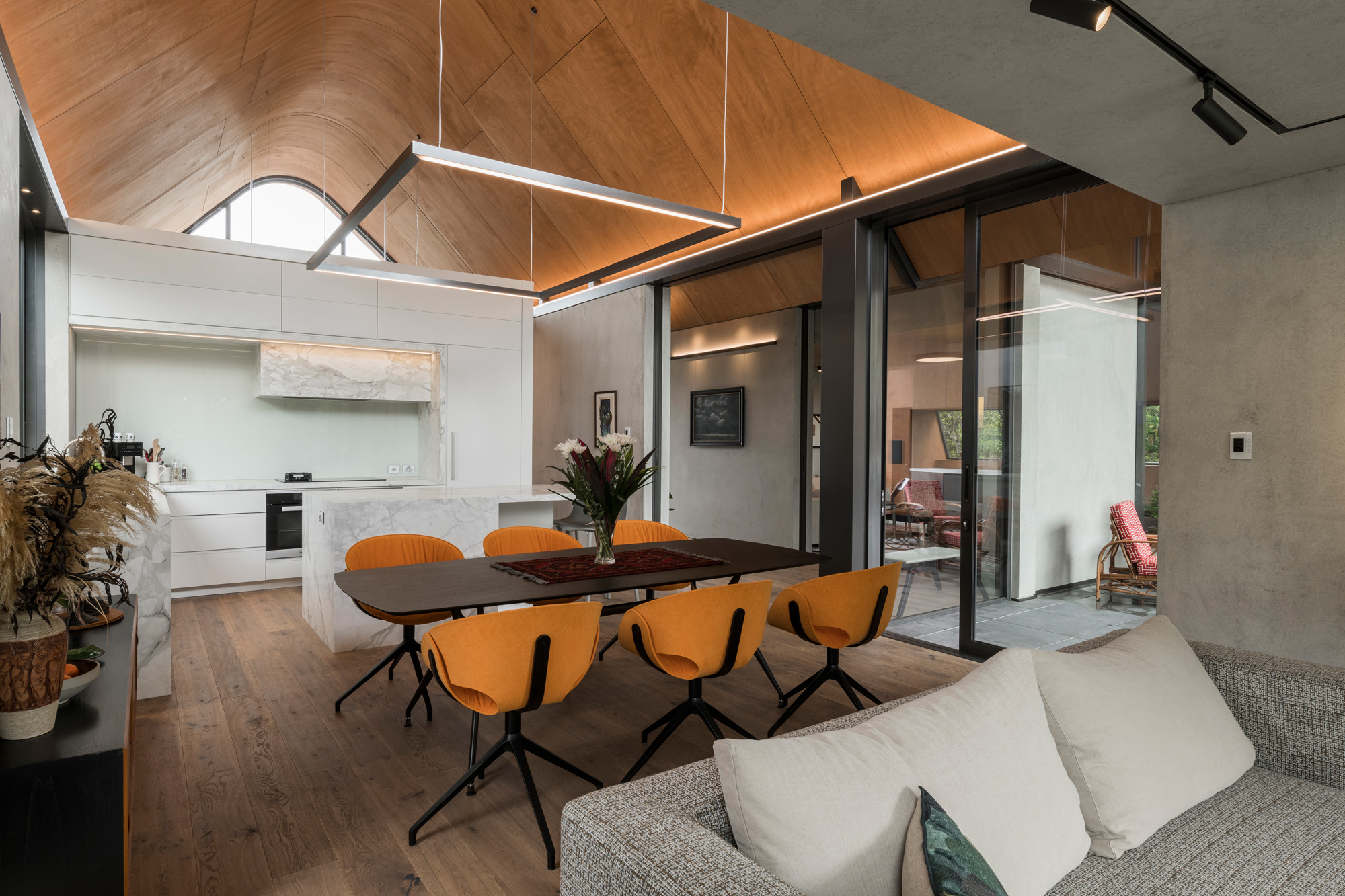 Made of stained gaboon ply, they echo the geometry of the roof to create incredible volume over, say, the dining area but are countered by dropped ceilings where more intimacy is required — such as in the TV den and living room.