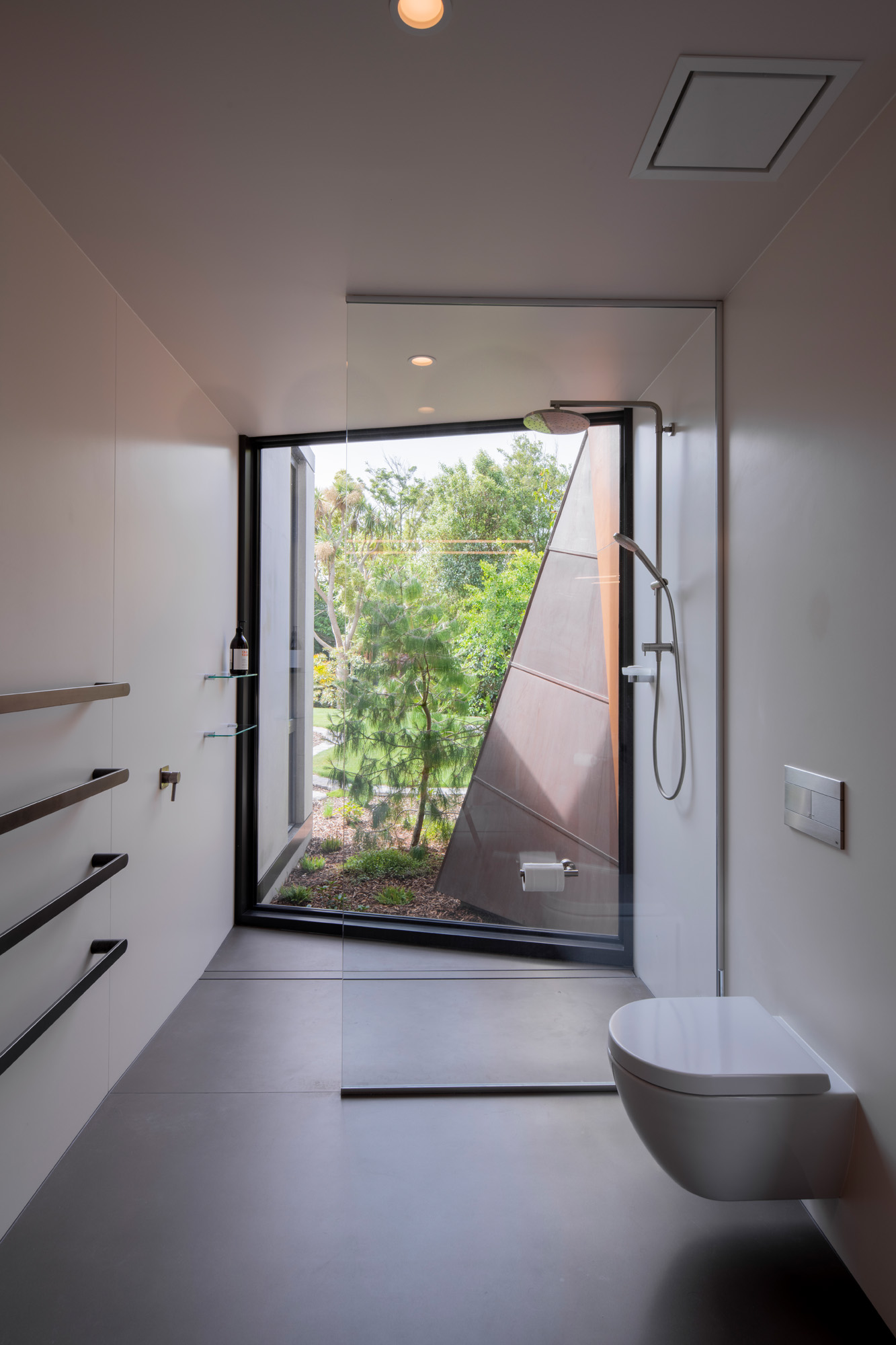 Inside, smooth concrete walls are a backdrop to art, but many windows break up the solidity to allow the foliage its stint in the spotlight. A narrow fern garden that occupies the sliver of garden between the public and private zones downstairs can be seen from the scullery; there’s a strategically placed ‘modesty palm’ for when the owners are having a shower, and a cut-away window in the living area frames a crazy-paved circular courtyard. Beyond this, mature rescue trees — “we didn’t lose a single one” — fringe the lawn near the stream.