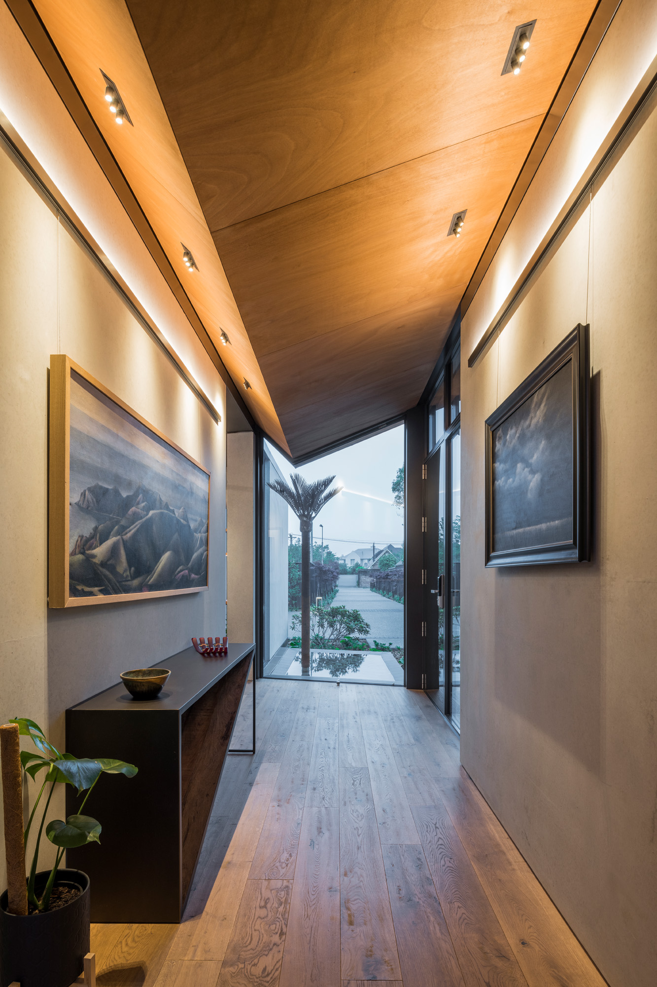 He particularly likes the way the roof beds into the landscape to the left of the entry and, in contrast, the way the inverted ridge that runs through the entry corridor seemingly floats in the air; the sculpted nikau palm downpipes collect the rainwater without connecting the form to the ground.