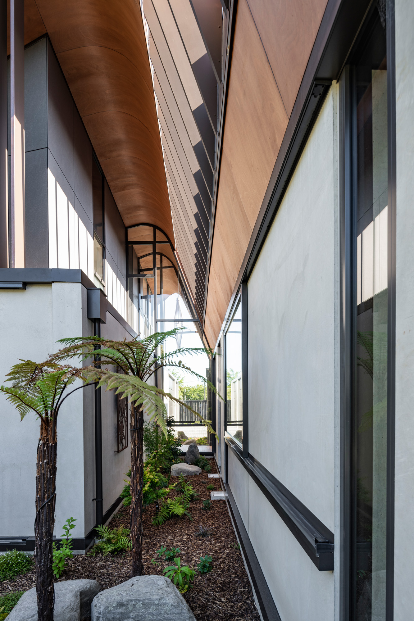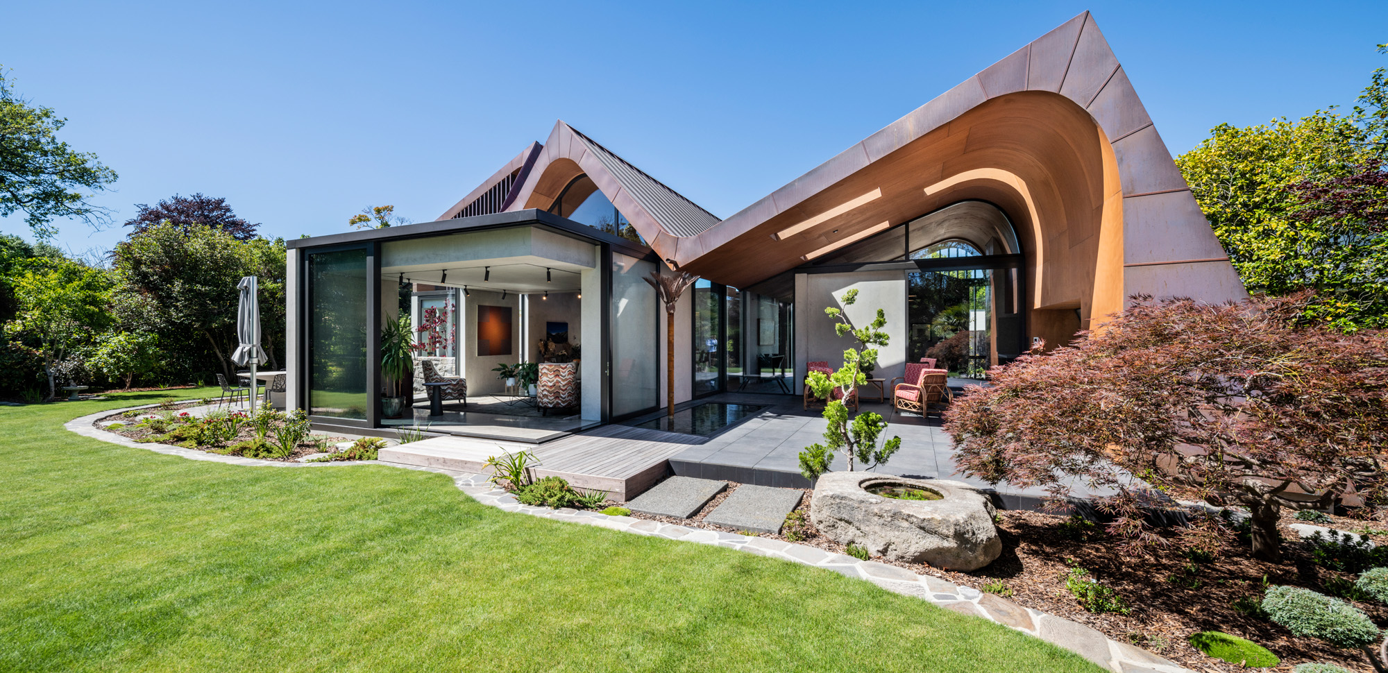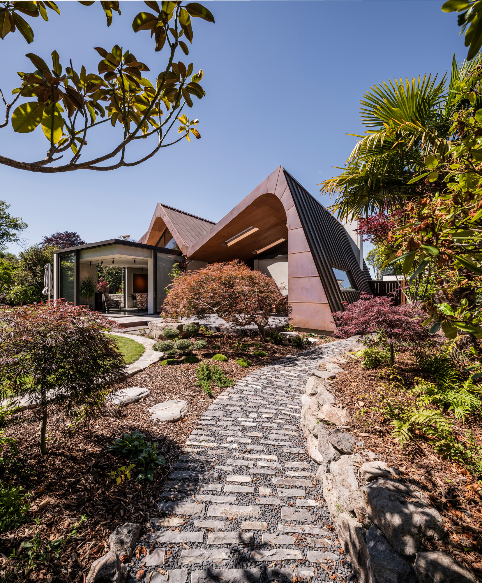 The entry is along an asymmetrical path where copper fins disguise the front door from the street. Once inside, however, mystery turns to transparency with glazed edges to push visual connection with the garden through the heart of the dwelling. The owners rescued mature trees from their former home, rendered unlivable by the earthquake. They brought with them rhododendrons and azaleas, a magnolia grandiflora and a ginkgo tree, maples and fan palms that give the landscaping a Japanese flavour.