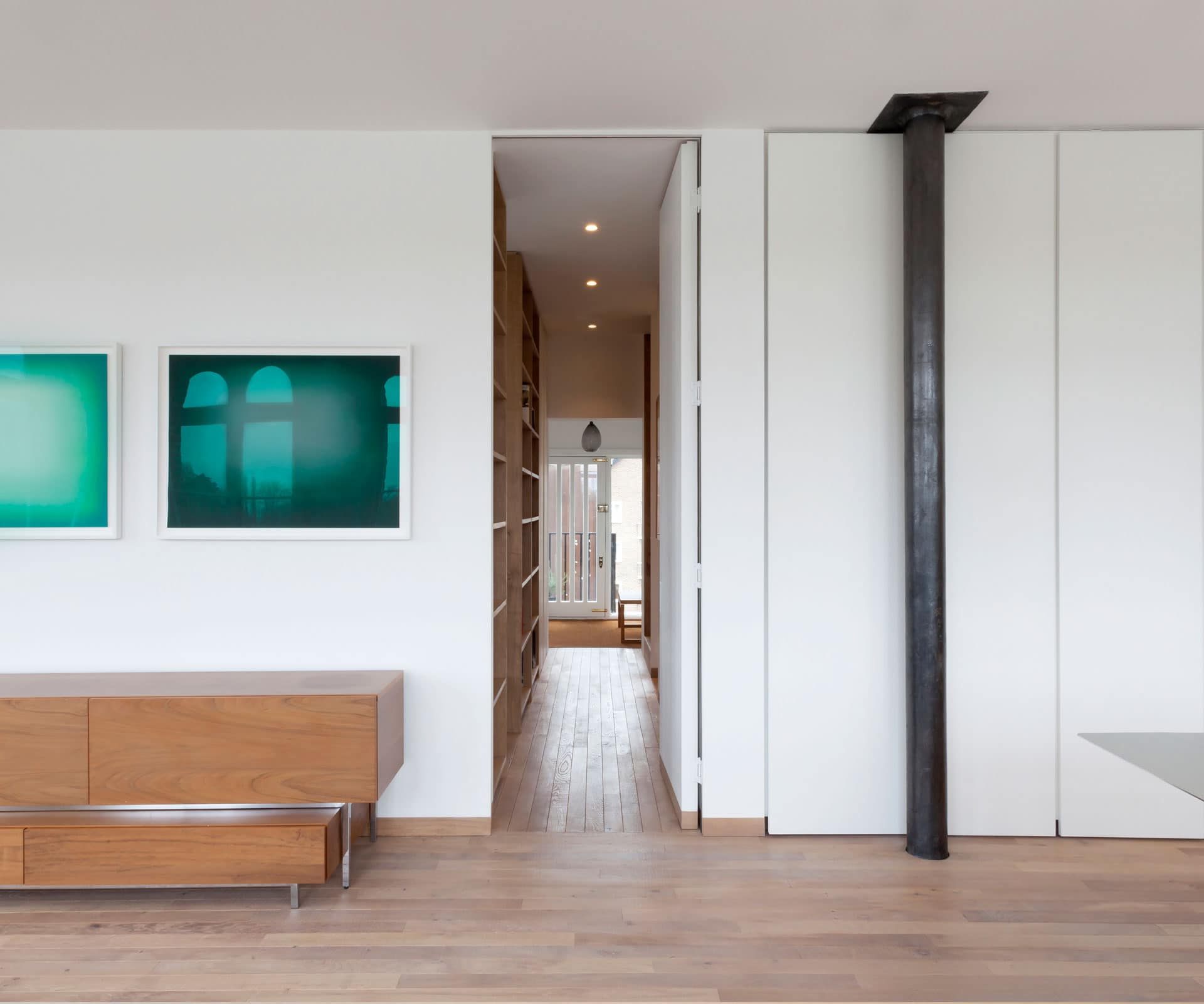Reid moved the main bedroom to the side and installed an internal hallway with bedrooms and bathrooms coming off it. The corridor leads through to the main living area, which opens out across the entire riverside façade of the building. It was a simple and straightforward decision. “It has transformed the way we live,” says Southan.