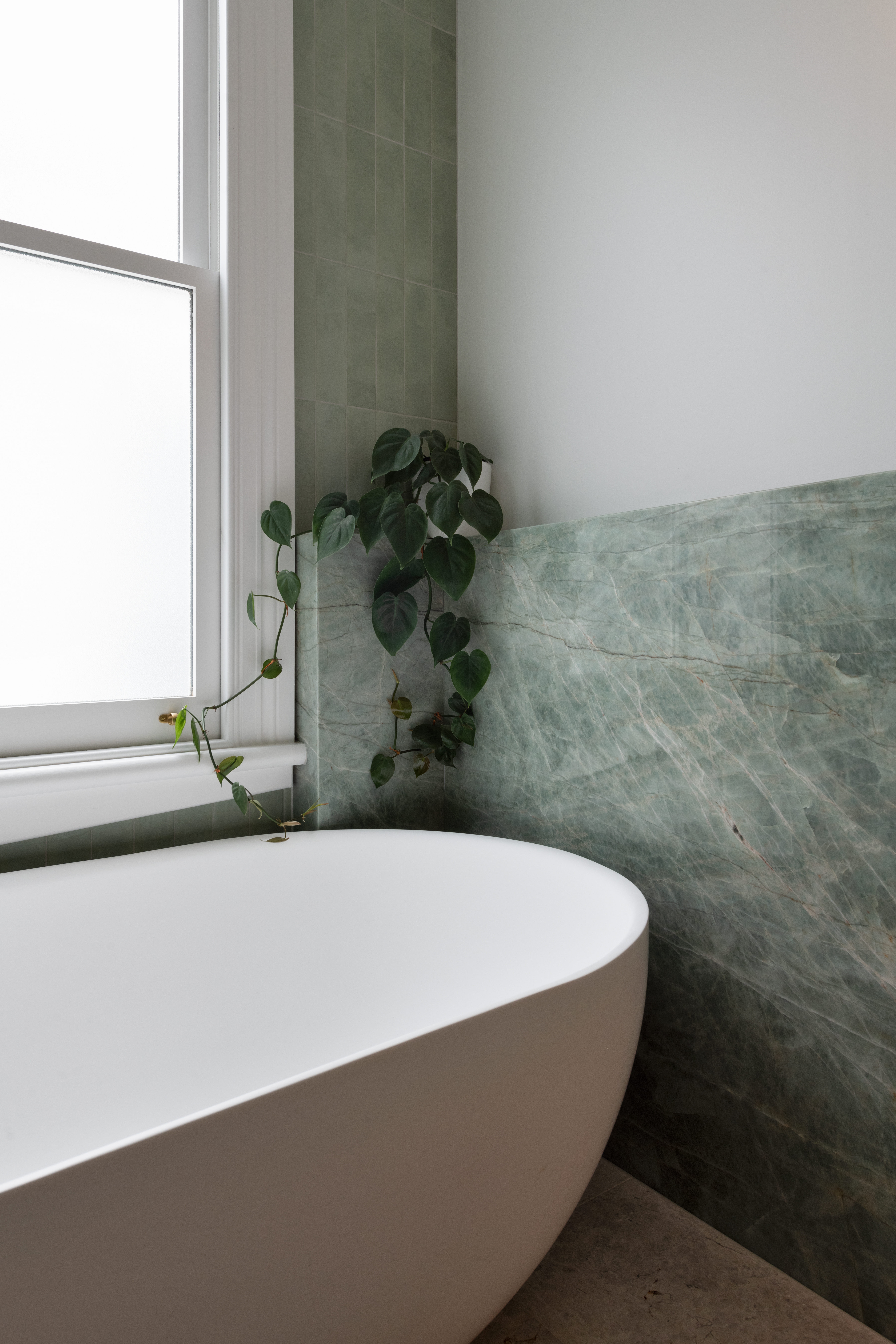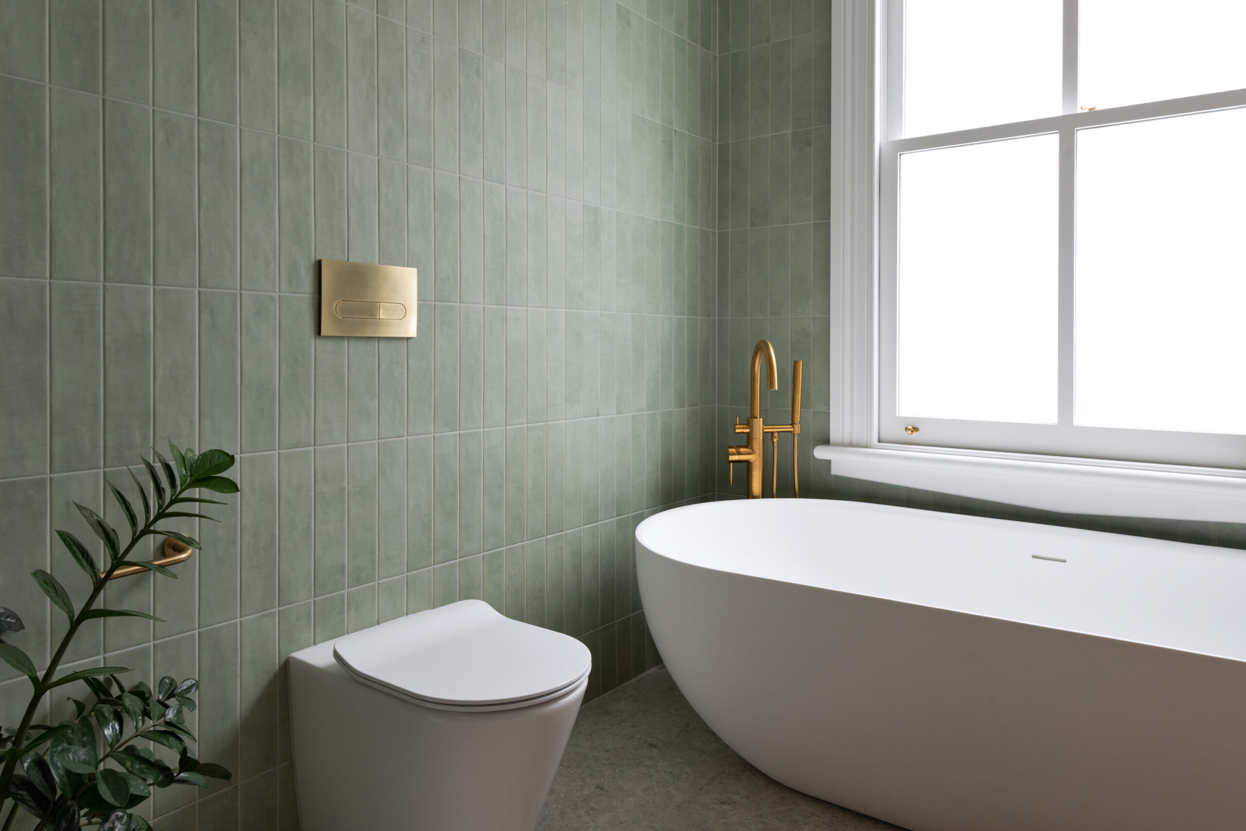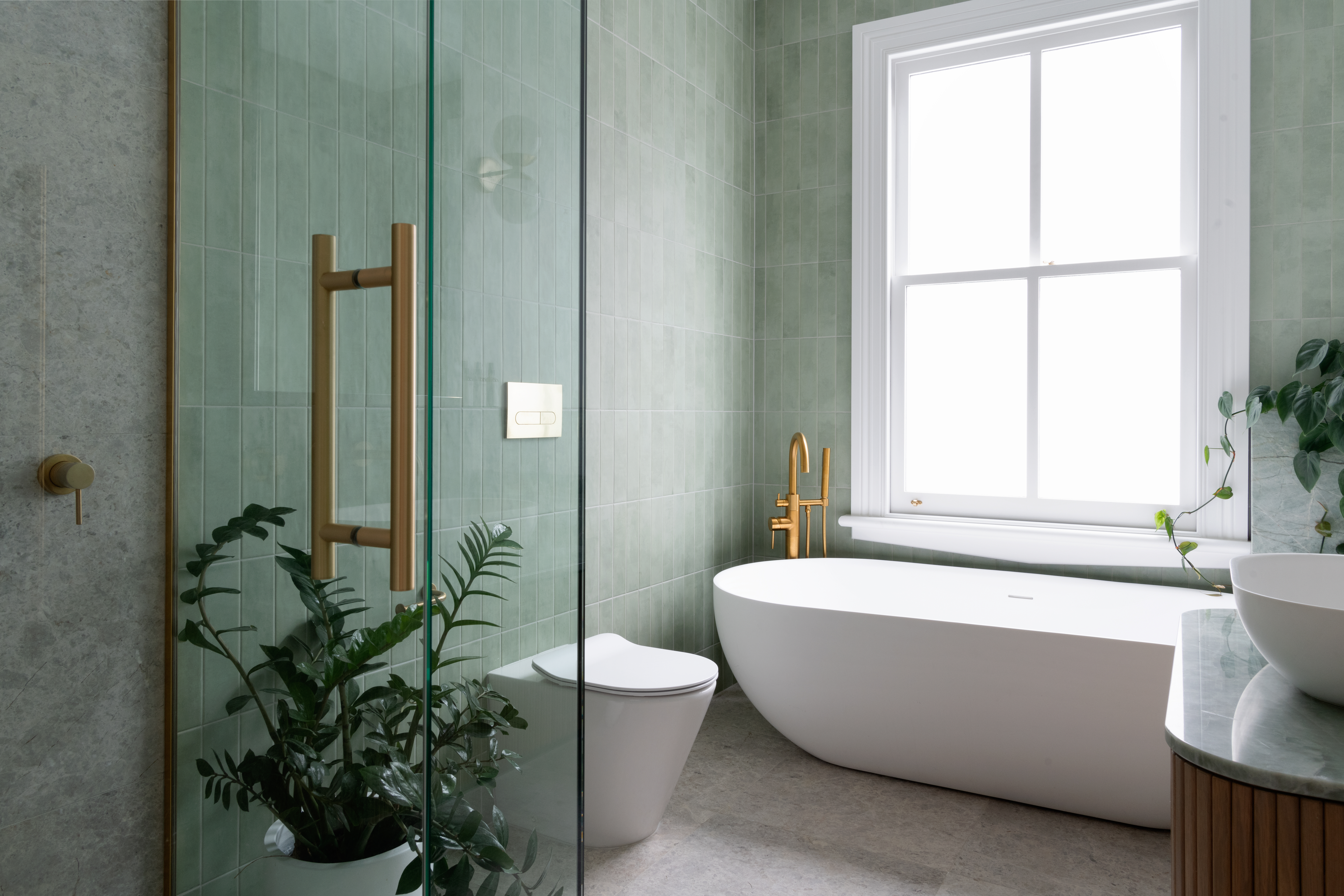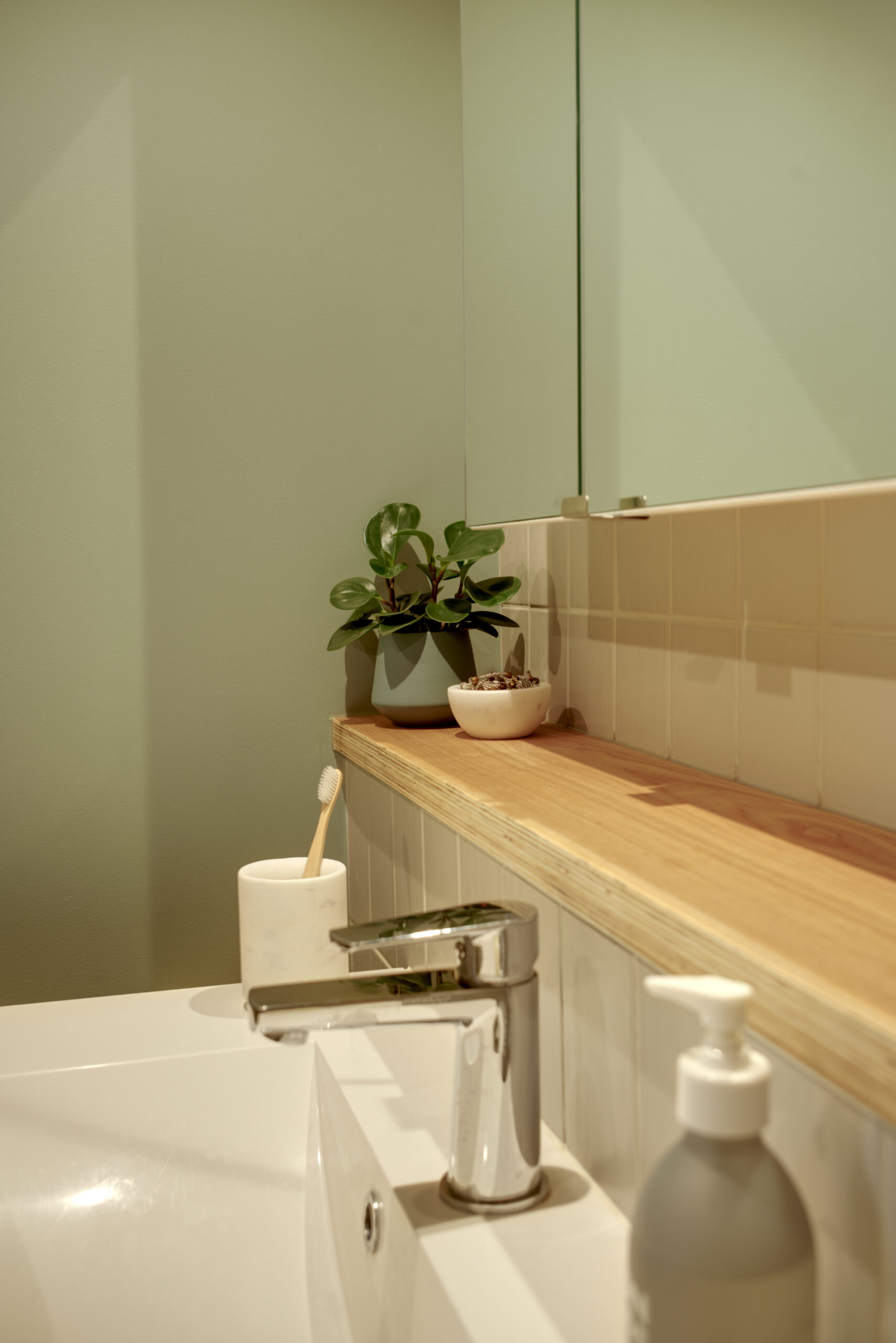 A delightfully planned bathroom with clever colour zoning, an inherent sense of playfulness, freshness, biophilia, and joy. Beautiful use of colour and vitality.