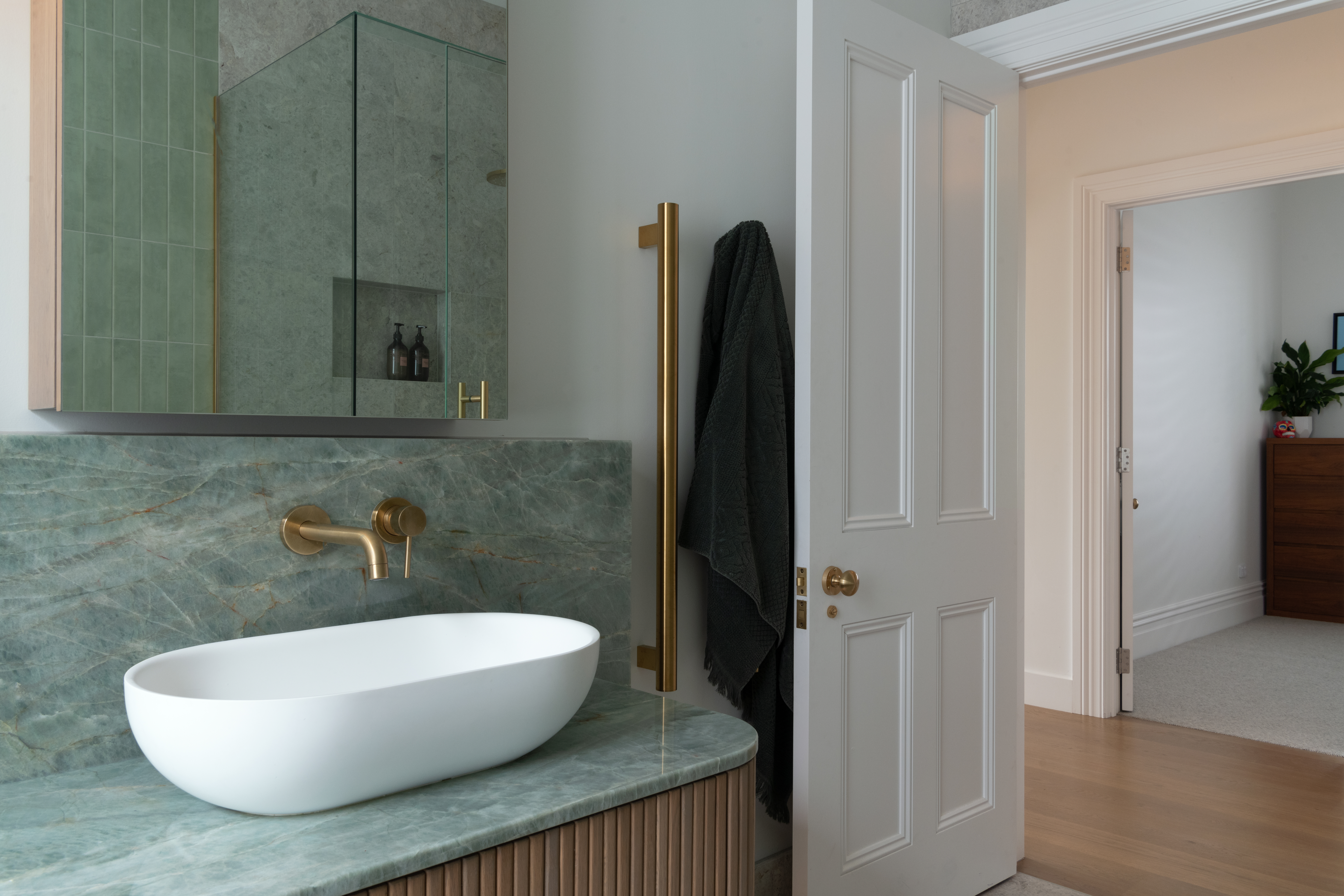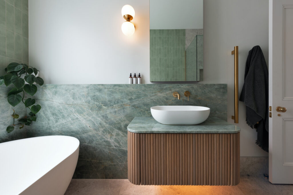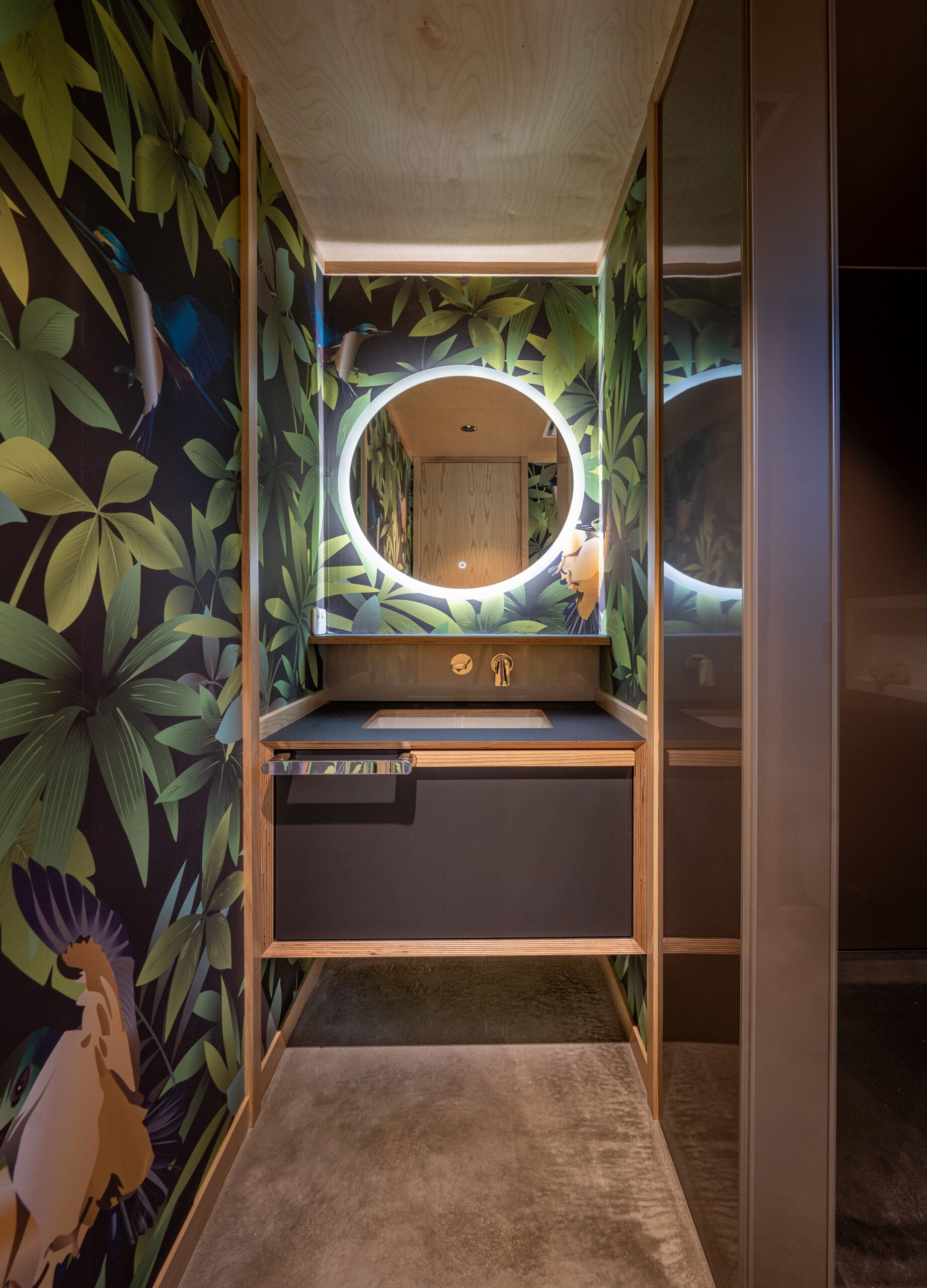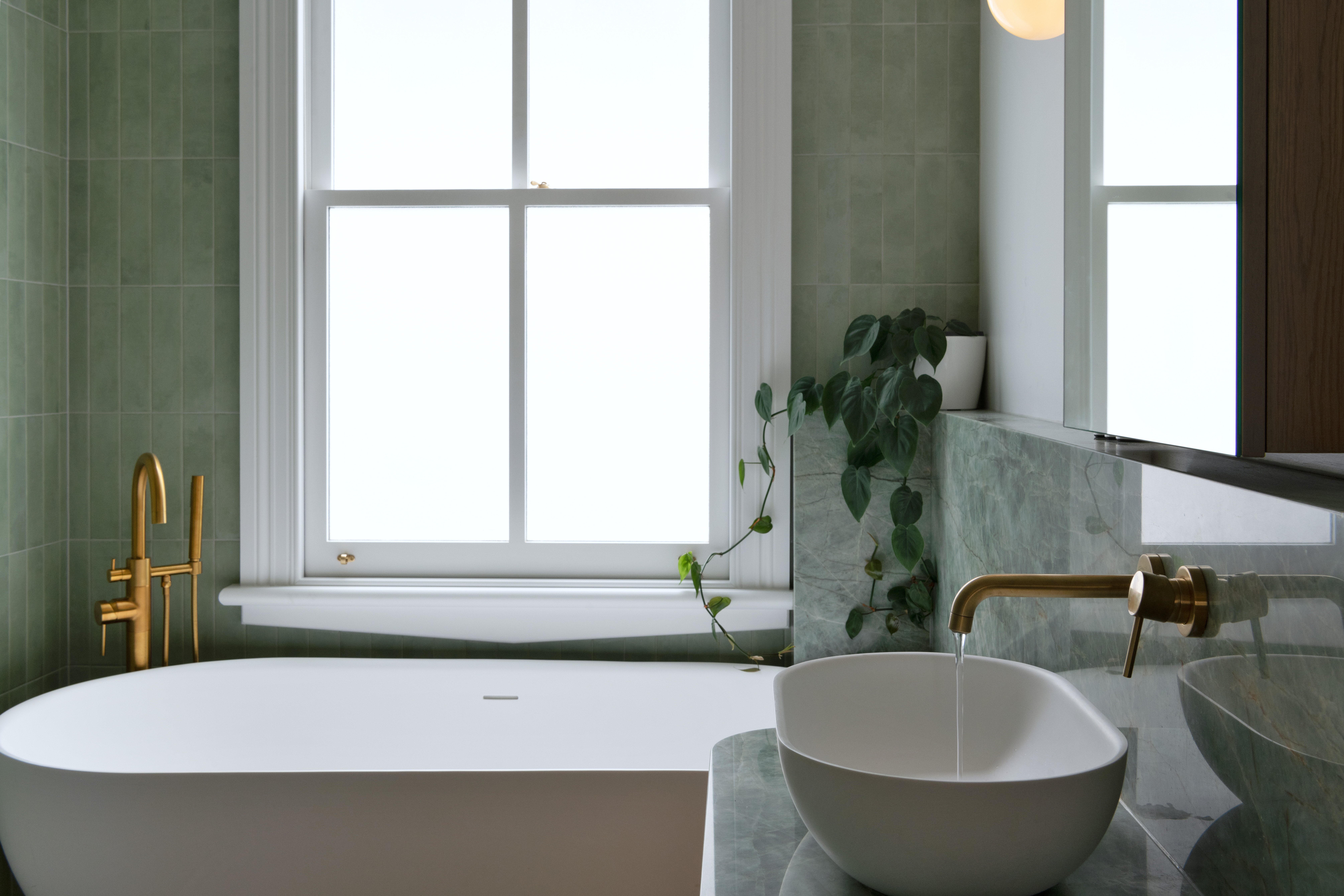 A delightfully planned bathroom with clever colour zoning, an inherent sense of playfulness, freshness, biophilia, and joy. Beautiful use of colour and vitality.