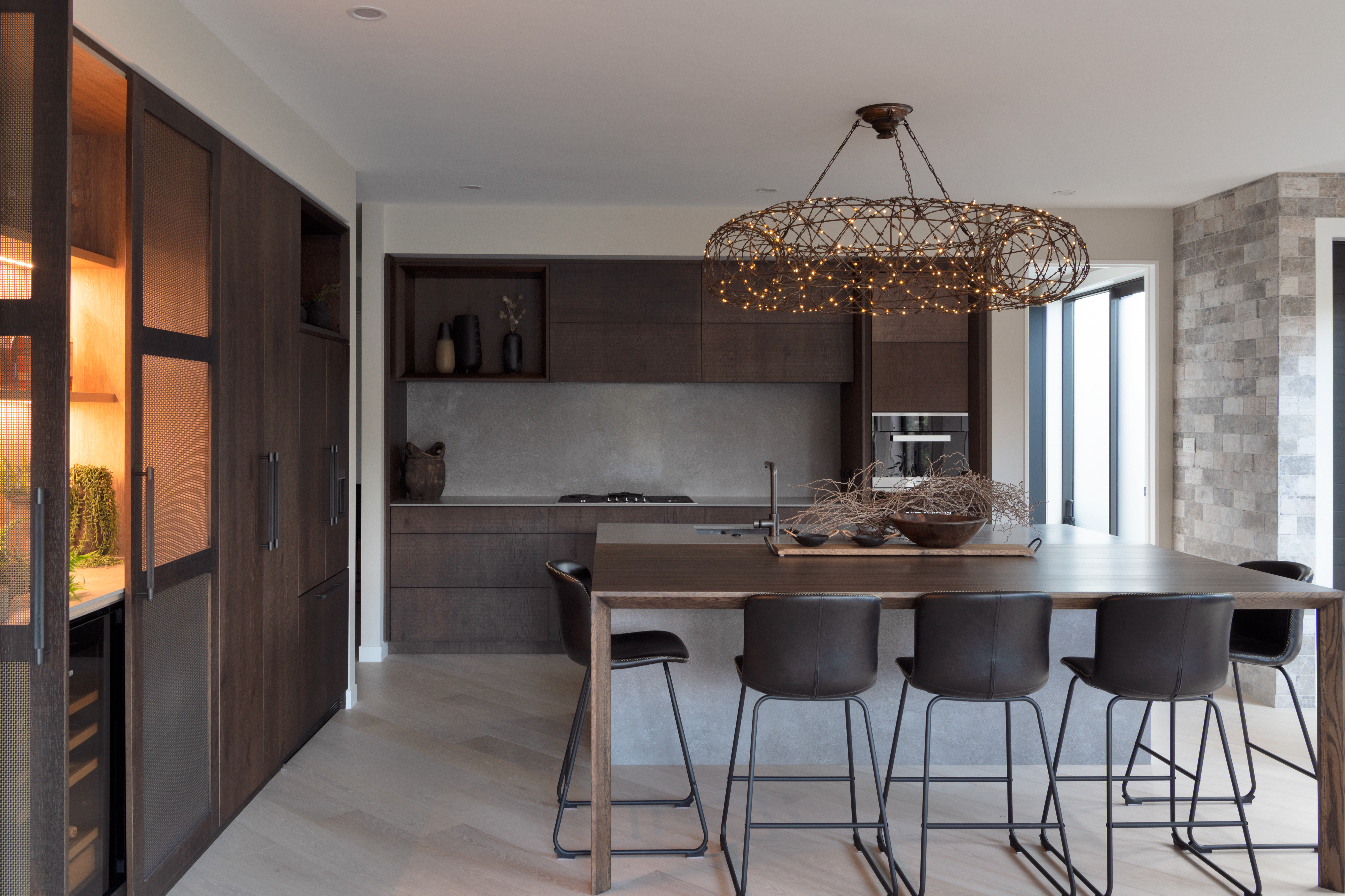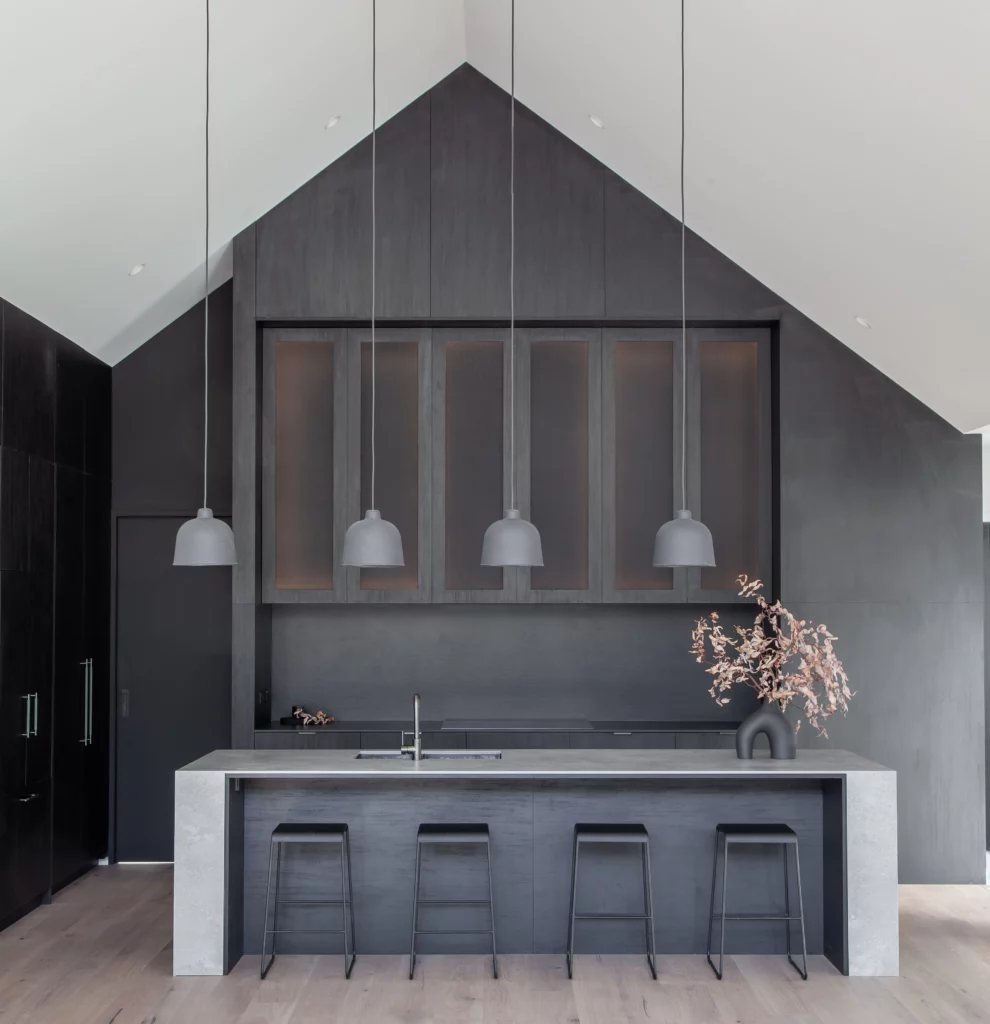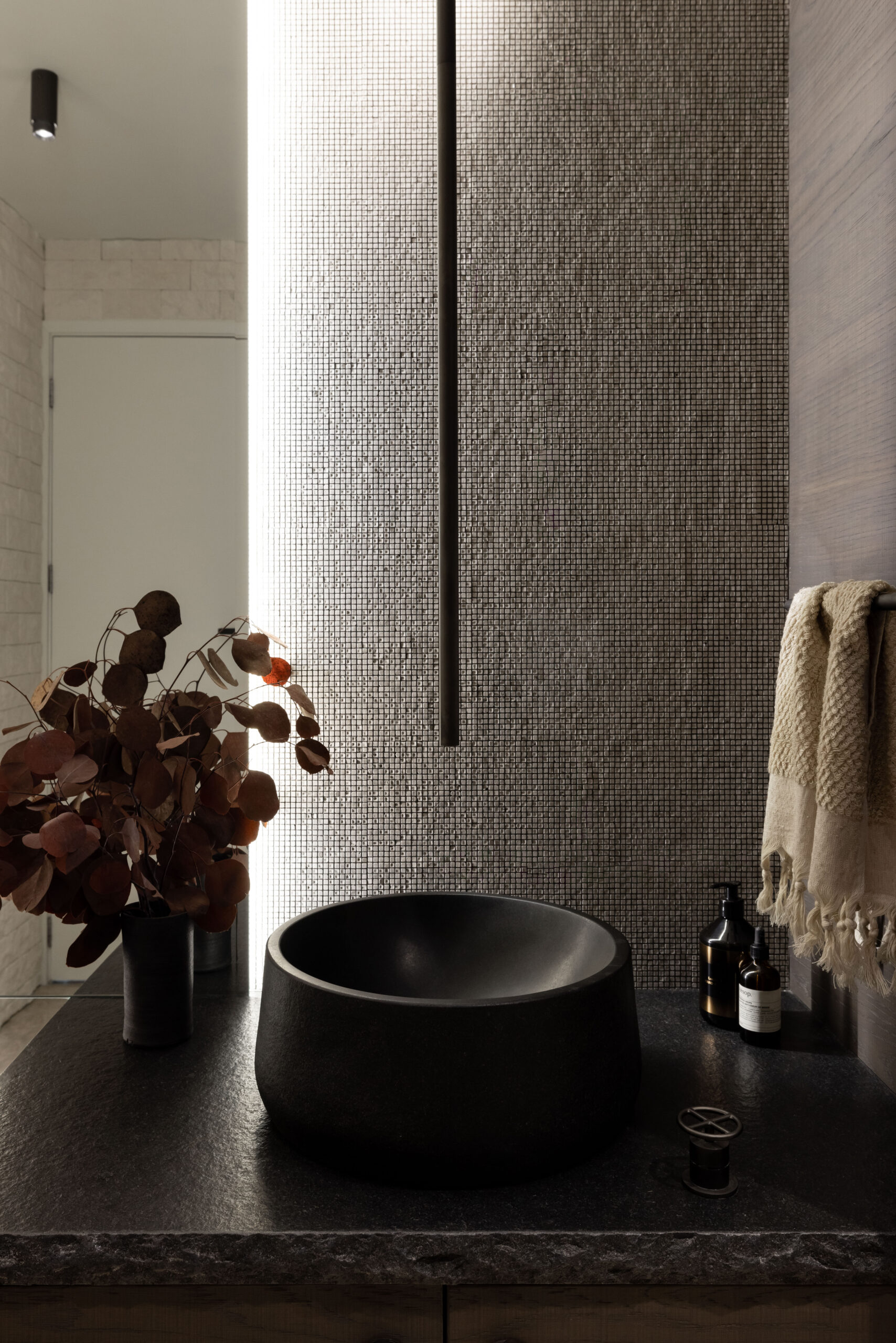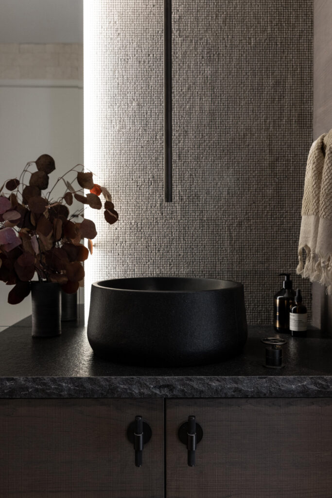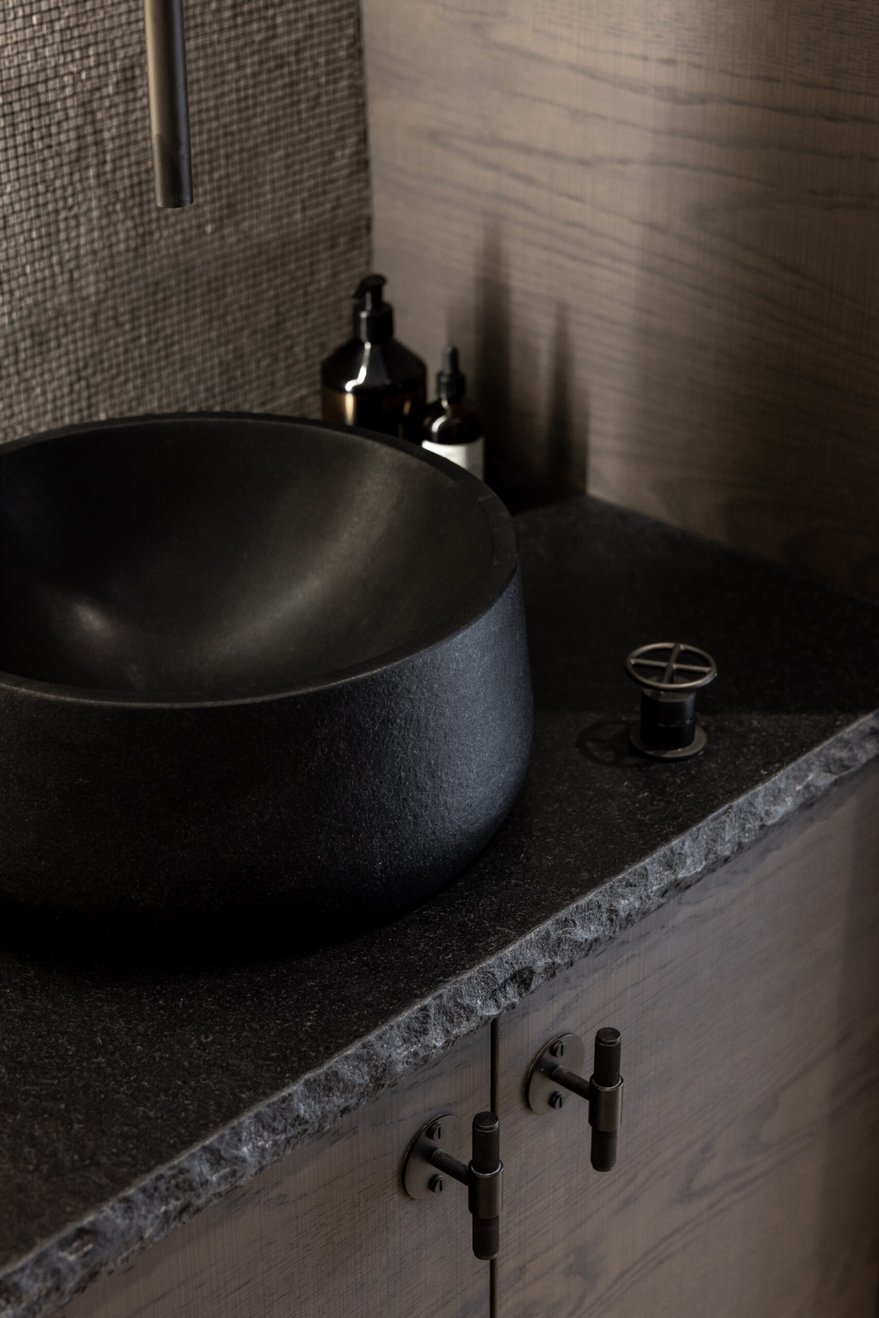 Urban sophistication and rusticity are accomplished here via material palette and a deft balance between the two polarities. Industrial elements are paired with organic materials. Smooth, rectilinear concrete forms are juxtaposed with knotty and expressive timbers and the almost artisanal nature of woven fibres — on a handmade light pendant and glass mesh detailing. Everything — from dark brass strips, handles, taps, and even visible stitching on seats — works together and in sync towards a single idea: urban edge with a country undertone. Great attention to detail, timeless colour palette, and a stylish collection of finishes.