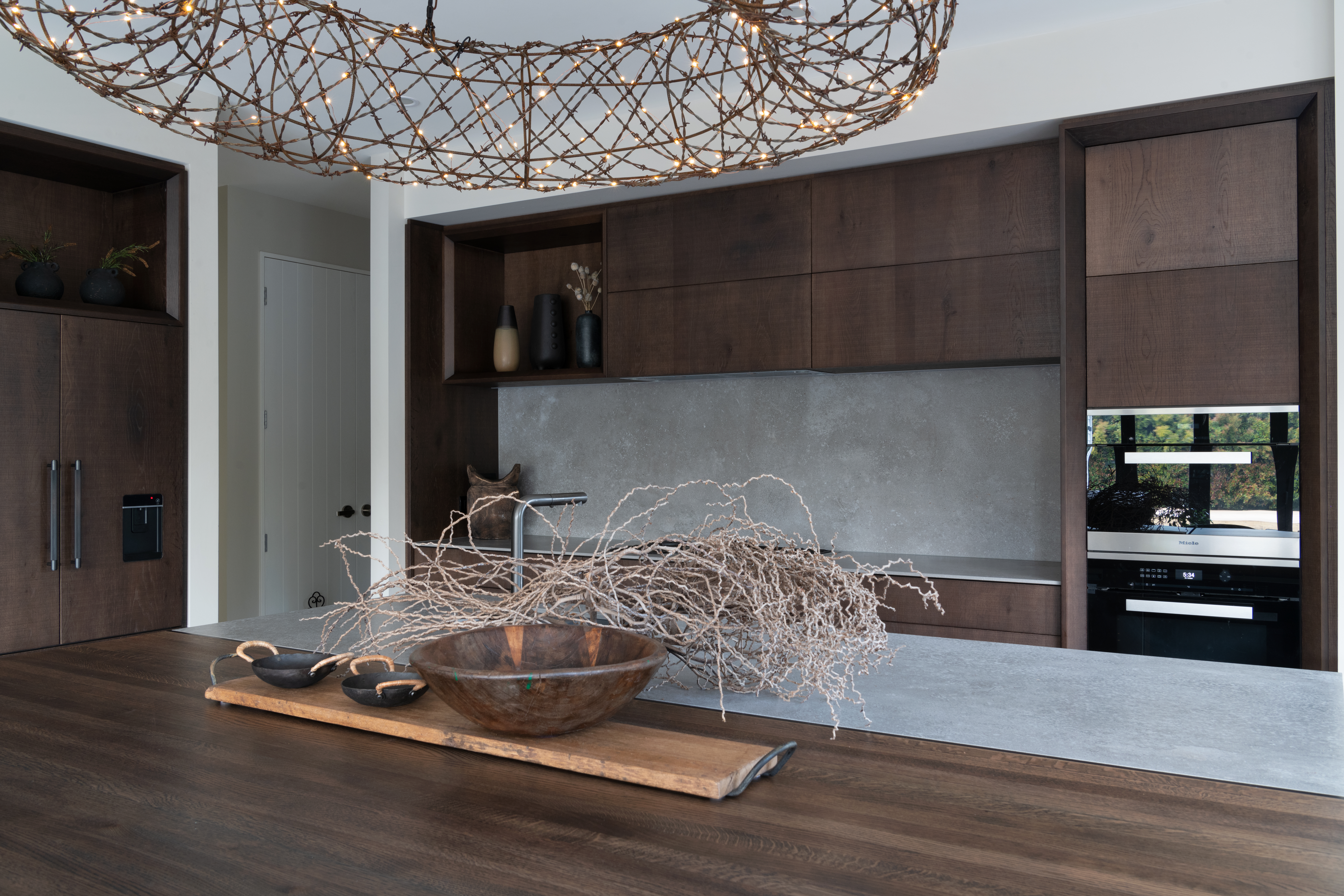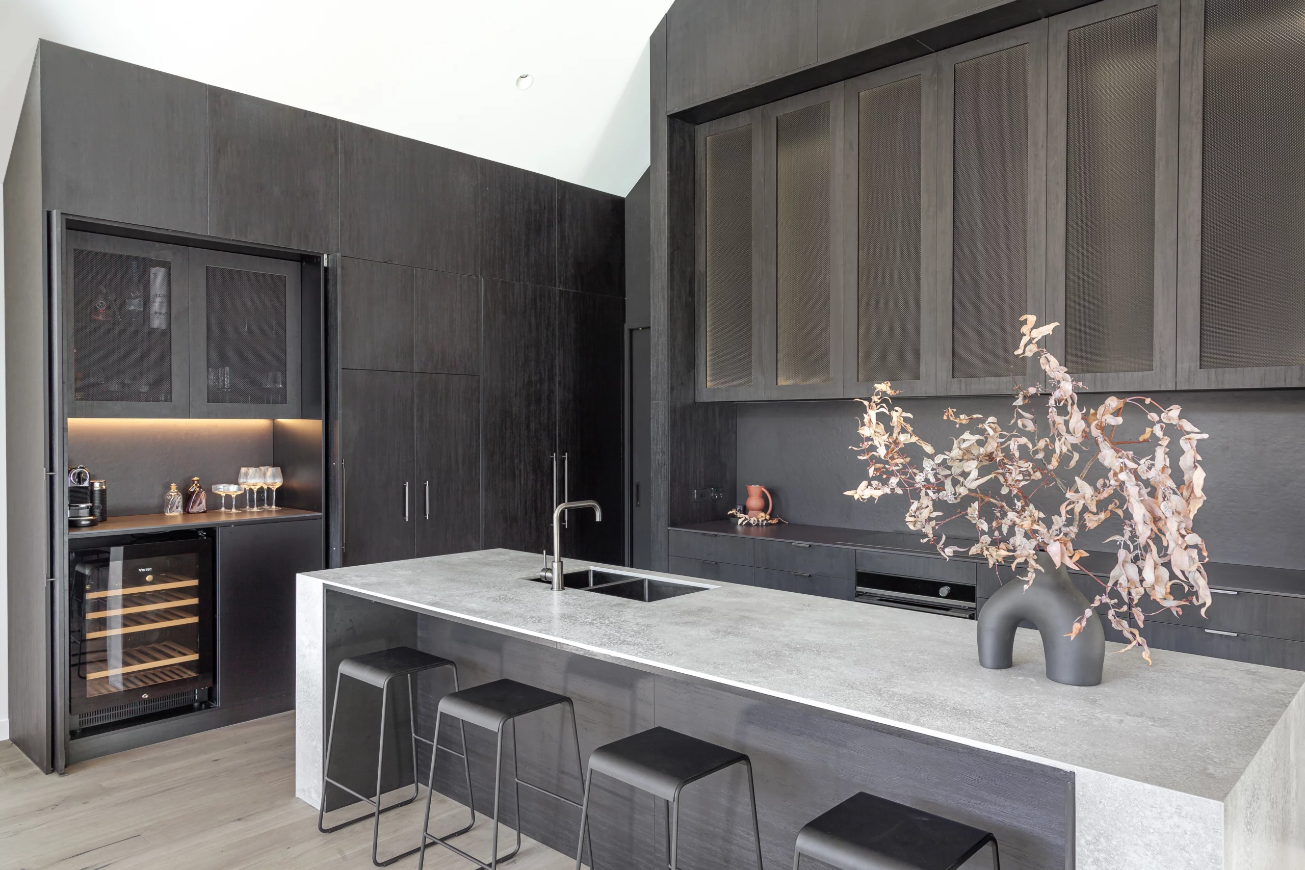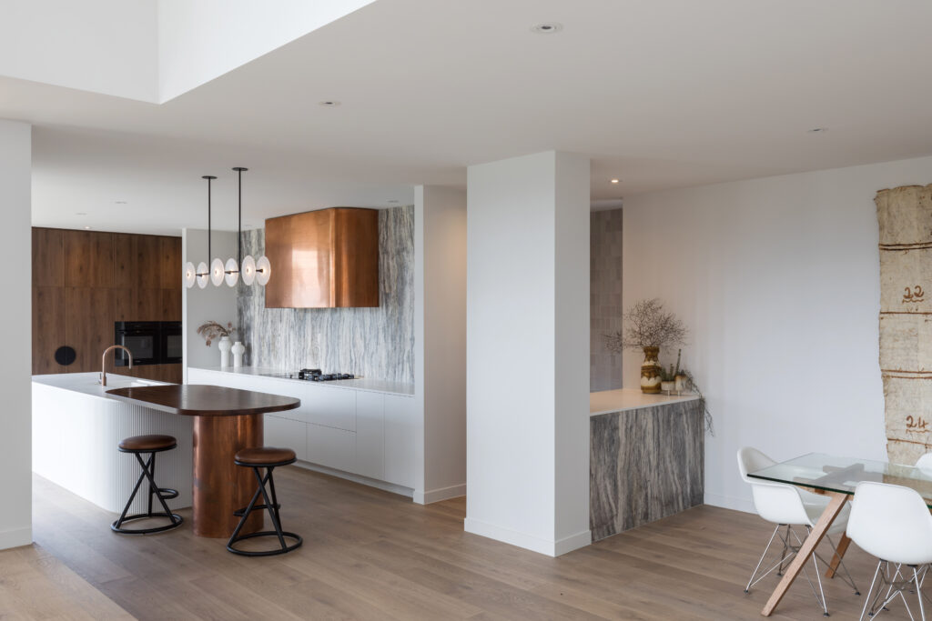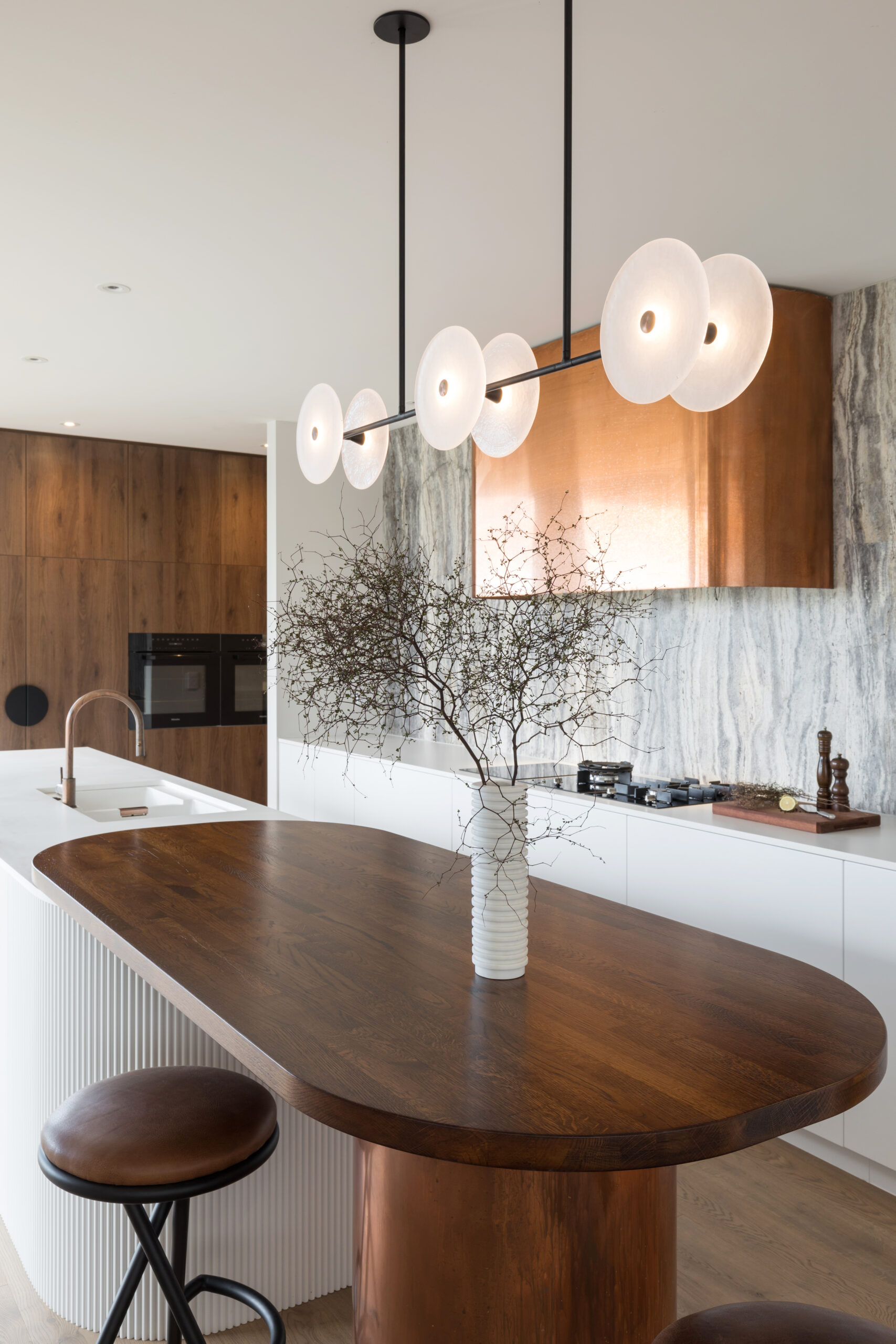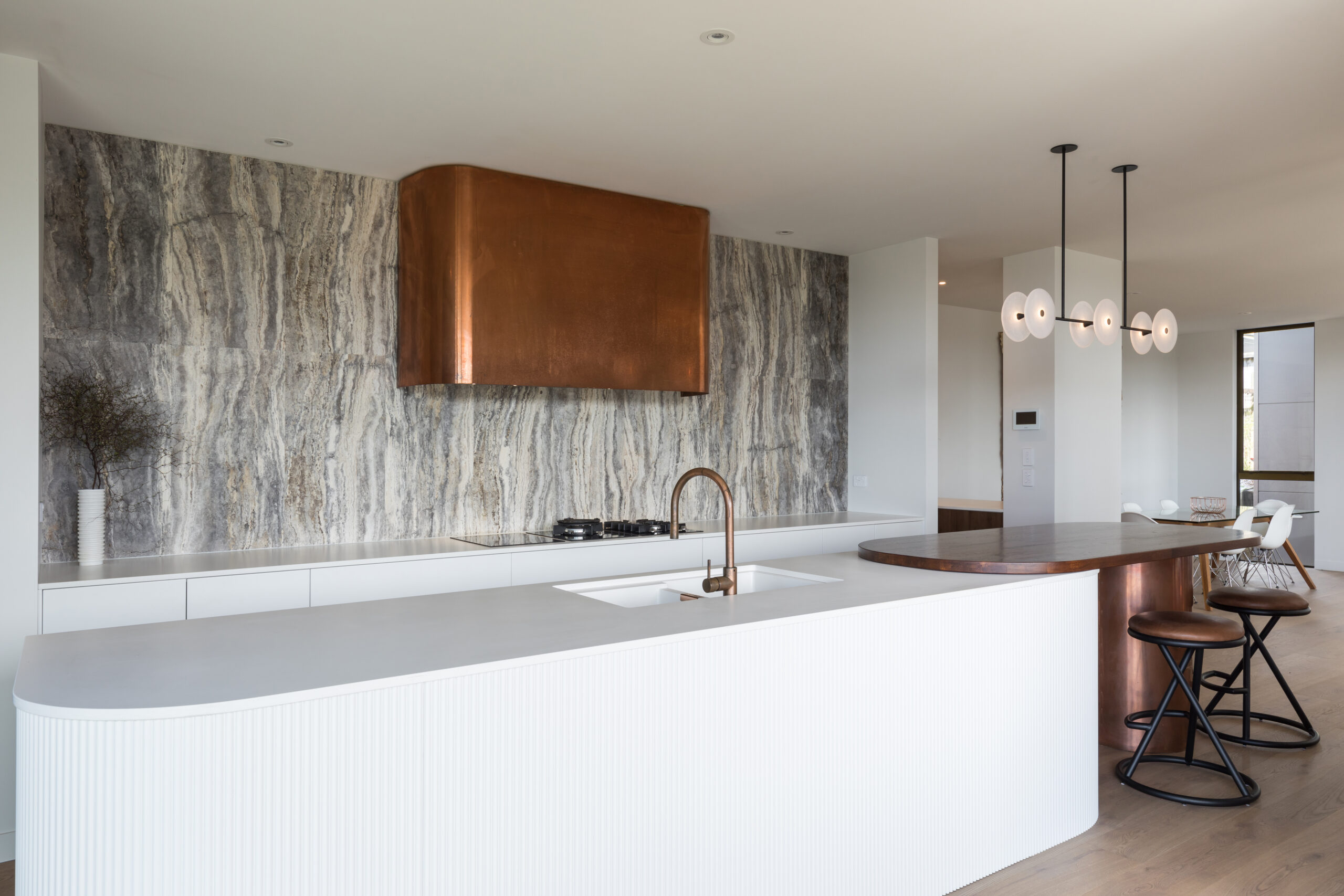 Urban sophistication and rusticity are accomplished here via material palette and a deft balance between the two polarities. Industrial elements are paired with organic materials. Smooth, rectilinear concrete forms are juxtaposed with knotty and expressive timbers and the almost artisanal nature of woven fibres — on a handmade light pendant and glass mesh detailing. Everything — from dark brass strips, handles, taps, and even visible stitching on seats — works together and in sync towards a single idea: urban edge with a country undertone. Great attention to detail, timeless colour palette, and a stylish collection of finishes.