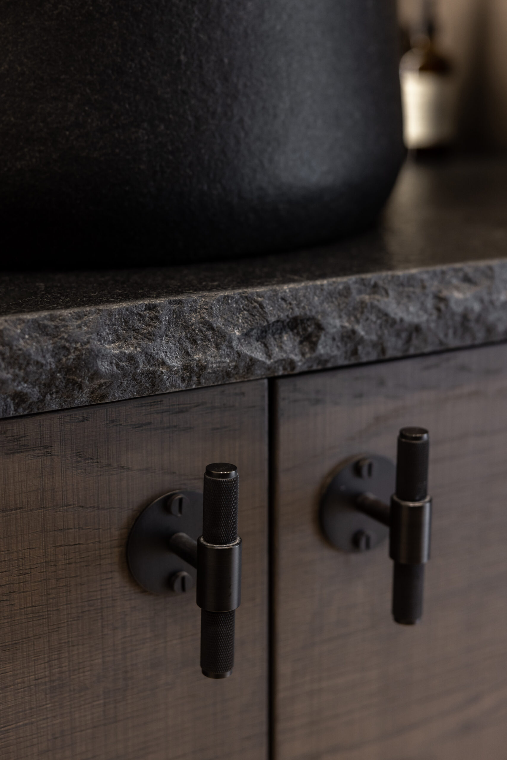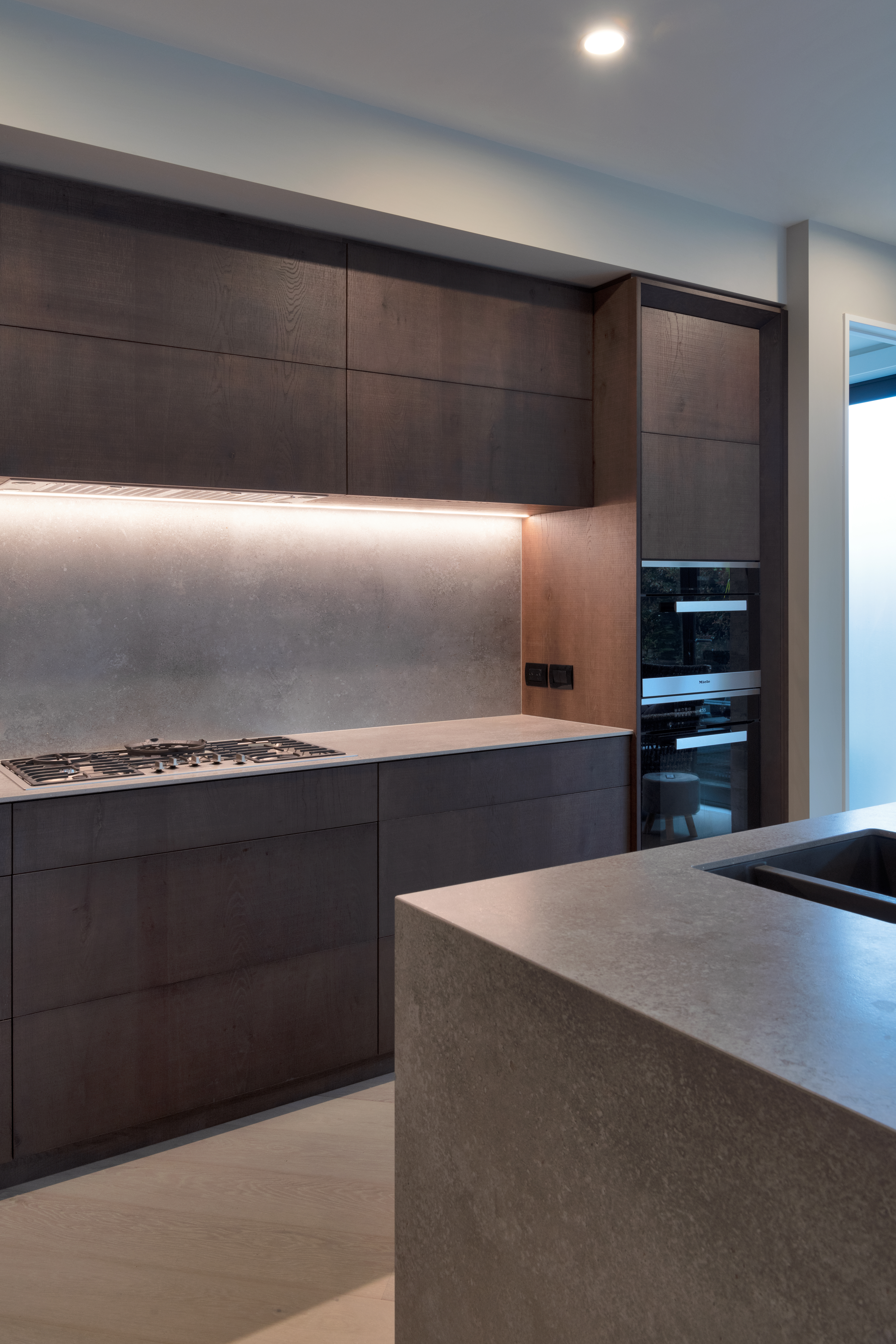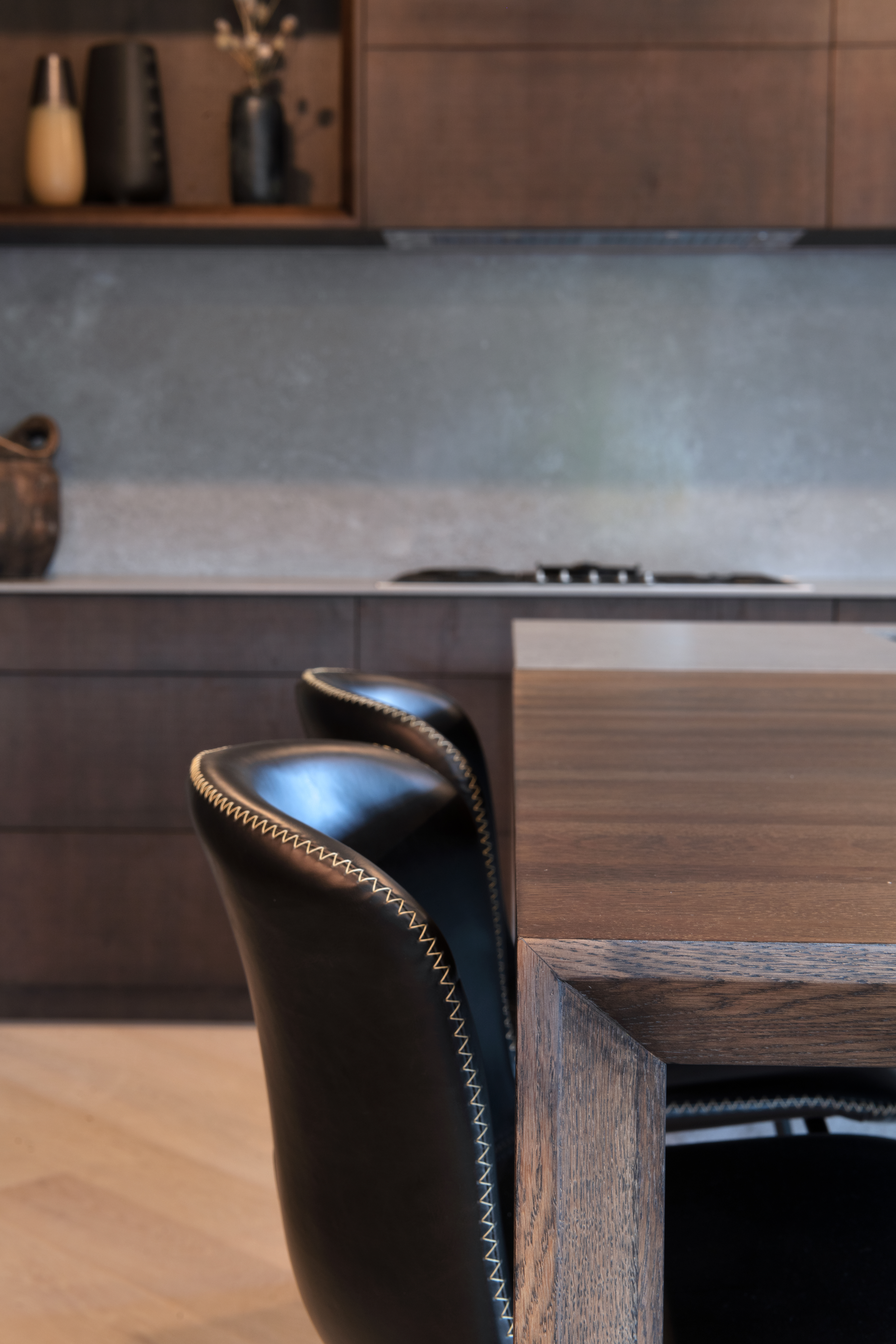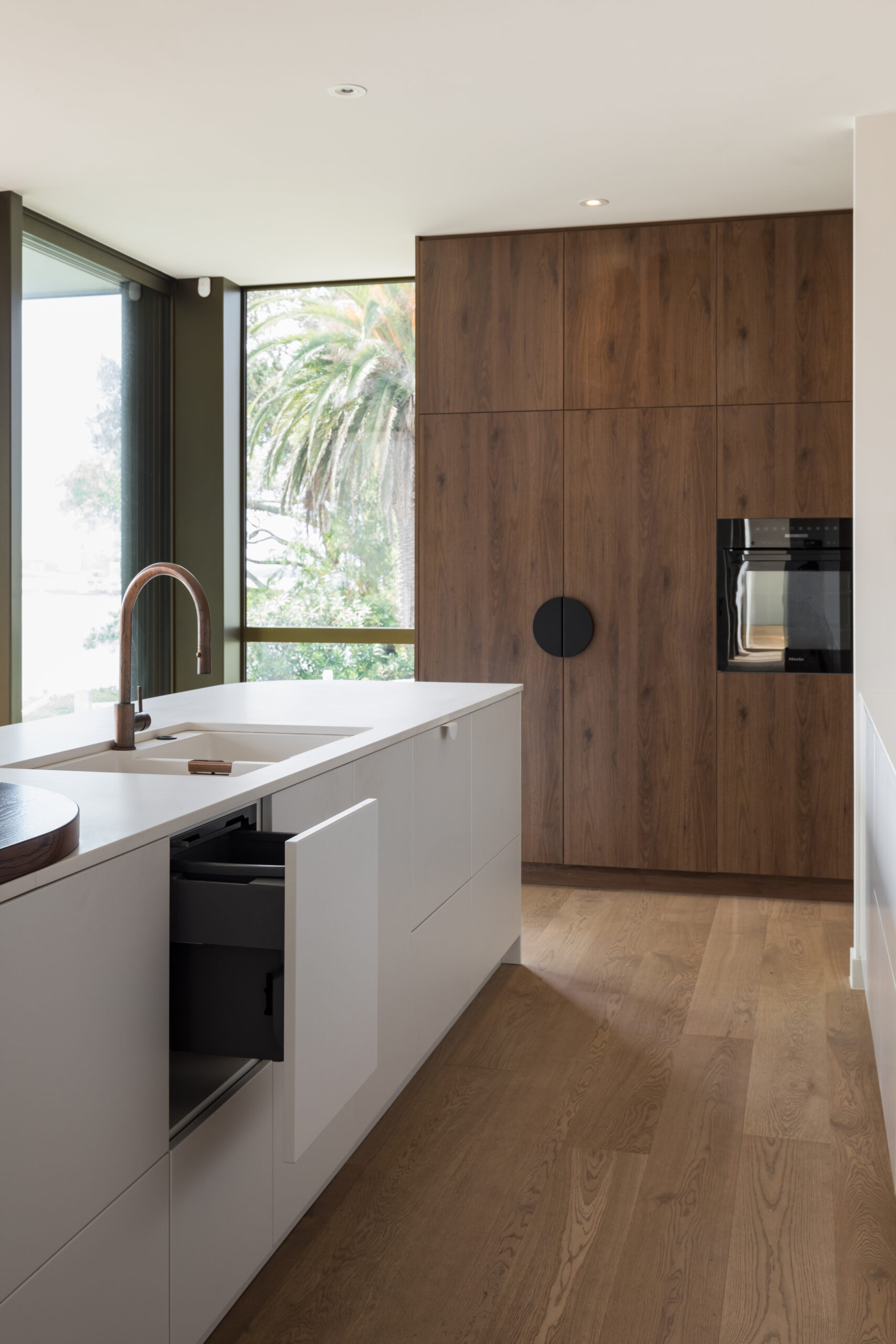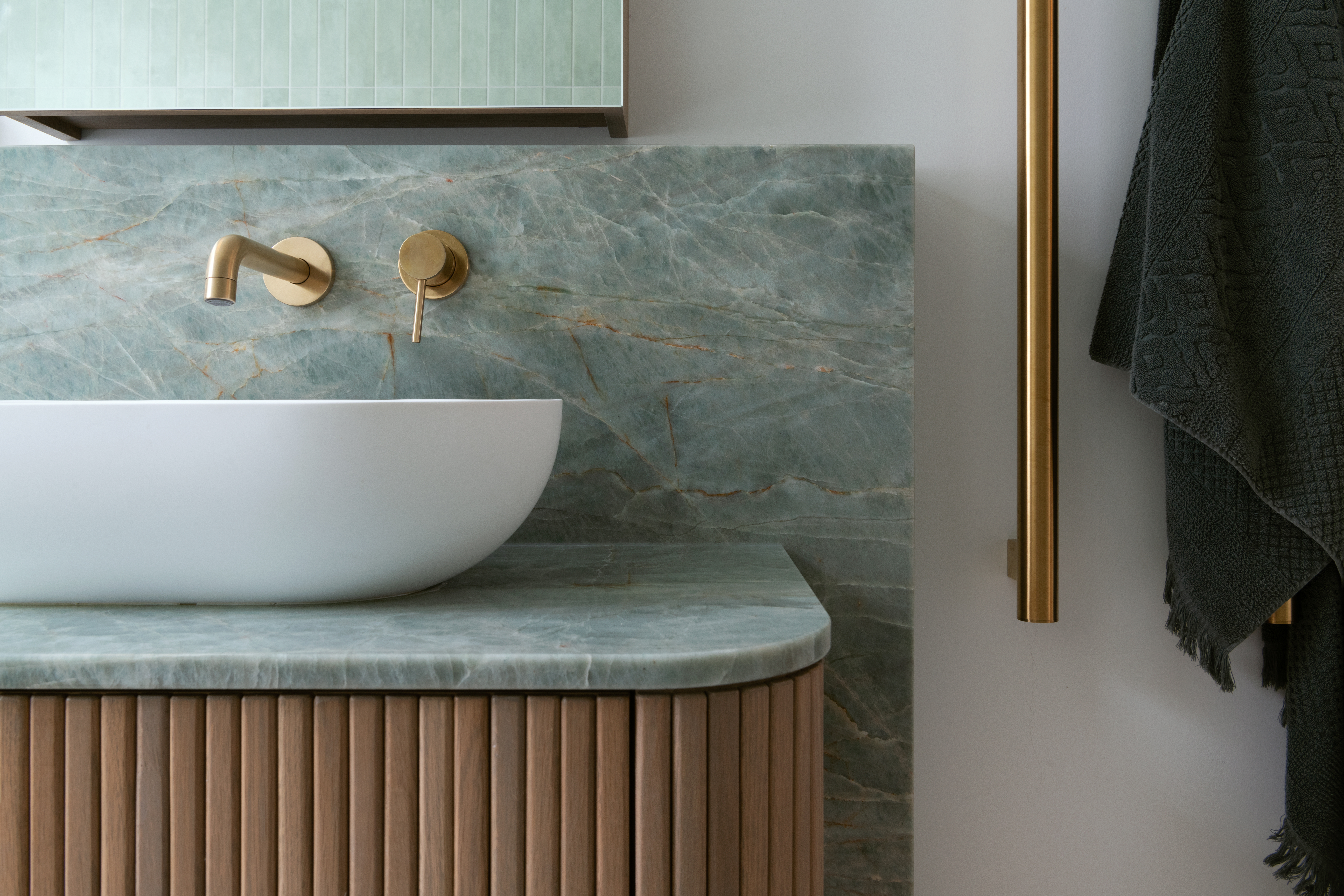 Urban sophistication and rusticity are accomplished here via material palette and a deft balance between the two polarities. Industrial elements are paired with organic materials. Smooth, rectilinear concrete forms are juxtaposed with knotty and expressive timbers and the almost artisanal nature of woven fibres — on a handmade light pendant and glass mesh detailing. Everything — from dark brass strips, handles, taps, and even visible stitching on seats — works together and in sync towards a single idea: urban edge with a country undertone. Great attention to detail, timeless colour palette, and a stylish collection of finishes.