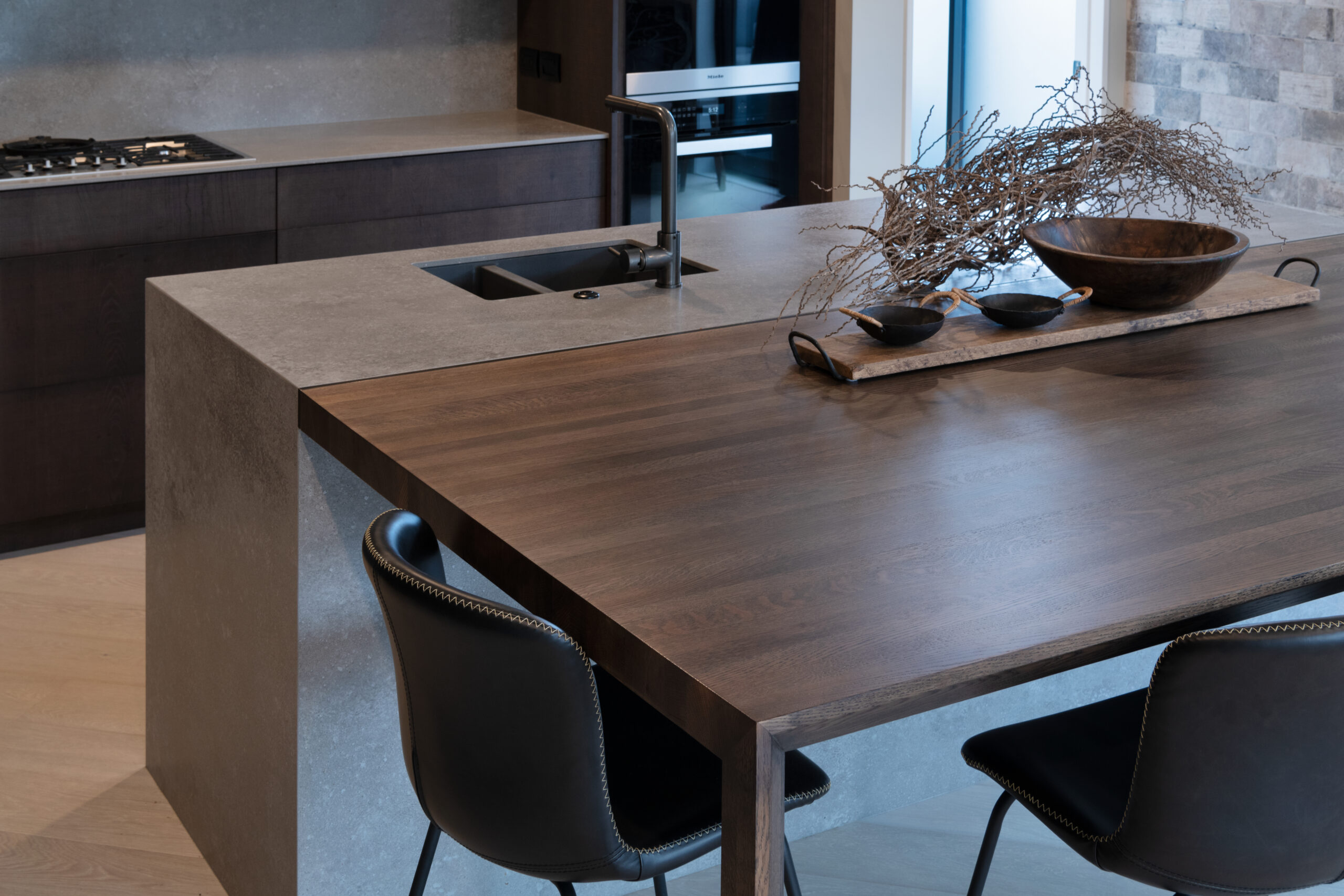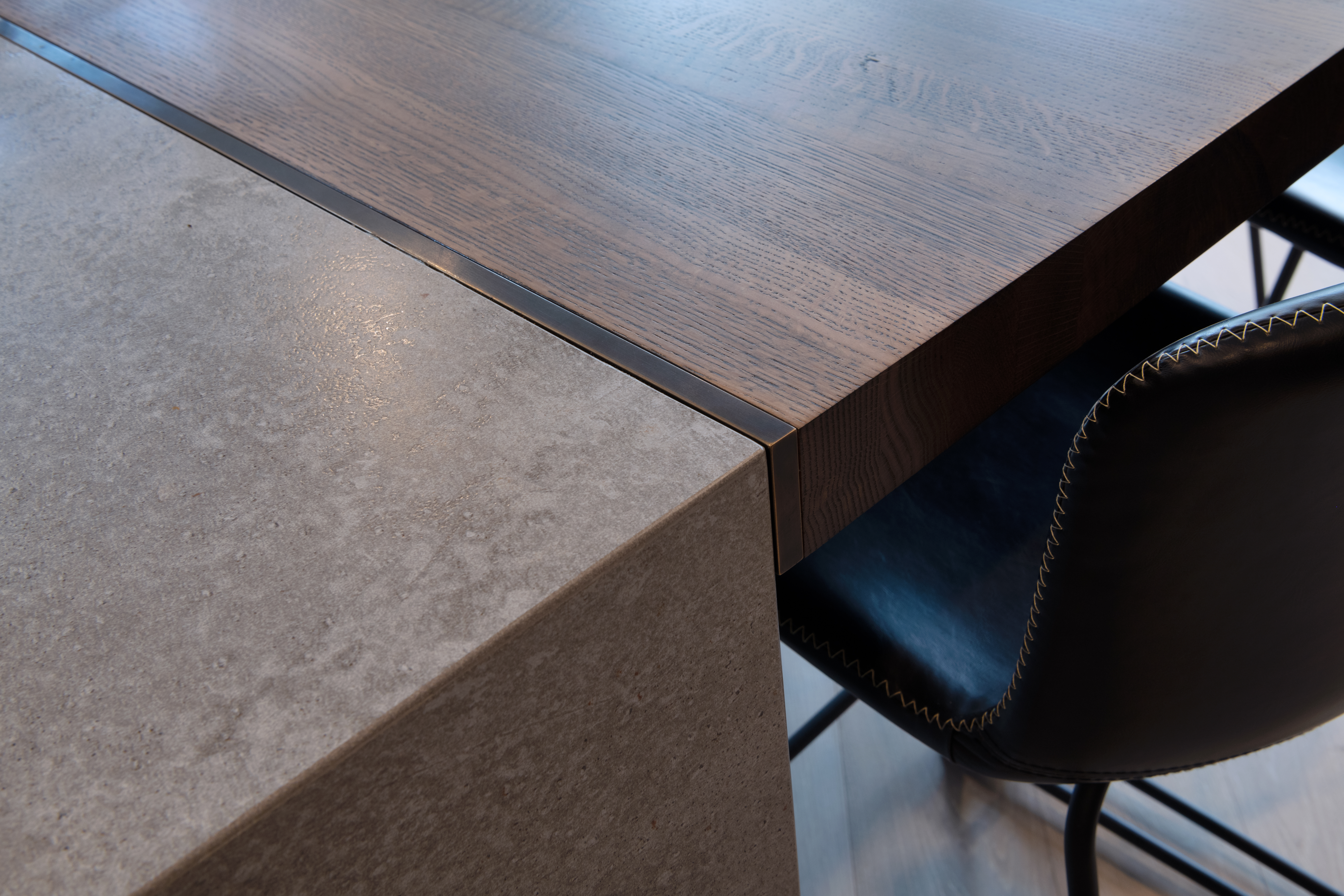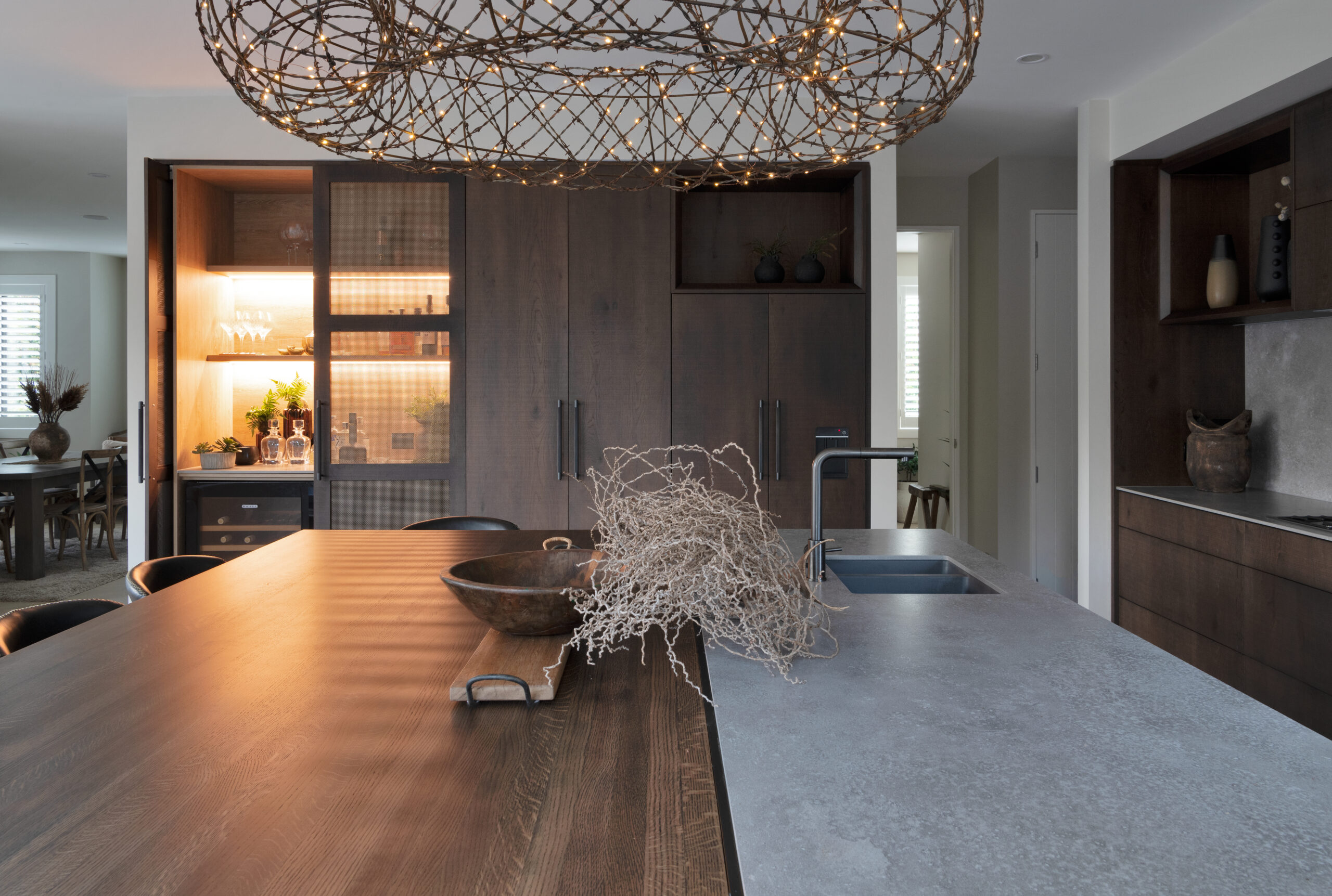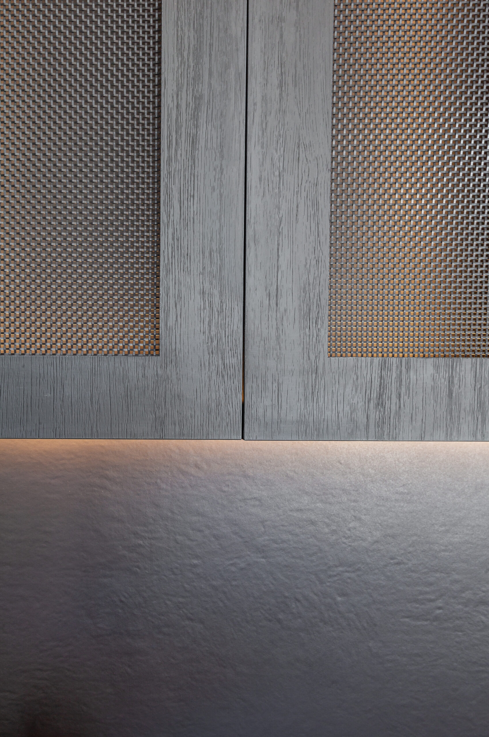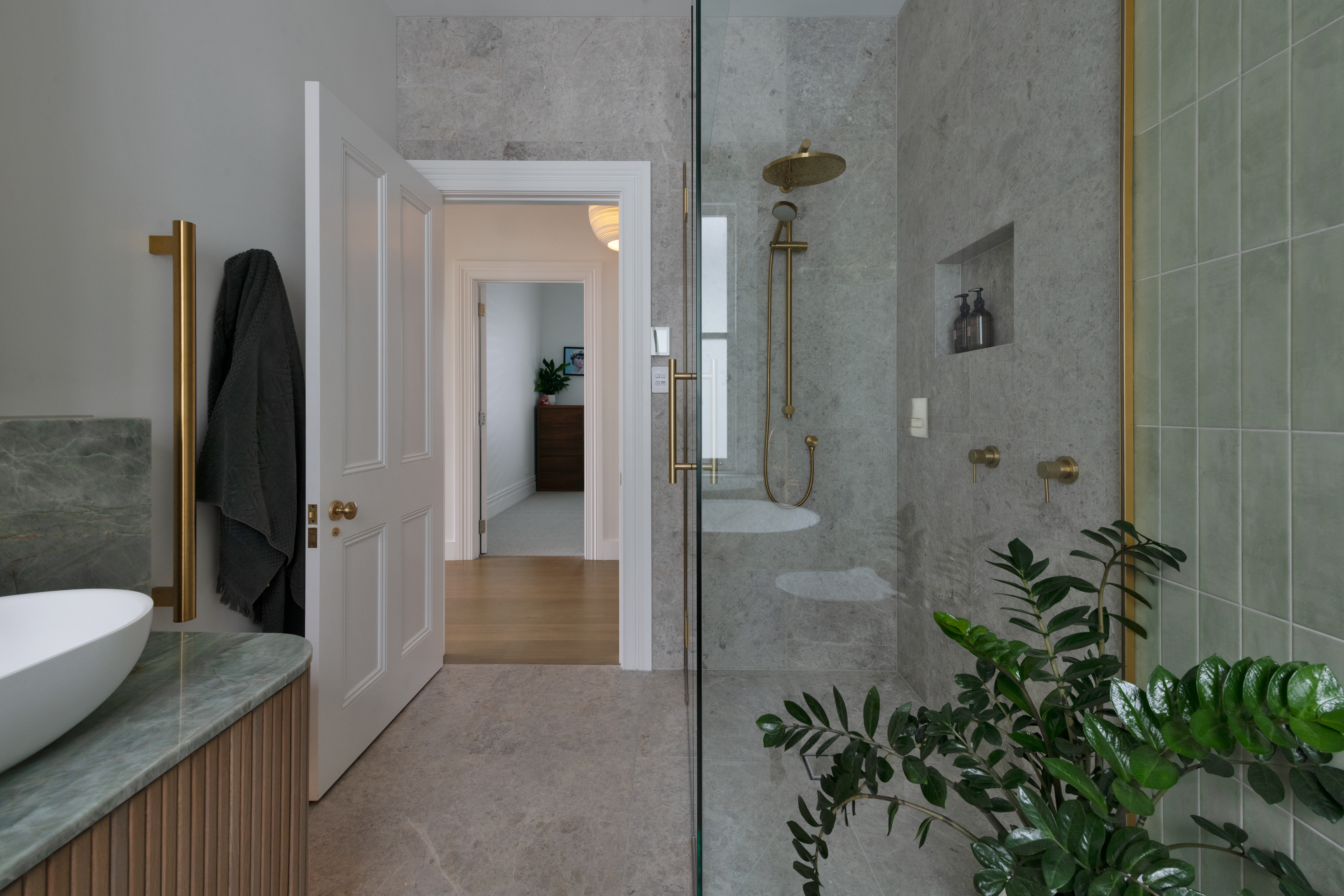 Urban sophistication and rusticity are accomplished here via material palette and a deft balance between the two polarities. Industrial elements are paired with organic materials. Smooth, rectilinear concrete forms are juxtaposed with knotty and expressive timbers and the almost artisanal nature of woven fibres — on a handmade light pendant and glass mesh detailing. Everything — from dark brass strips, handles, taps, and even visible stitching on seats — works together and in sync towards a single idea: urban edge with a country undertone. Great attention to detail, timeless colour palette, and a stylish collection of finishes.