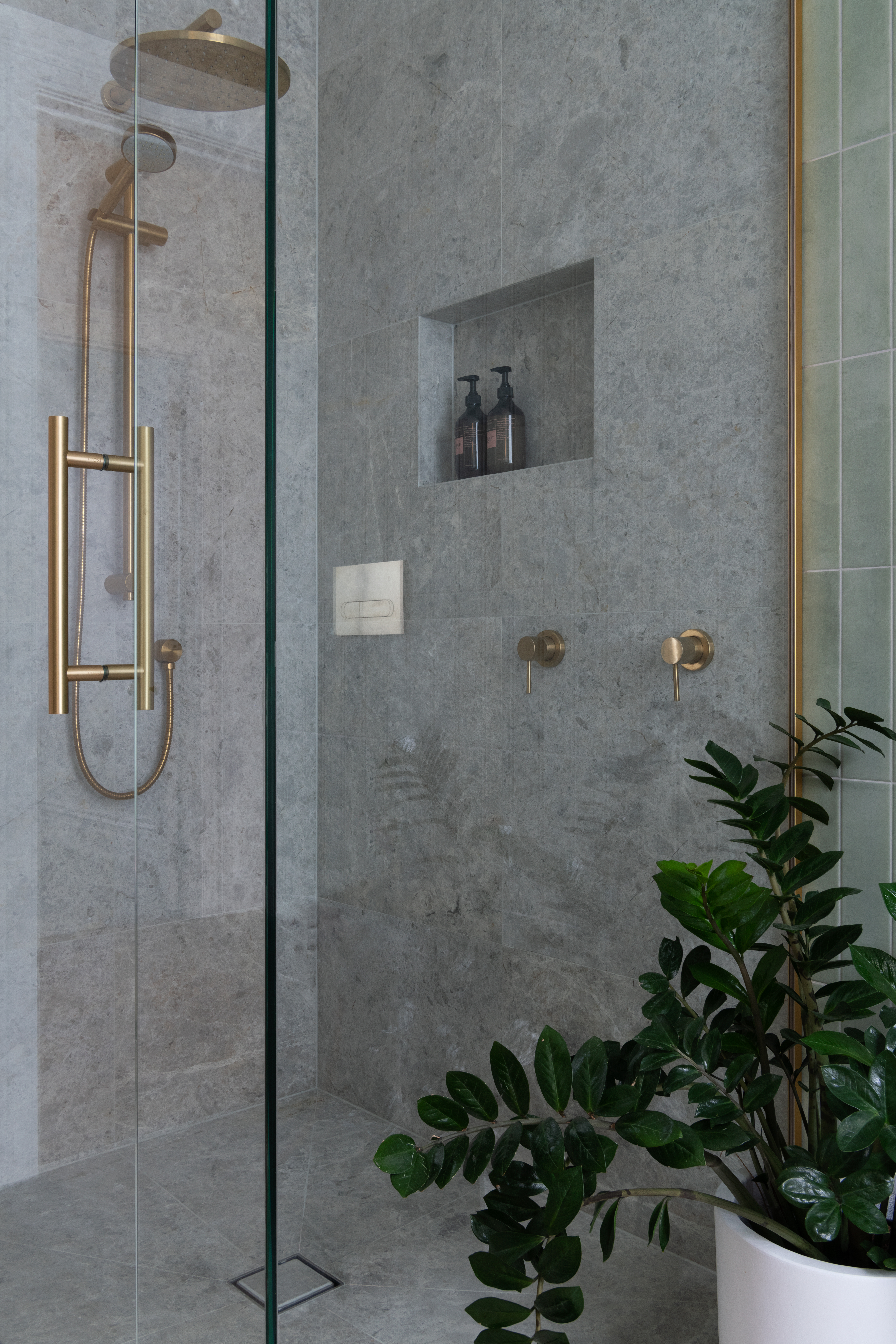 Sexy, inviting, timeless, and rich, a villa en suite unlike any other: full of material richness and dramatic flair; sophistication with an inherent masculinity and a serious ability to wow. The judges commented on the choice of dark wall tiles, which — combined with brass tapware, industrial textured vanity, and pendant lighting — accomplishes an ultra-glam bathroom with an international quality.