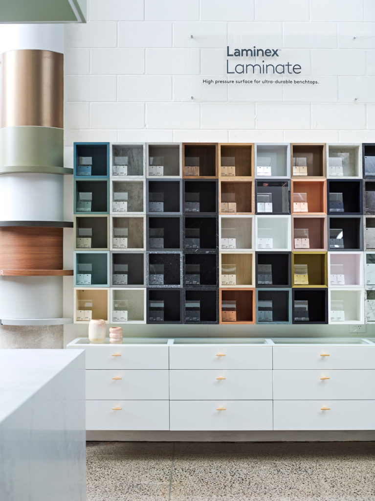 Designed by Material Creative, Laminex’s flagship showroom in Parnell is a place where beauty and good design collide seamlessly into a collection of over 140 decors across eight brands.