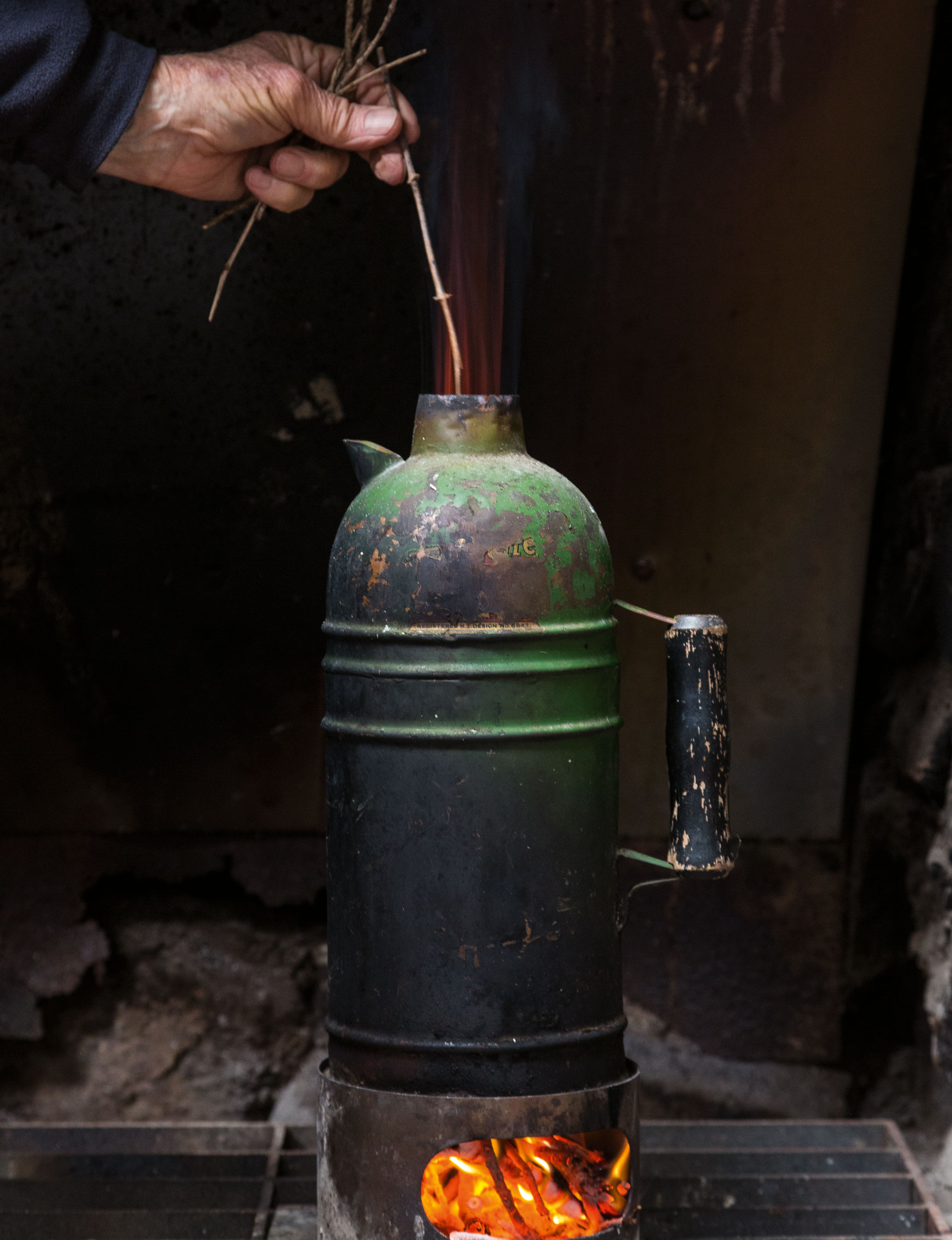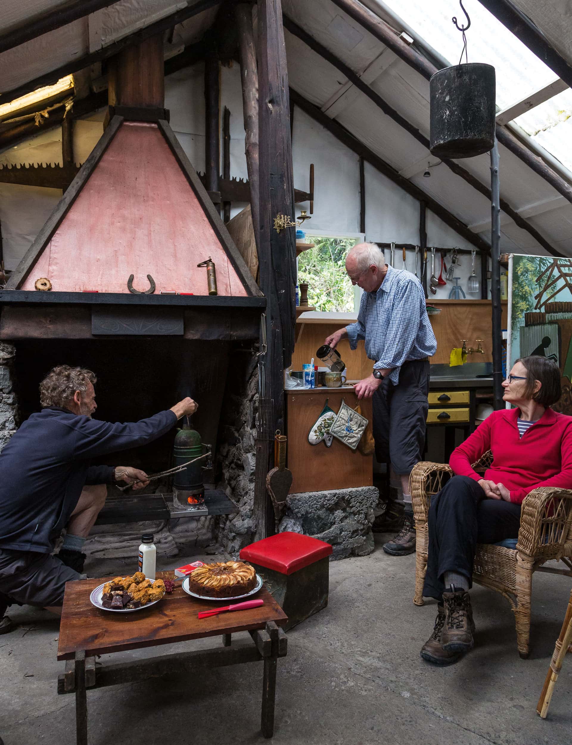Most of the timber was cut out of the bush. The tawa posts were felled on site, while the kahikatea rafters came from down by the river. We worked out if you threw the kahikatea into the river, you could peel the bark off more easily. They’re a very important part of the look of the hut.