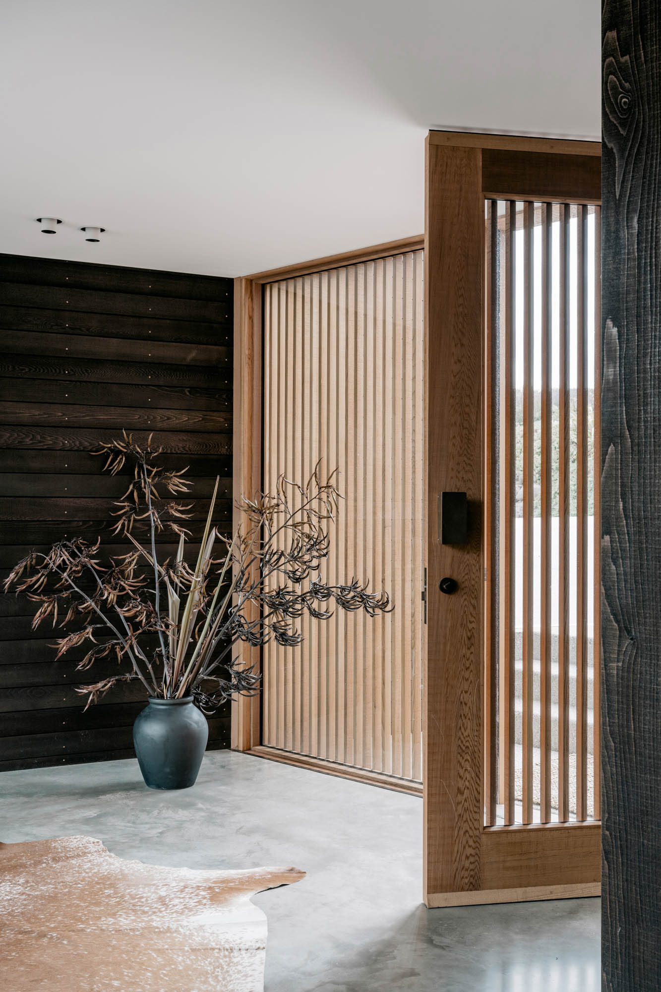 Entry to the house is by way of a veiled glass pivot door screened with cedar battens, which opens onto a foyer. Here, to the east, the ceilings are low and intimate; as you move through the house, the scale increases, with the roof pitching up to capture the peaks beyond.