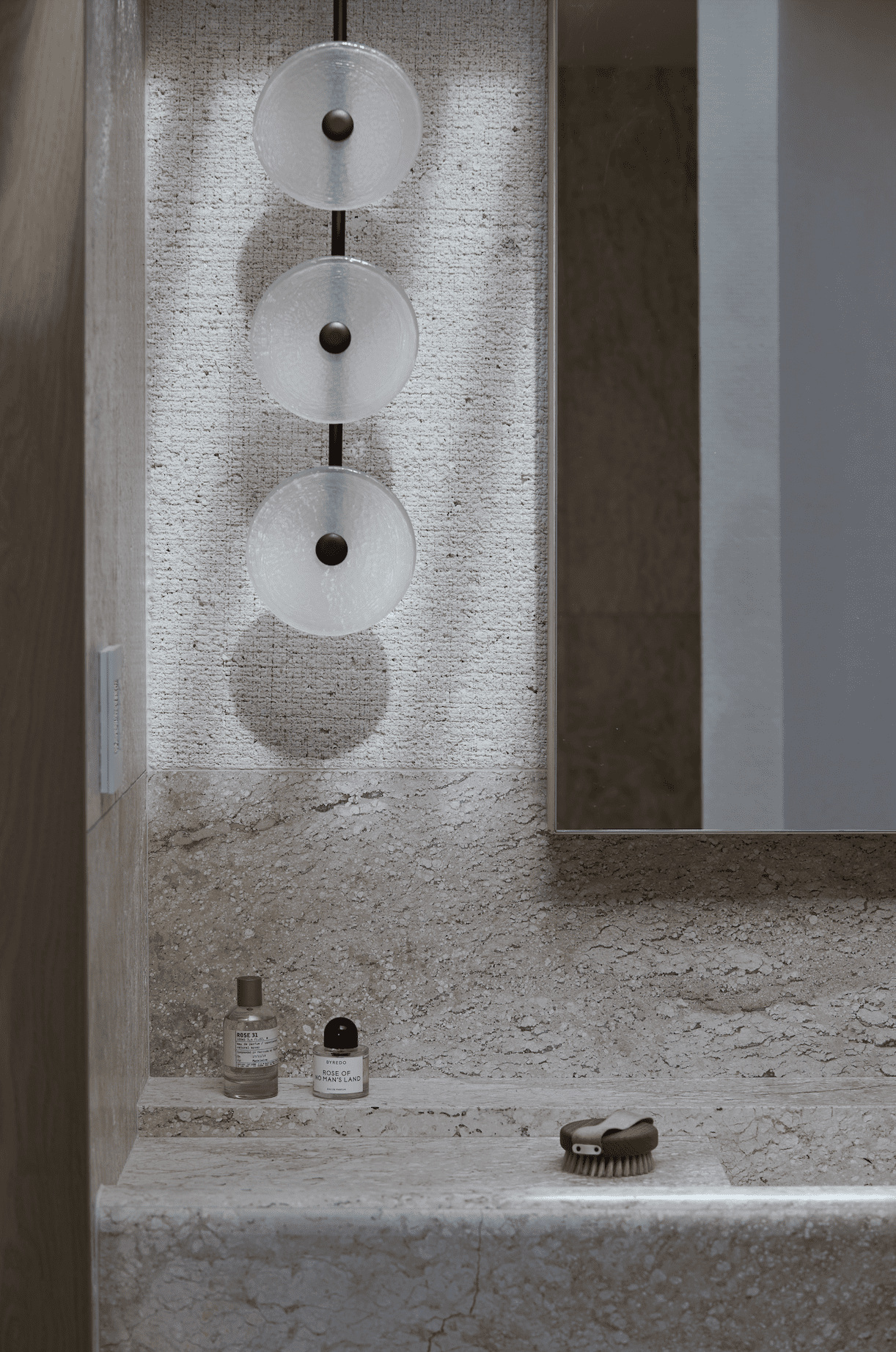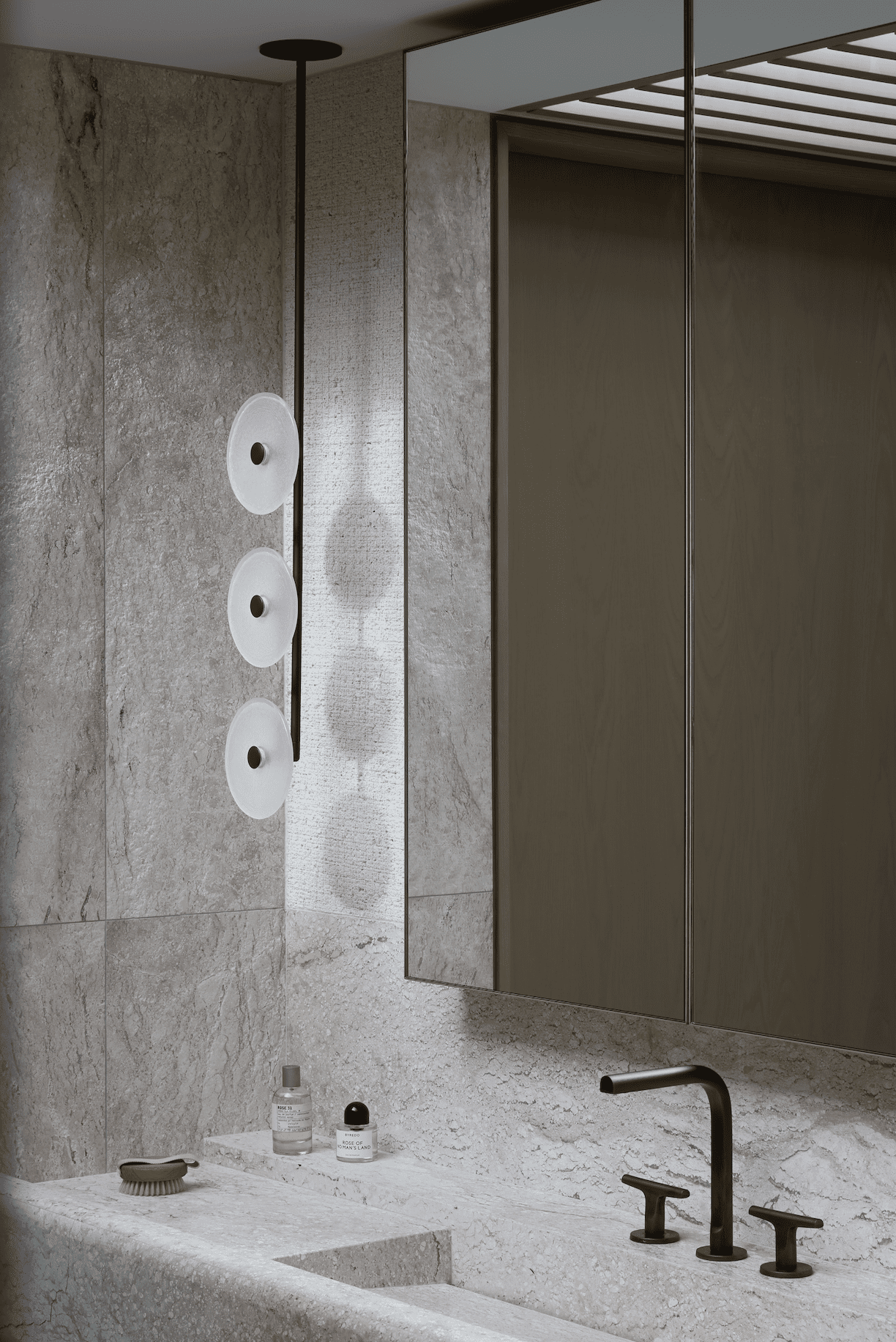 “I wanted something that had the touch of a hand,” Sonya says of the SØKTAS pieces chosen from the brand’s Coral collection: a compilation of three hand-blown frosted glass discs suspended from a vertical rod, and matching single sconces.