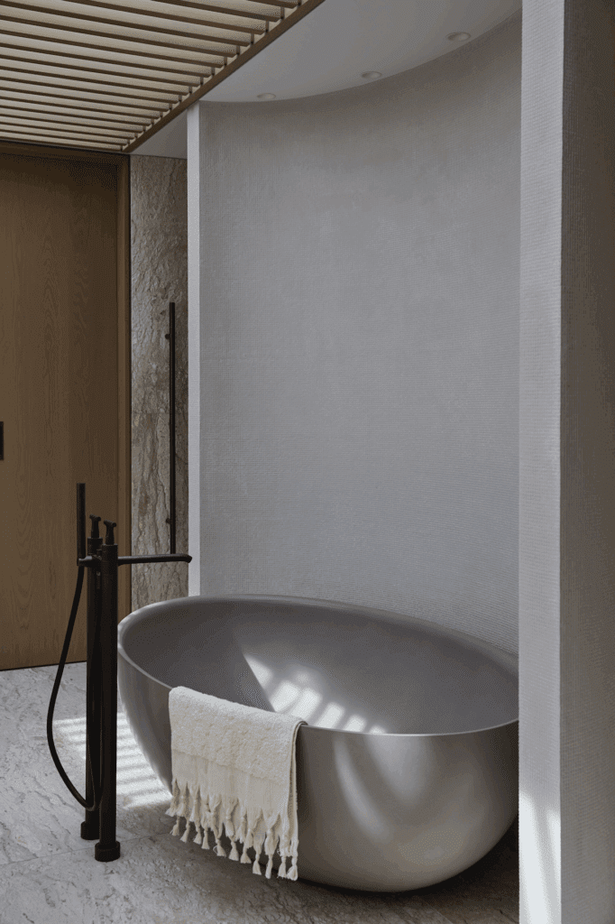 Nestled within the curve, a free-standing Claybrook bath in a soft grey hue grounds the space. “The curved wall gives the bath a sense of place, wrapping around its egg-shaped oval form. It sits under the skylight — a dish of light — and against sculptural Fantini Sailing tapware.”