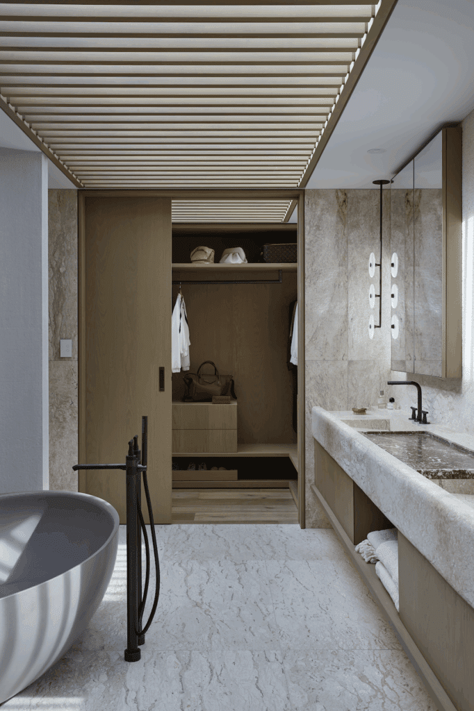The 3.8-metre travertine vanity is the pièce de résistance, with its gently curved edges evocative of the overarching abstract concept: soap smoothed by water and touch. Dual integrated sinks are separated by a toffee-hued marble tray.