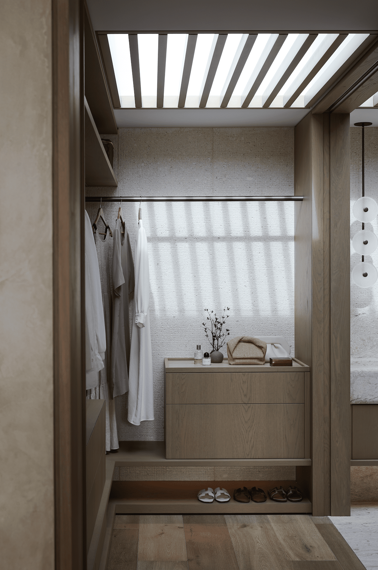 Accessed via either side of the bed through symmetrical wardrobes, the ensuite has no windows but is always washed in an abundance of dappled natural light that filters through a slatted timber screen from a large skylight.