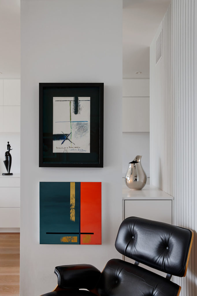 The move to use white on most surfaces had a double purpose: the cleanliness of palette and lines chosen partly to allow the owners’ art to breathe without any colour or textural noise and partly to match an impressive and robust white cooker.
