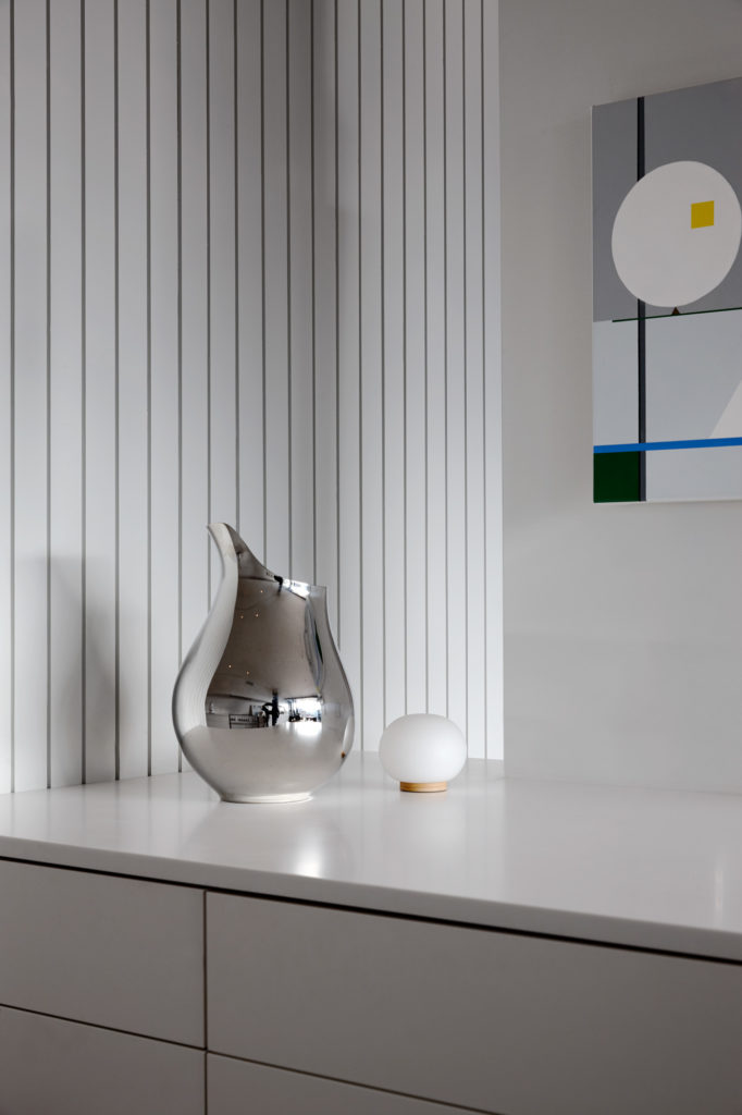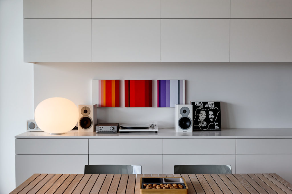 The Corian and white lacquer kitchen seems almost crafted to emulate the large, snowdrop-white stove with its chunky handles and inherently classic yet contemporary persona. The owners have also amassed a selection of feature lighting pieces, a turntable and speaker set, artwork, and furnishings that complement the interior in a way that Dieter Rams would probably be envious of. The soothing, white horizontality is complemented by translucent spheres and globes and, other times, by the ridged shades of Flos lights.