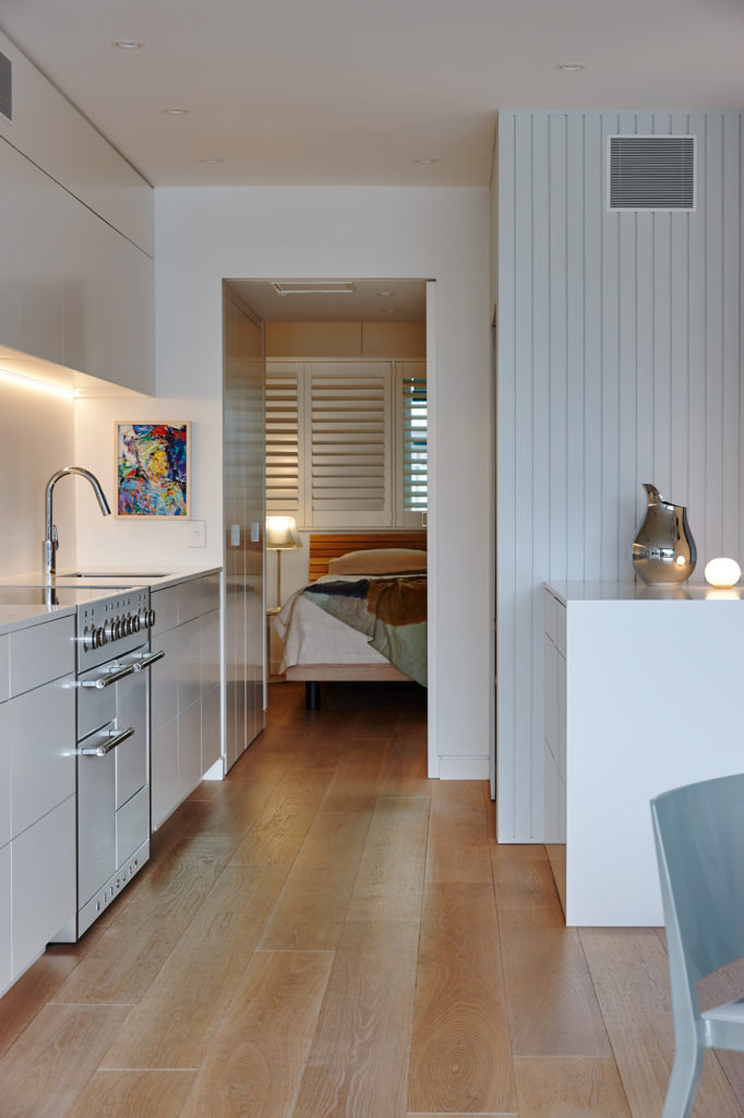 The kitchen — formerly a U-shape directly bisecting the flat — was put right up against the northern wall, thus opening up a corridor between bedroom and living room and ensuring the much-desired air and light flow.