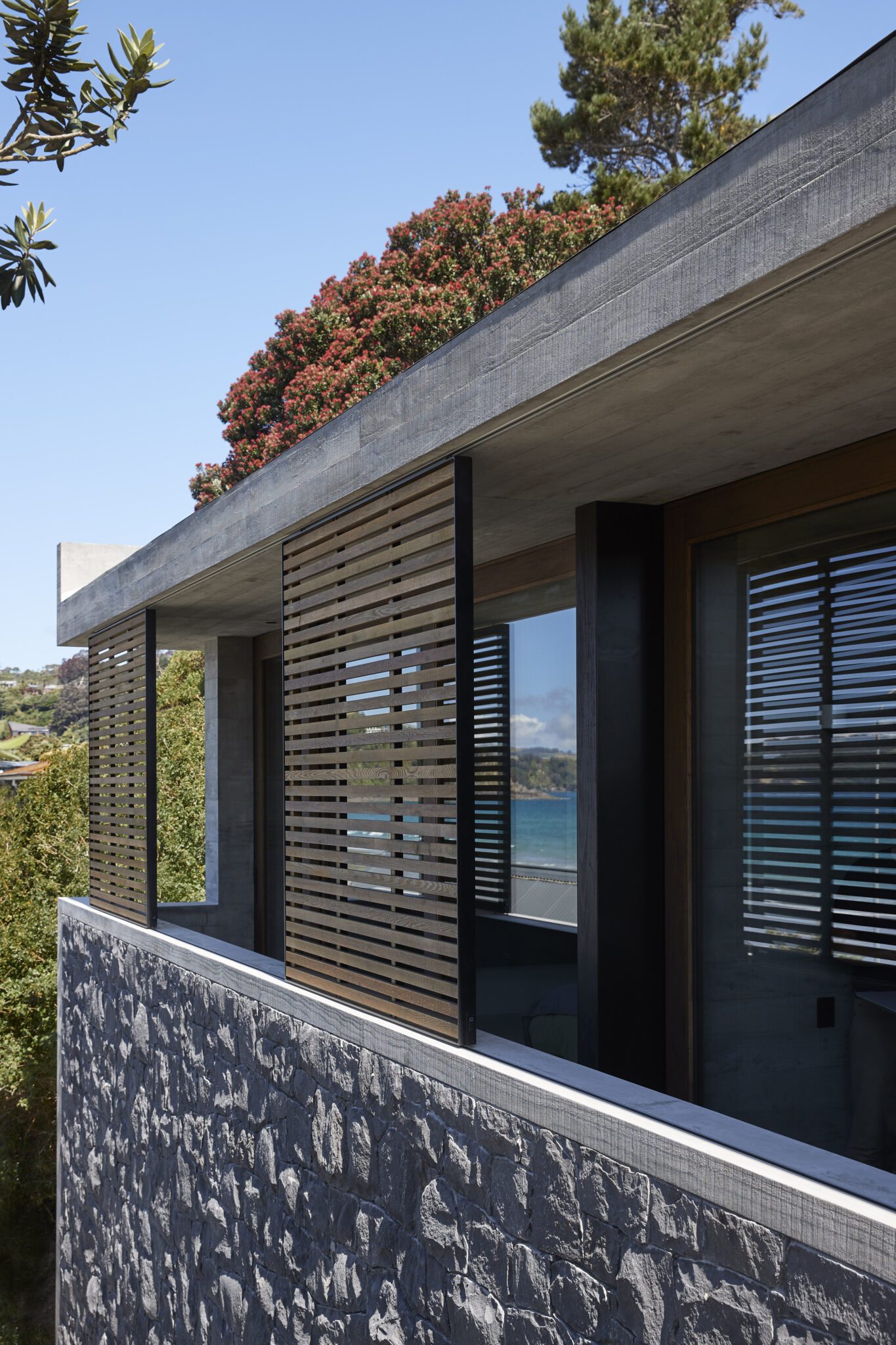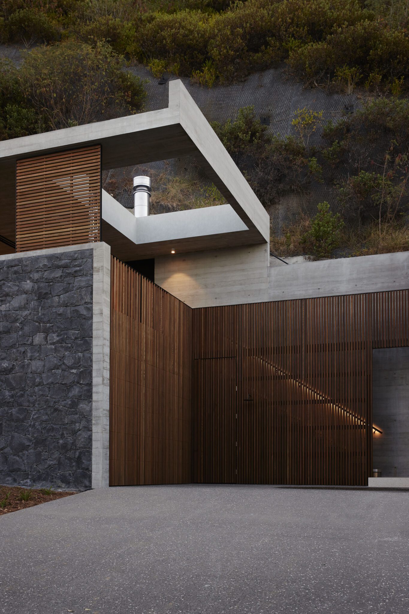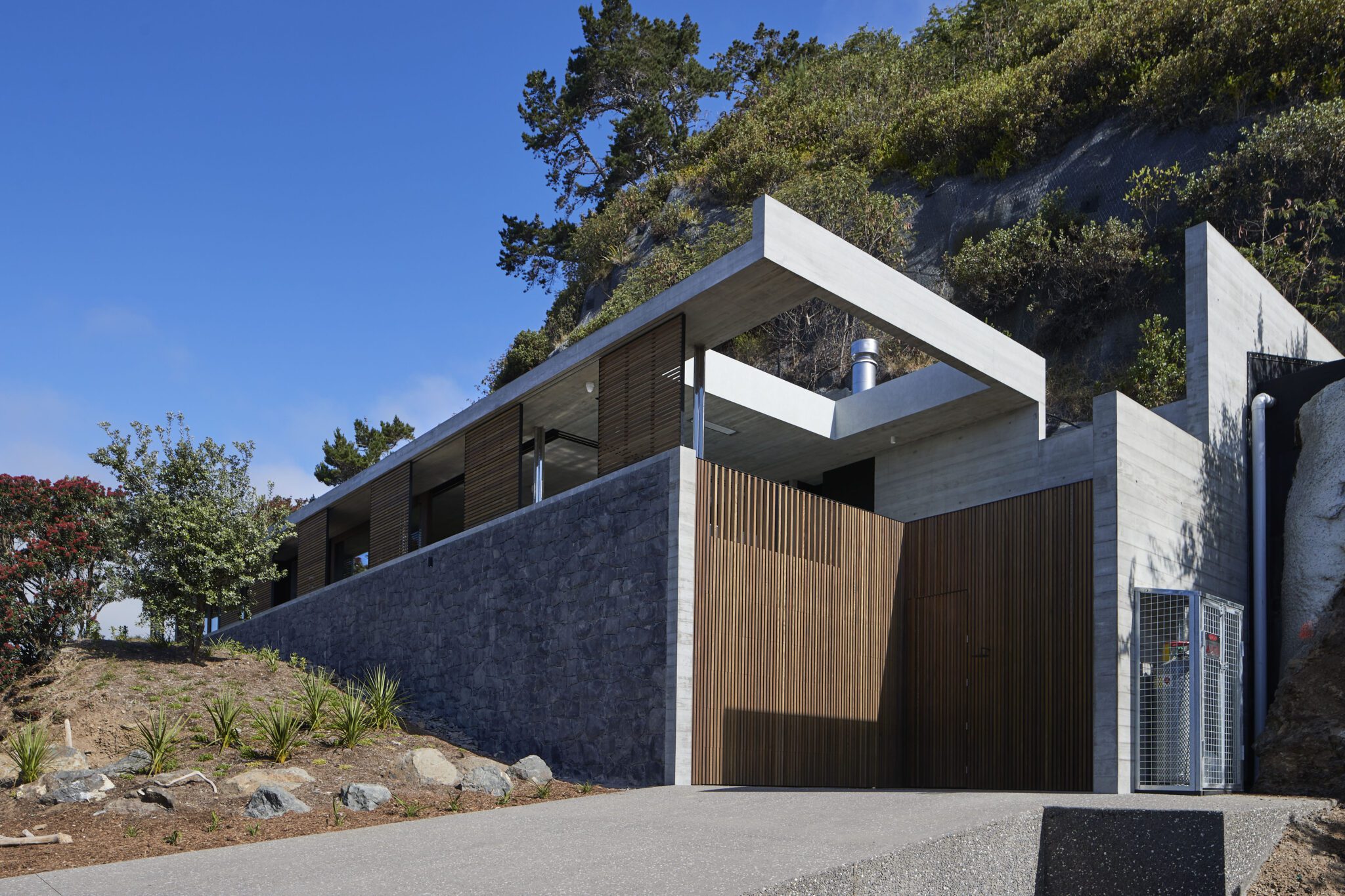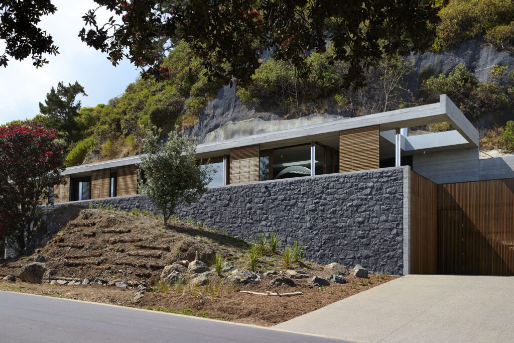 To mitigate the risk of the cliff face, withstand the harshness of the nearby sea, and blend tonally with its context, the exterior is mostly concrete with some of the greywacke from the excavation used as façade and cedar screens that seem to add a filmic cross-fade towards the interior.