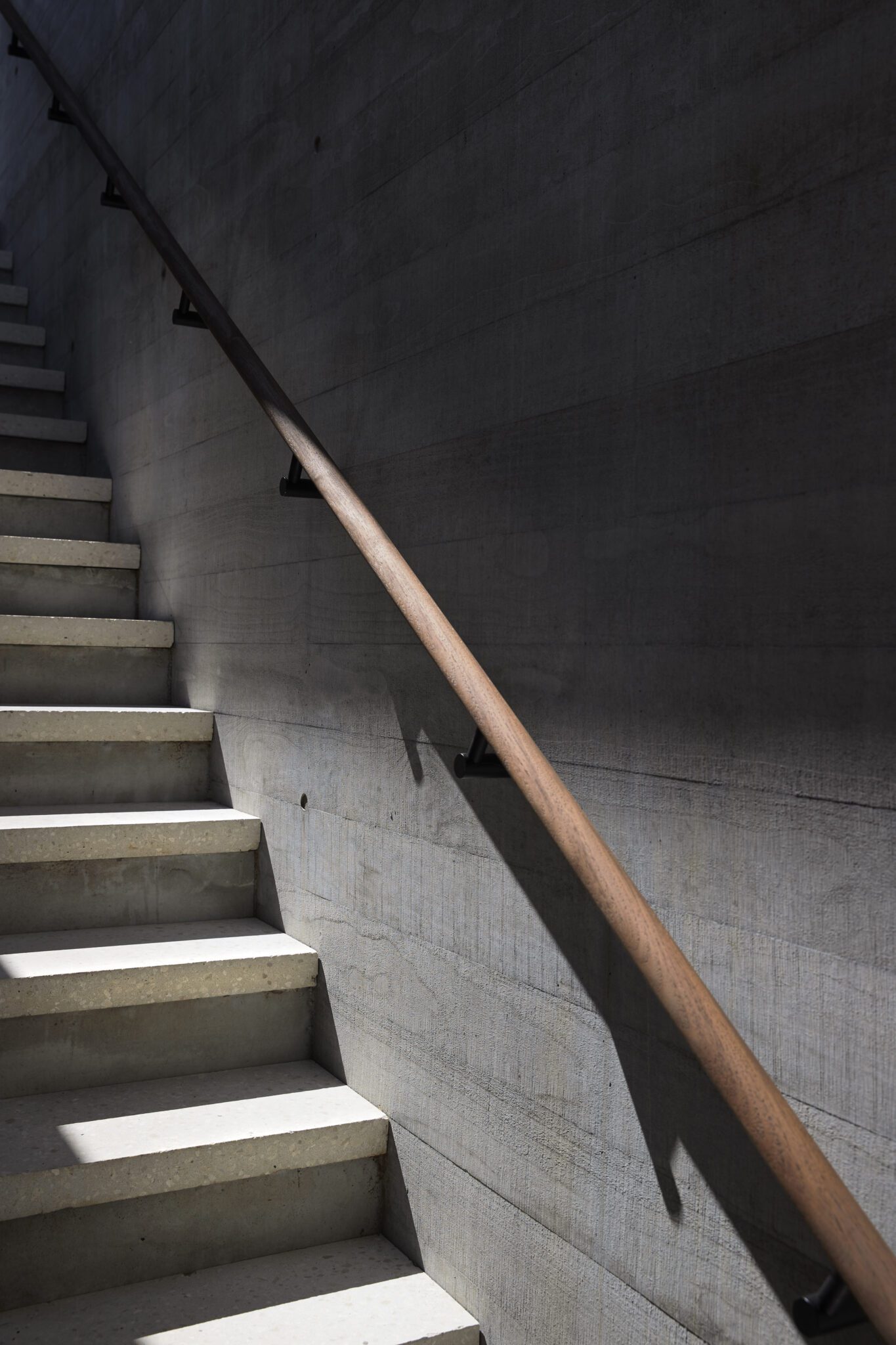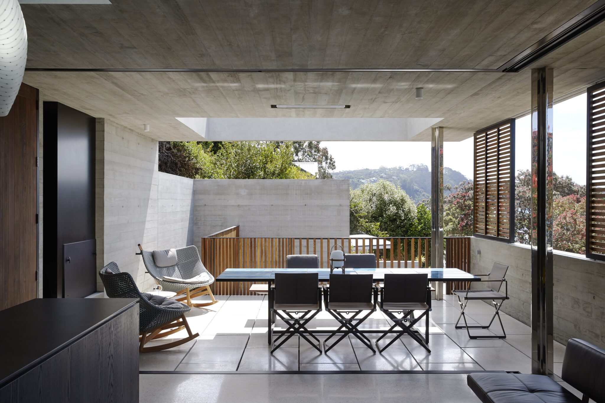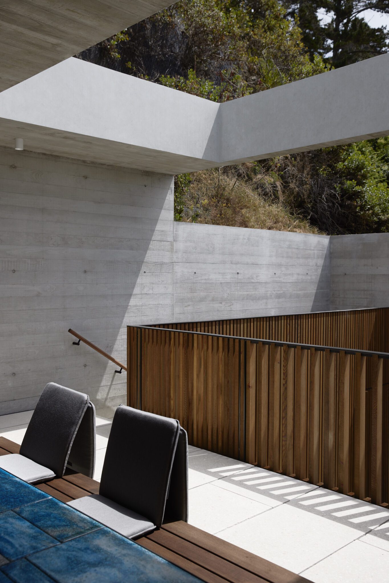 To mitigate the risk of the cliff face, withstand the harshness of the nearby sea, and blend tonally with its context, the exterior is mostly concrete with some of the greywacke from the excavation used as façade and cedar screens that seem to add a filmic cross-fade towards the interior.