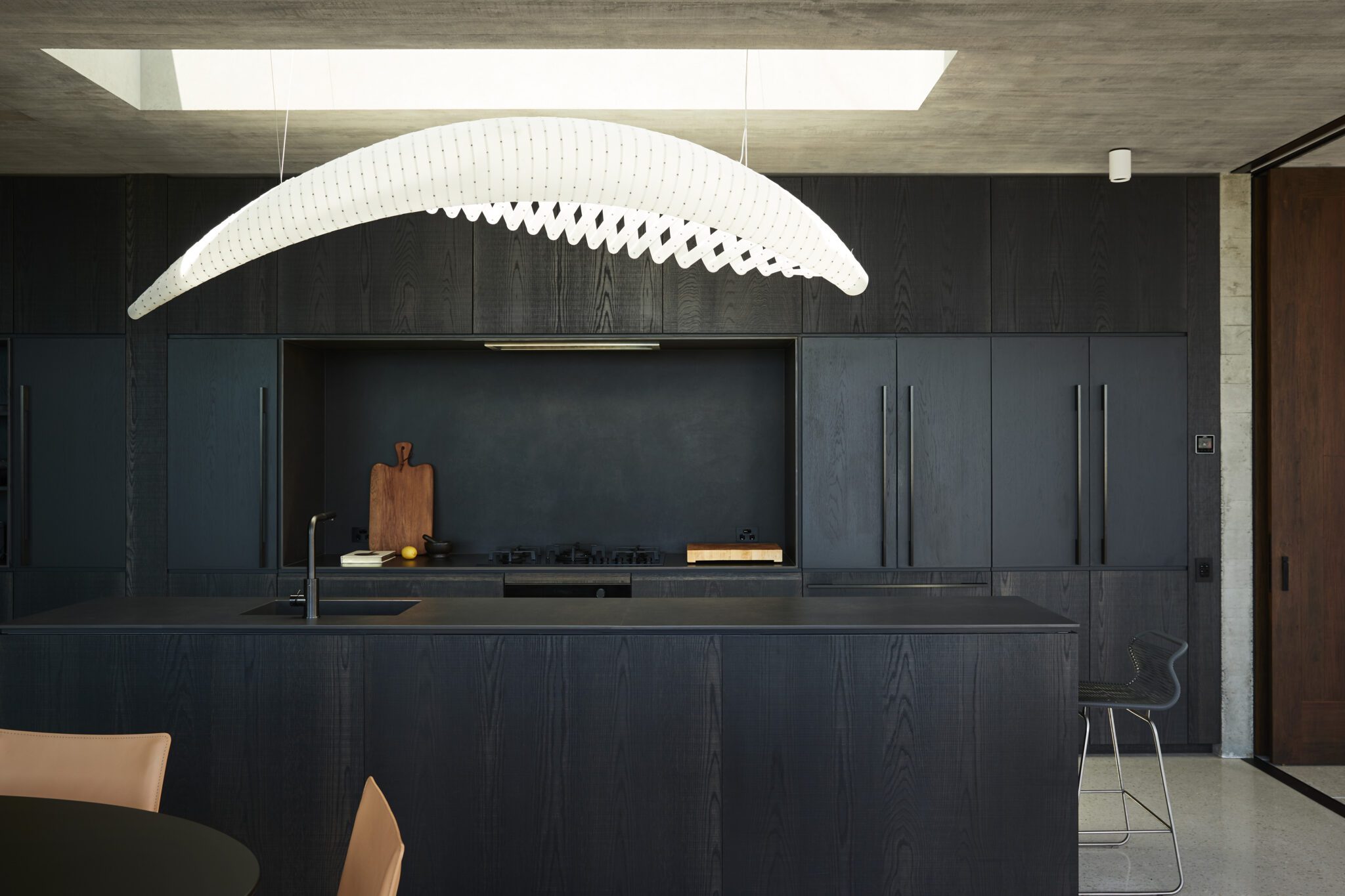All this is complemented by the owners’ taste in contemporary industrial design, which includes pieces that speak directly to the coastal context. Paola Lenti’s Sciara ceramic outdoor table emulates pools of blue water; the David Trubridge pendant above the kitchen bench could be read as either clouds or waves from the nearby sea; Francesco Binfaré’s sofa ‘On the Rocks’ adds an island-like moment to the social space.