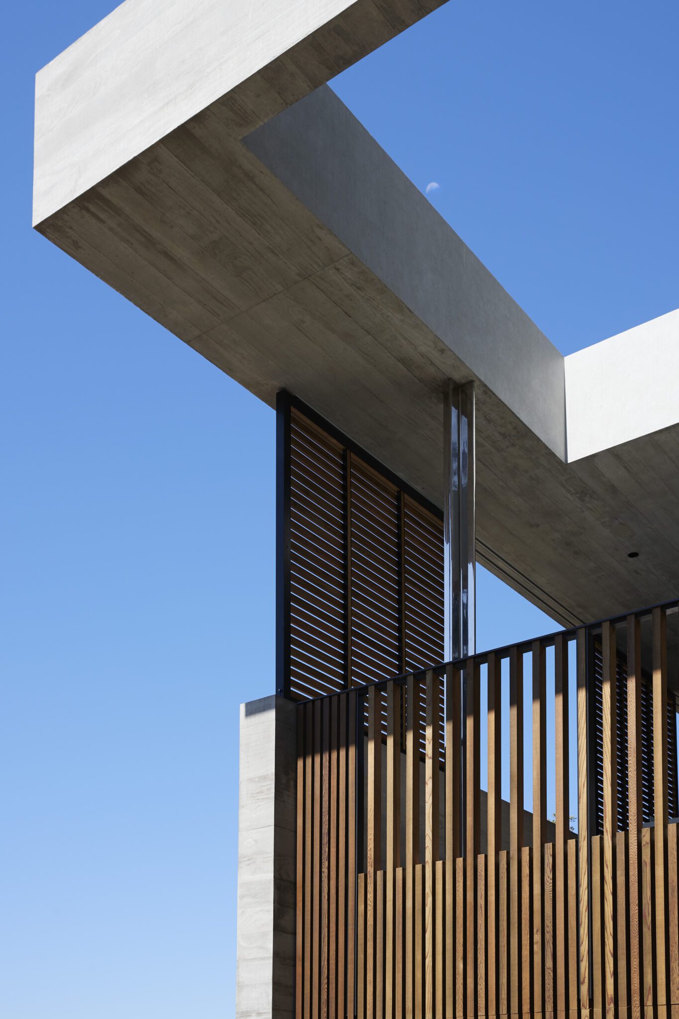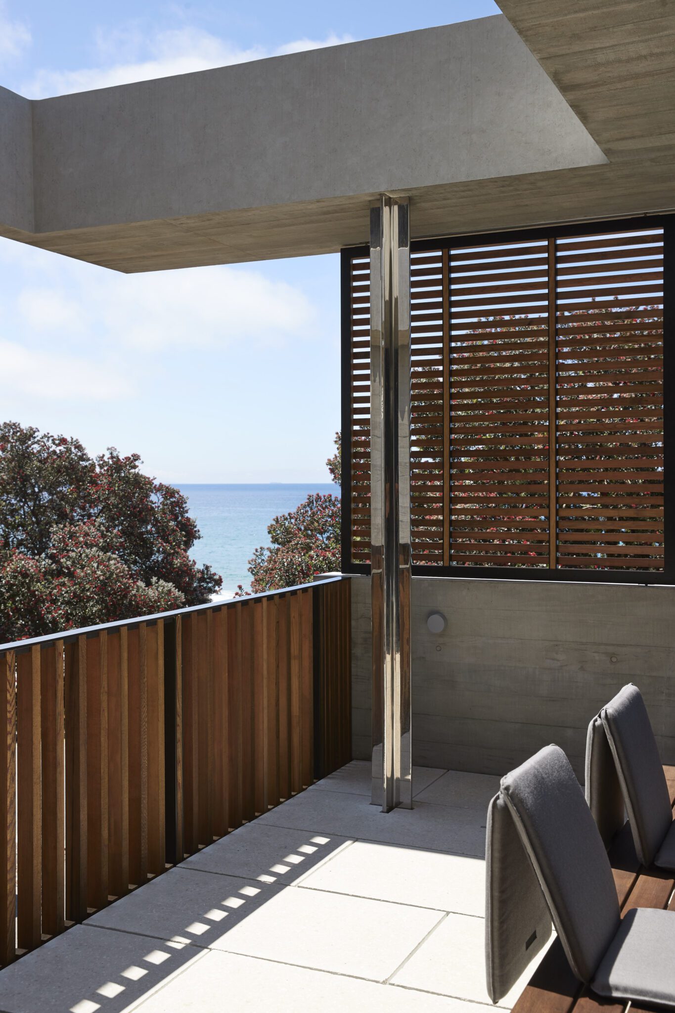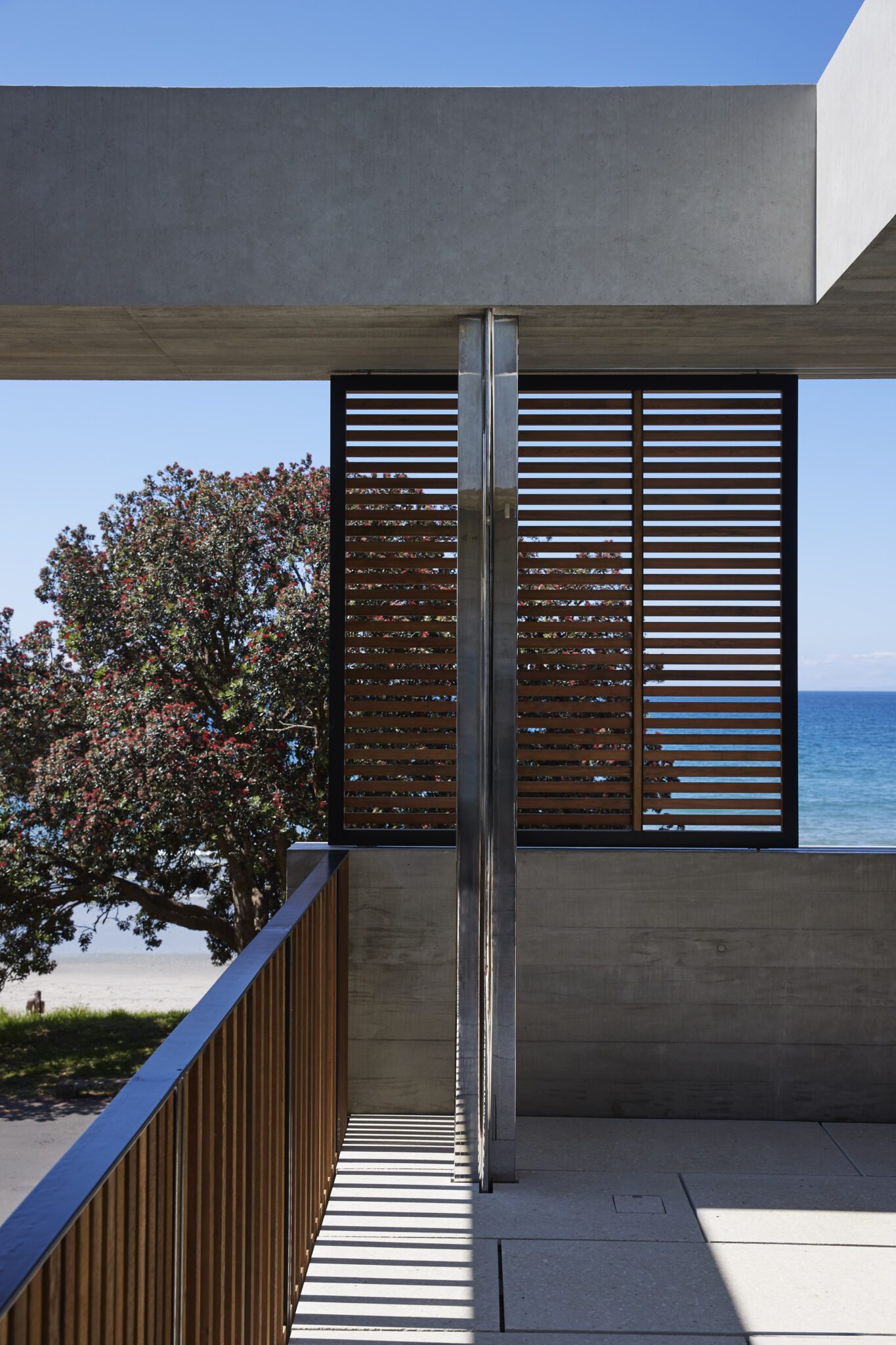 The result is a gorgeous play of light against the formwork of the concrete. The bedrooms are modest in size and are flanked by a long and thin balcony-like space and privacy timber screening that provides a buffer for the interior from The Strand.
