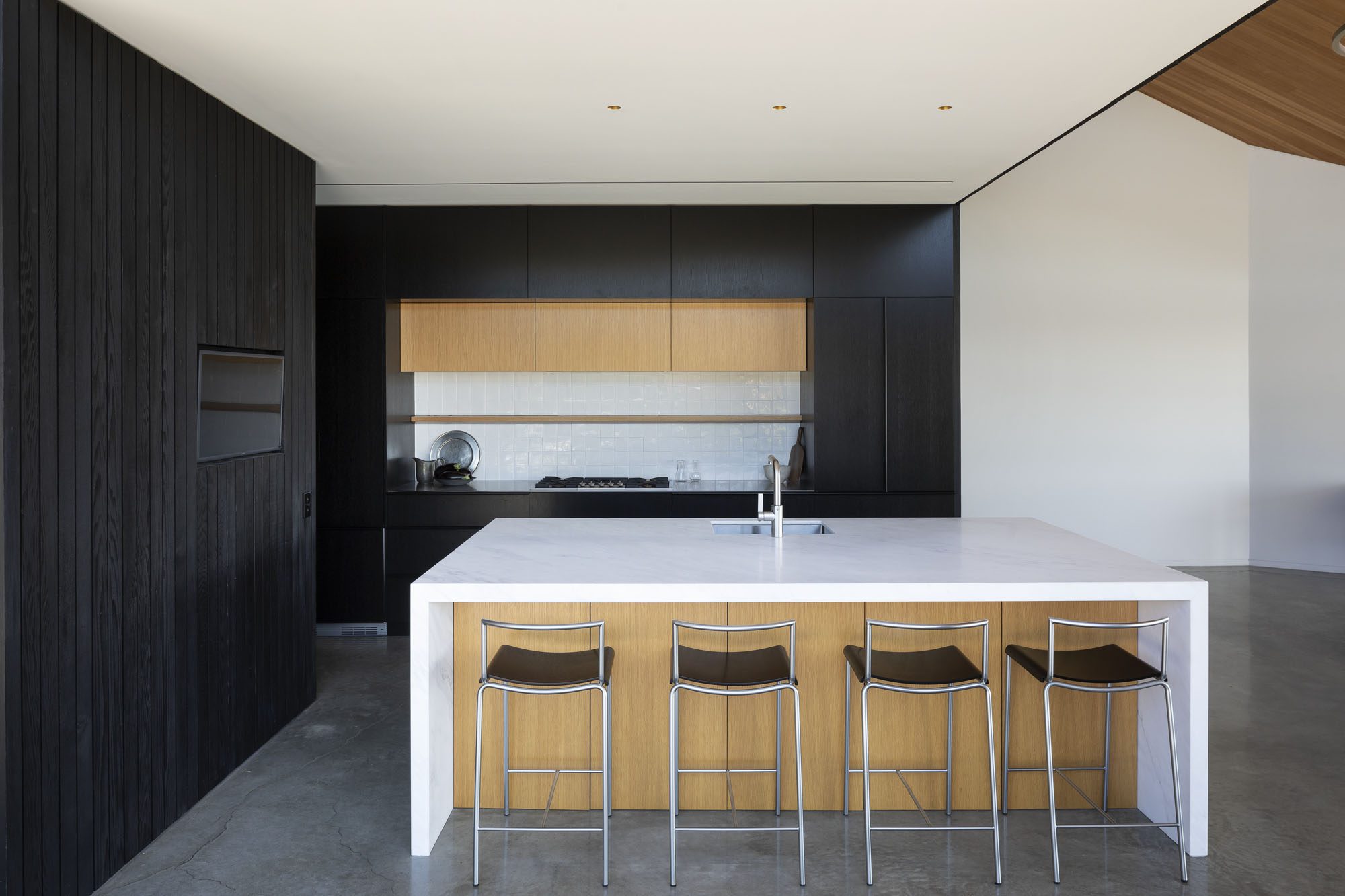 Back in the living wing, the kitchen is emblematic of the monochromatic colour scheme, with its black cabinetry and generous white island with grey veins.
