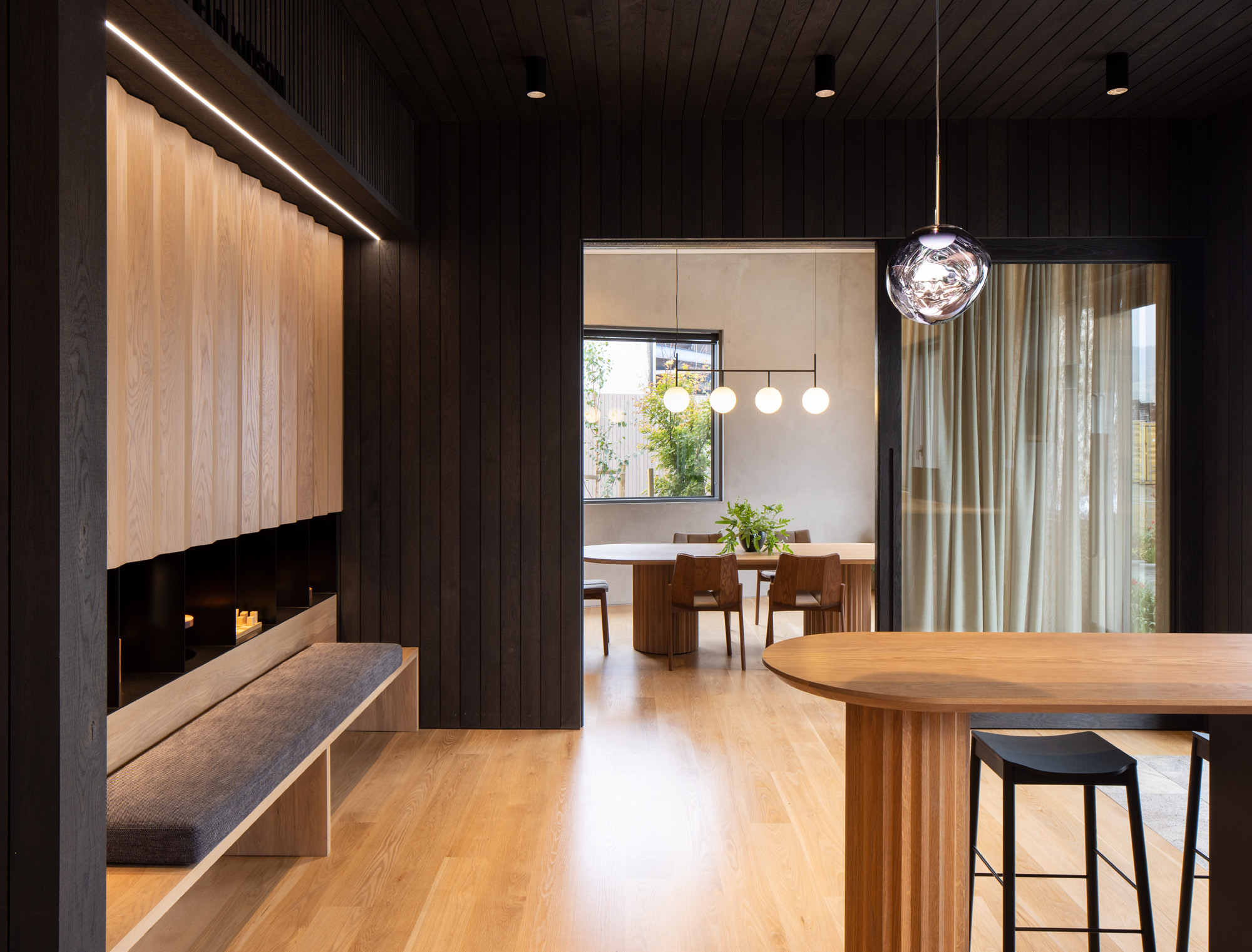 Strachan Group Architects (SGA) was brought in to take the double garage — which until then had been used only for storage — and turn it into this stunningly detailed 36m² office with a kitchenette and full bathroom. To turn this client-ready office into a guest room, a secondary desk folds discreetly away and, from the wall, a drop-down bed has been hidden by perfectly lining the timber cladding with a similar treatment on the bed’s underside.