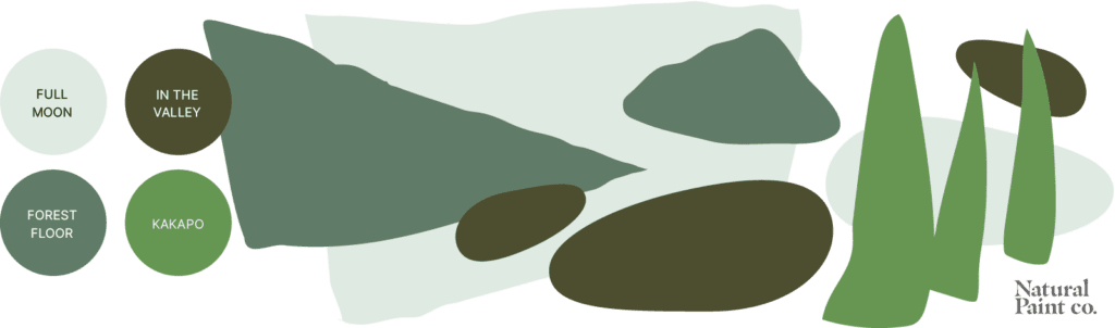 Anchored by the depth of brown-tinged green In the Valley and balanced by the lighter citrus hue of Full Moon, Rainforest is a calming palette that speaks to the natural beauty of untouched forests.