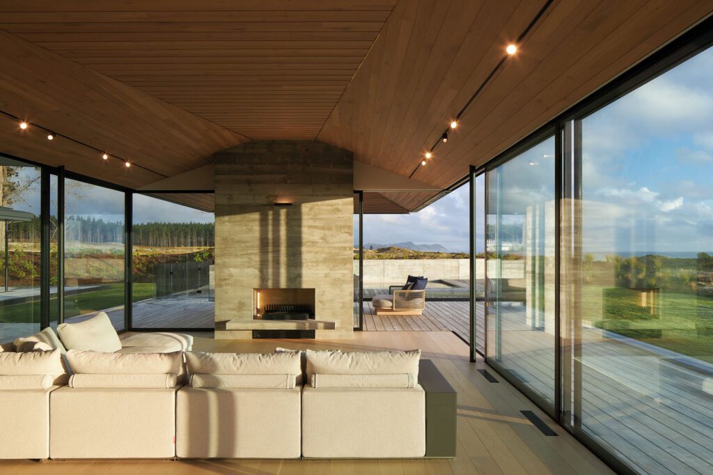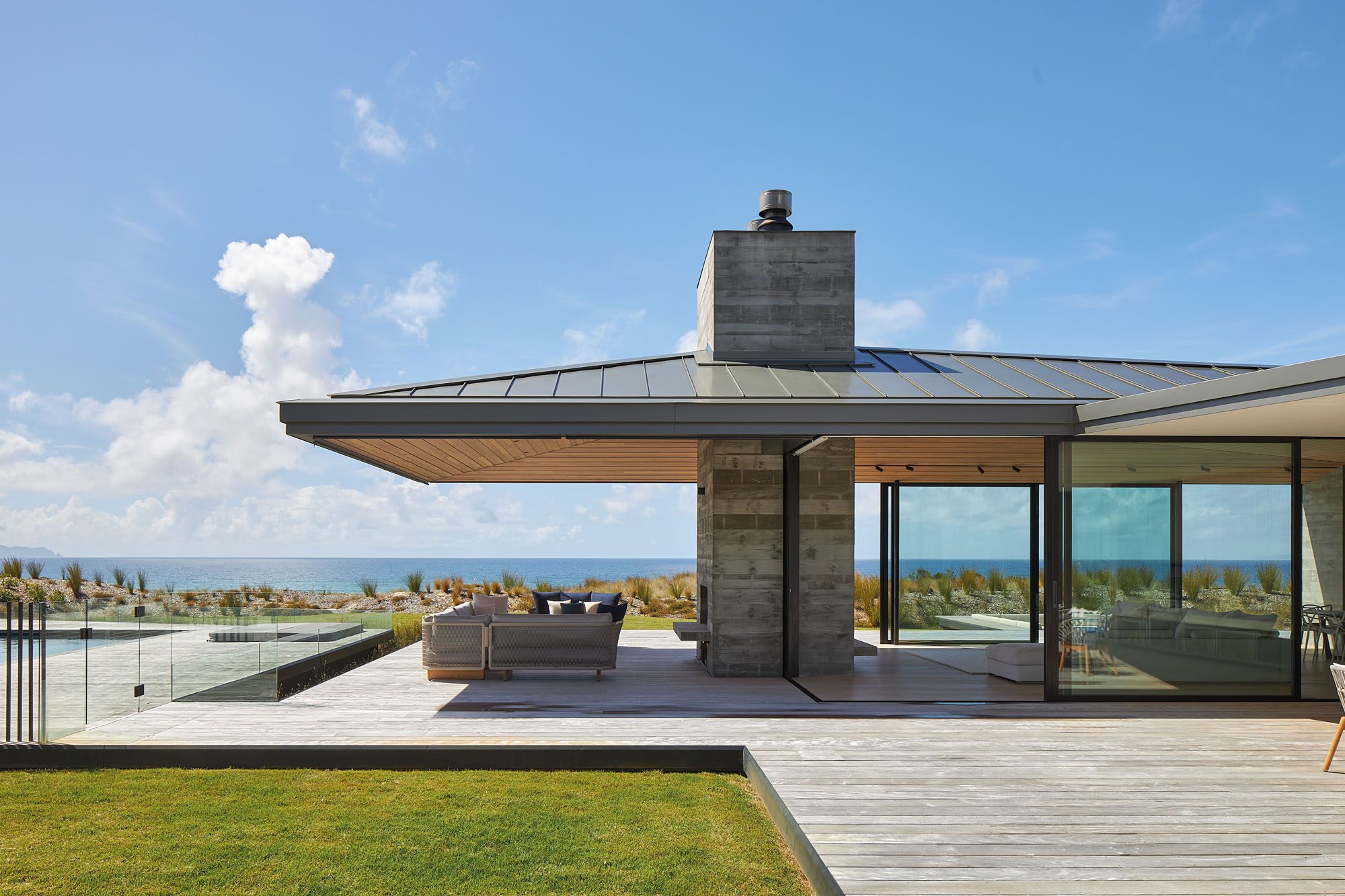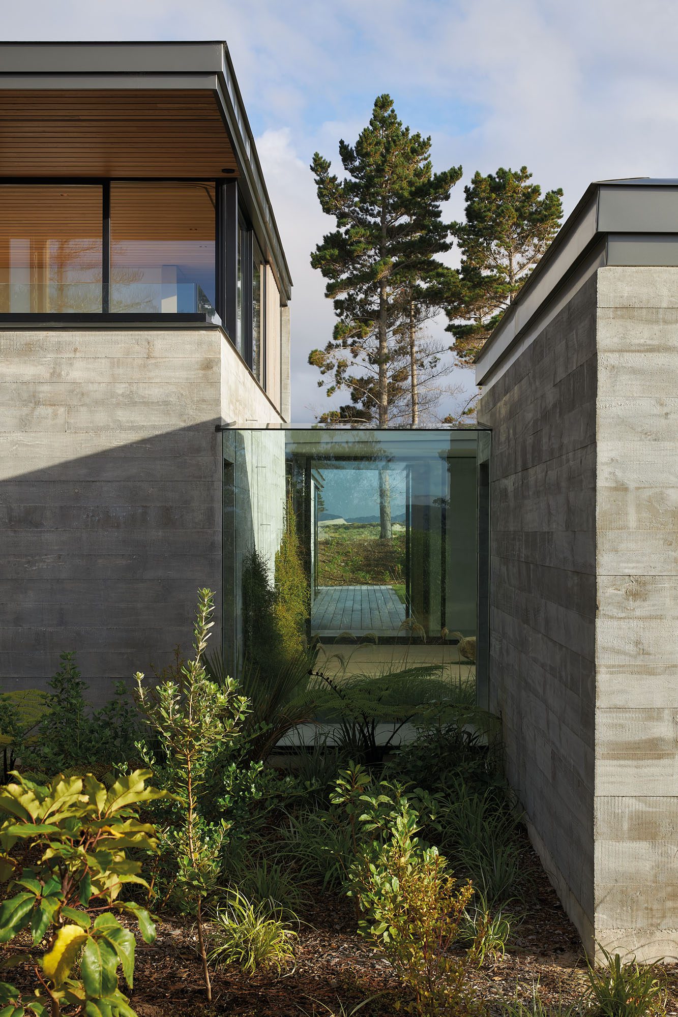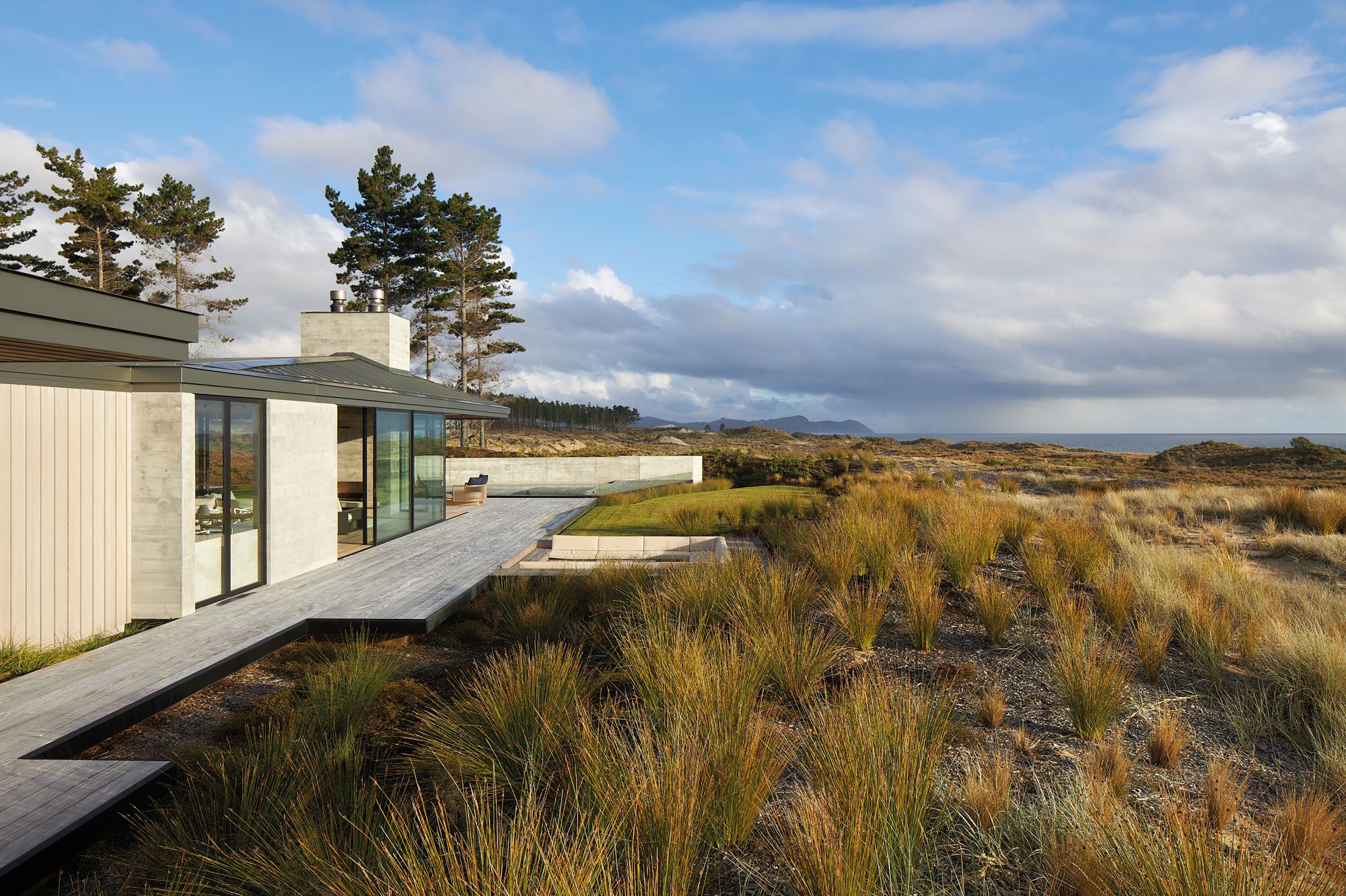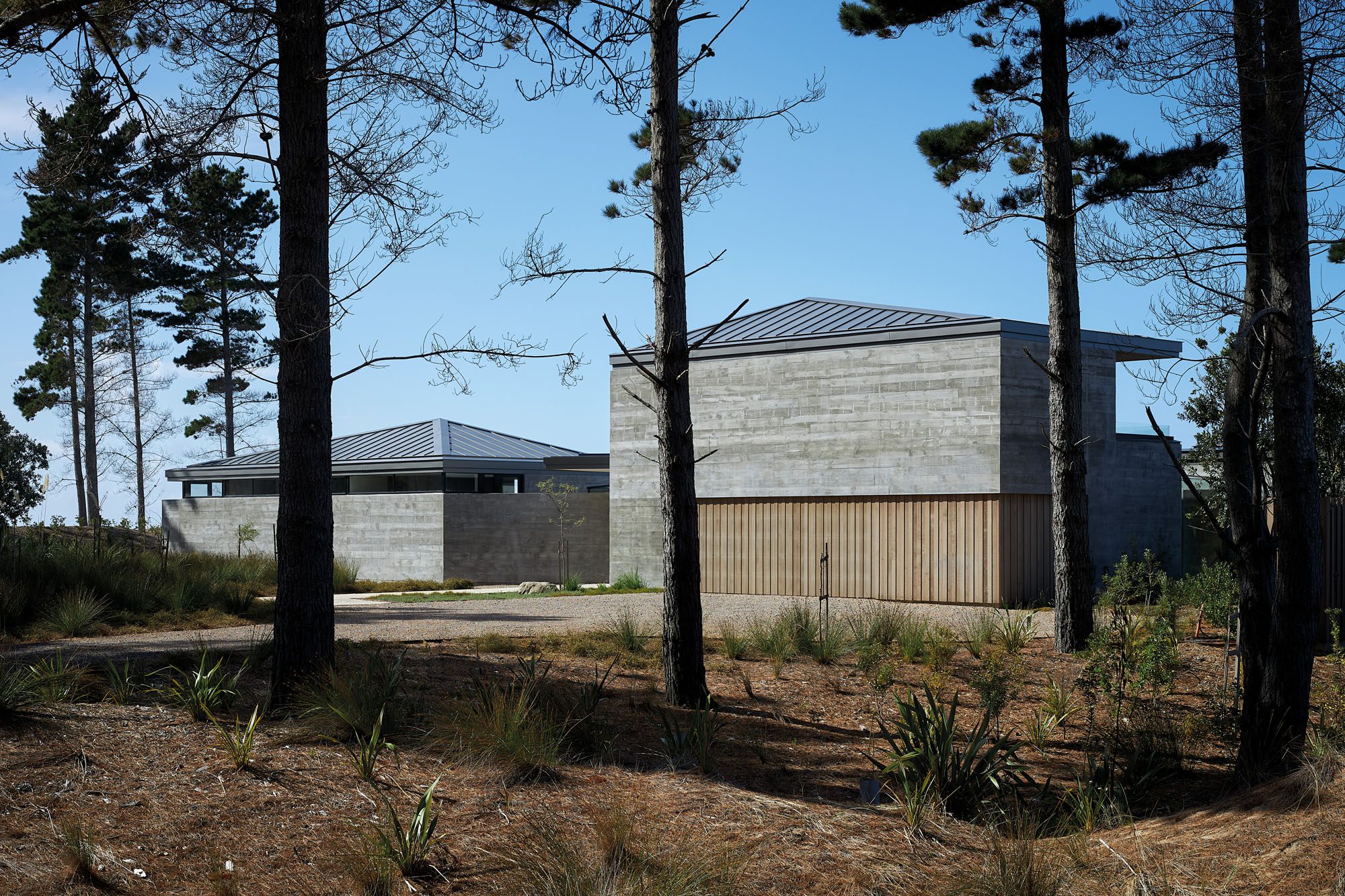 Near the border of Auckland and Northland, a long, meandering driveway dips towards a cluster of sand dunes by the sea. At its end, a house emerges — bunker-like in its concrete solidity, with a wrap-around timber garage door that reveals little of the experience that lies within.