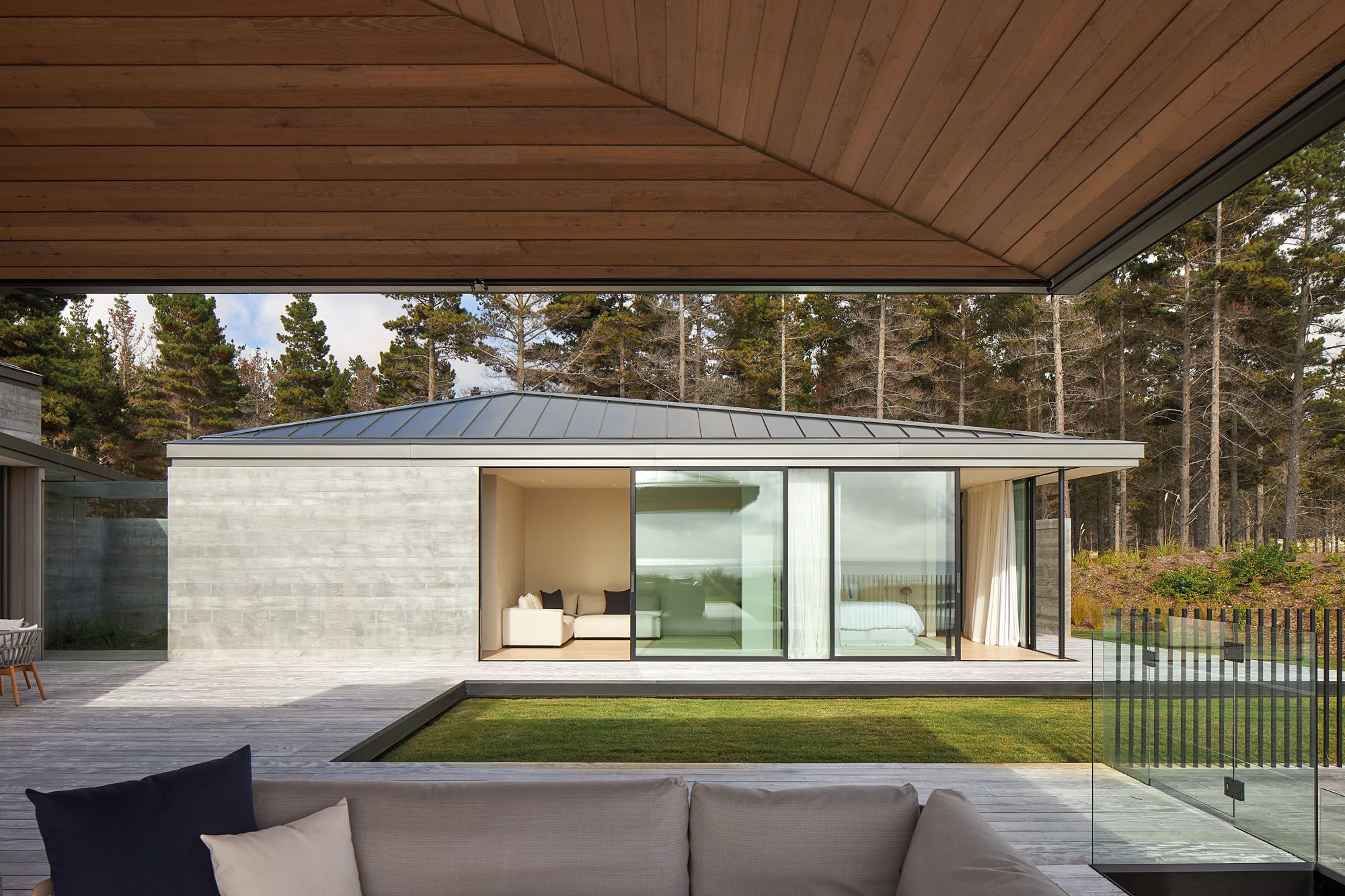 Courtyards, terraces and decks wrap around the pavilions. Some are timber-clad; others are lush with toetoe, sago palms, creepers, native tussocks, and boulders, while tall pine trees form a natural screen to the south-west.