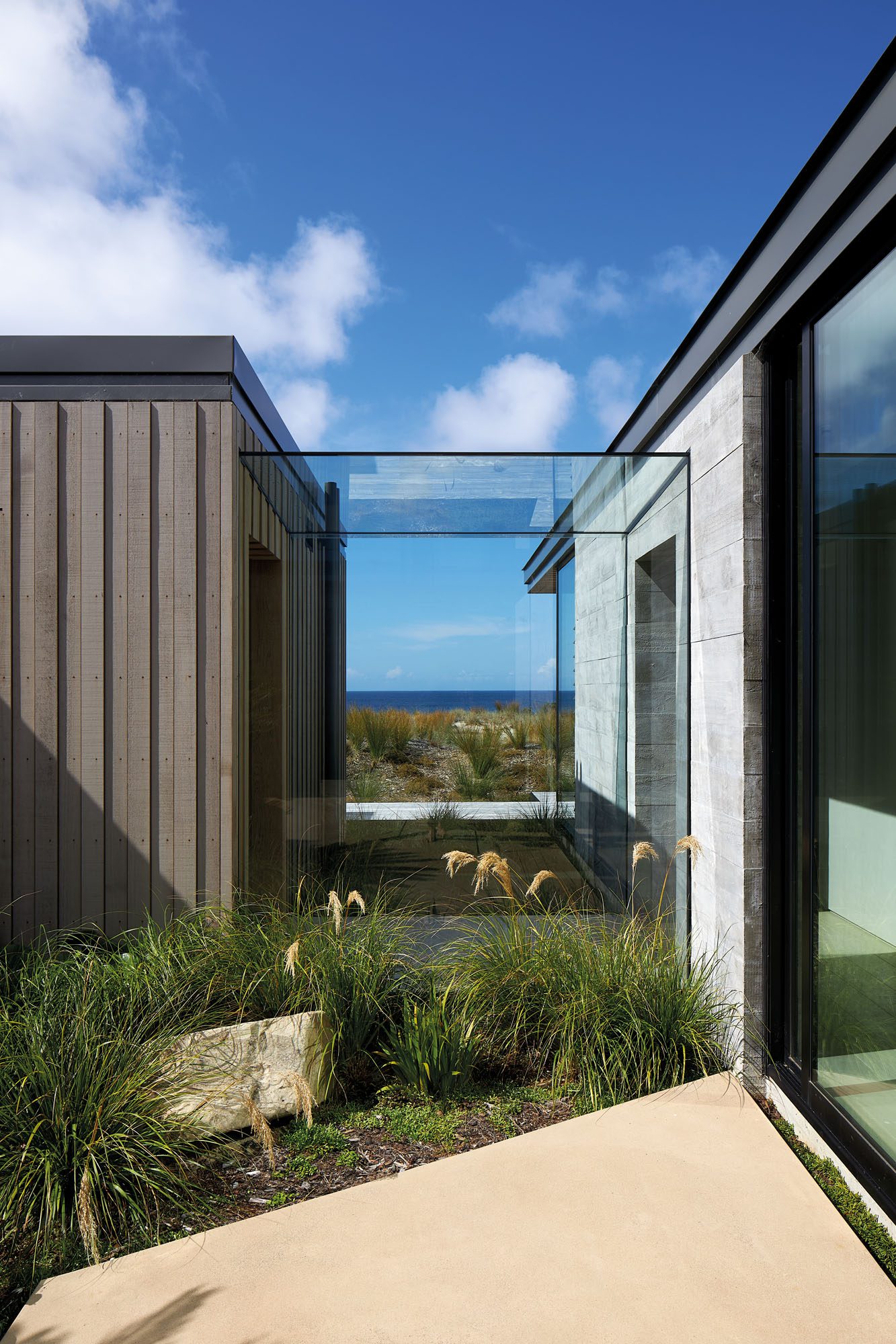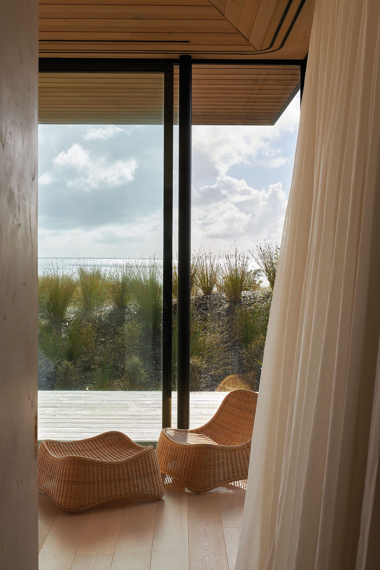 A muted palette of exposed concrete, limestone and bleached oak echoes the sand and driftwood of the coastal setting, while touches of soft brass add warmth and depth to the house’s interior. Roofs are clad in wide-profile, pre-coated aluminium in a schist tone. Above the main courtyard, a triangular canopy clad in artificial turf — complete with a circular lightwell — playfully resembles a golf course.