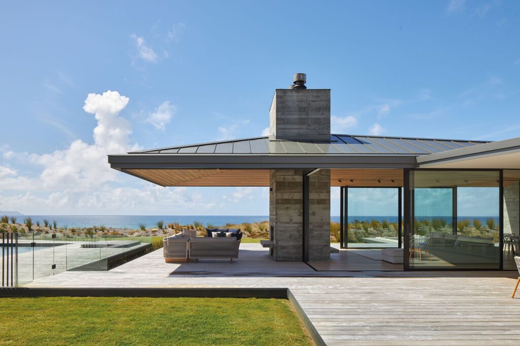 This is a large home, mostly on one level but with a basement and a bedroom that rises above. It unfolds across four pavilions arranged along three sides of a quadrangle, with the open, sea-facing north side ensuring every part of the house enjoys expansive views.