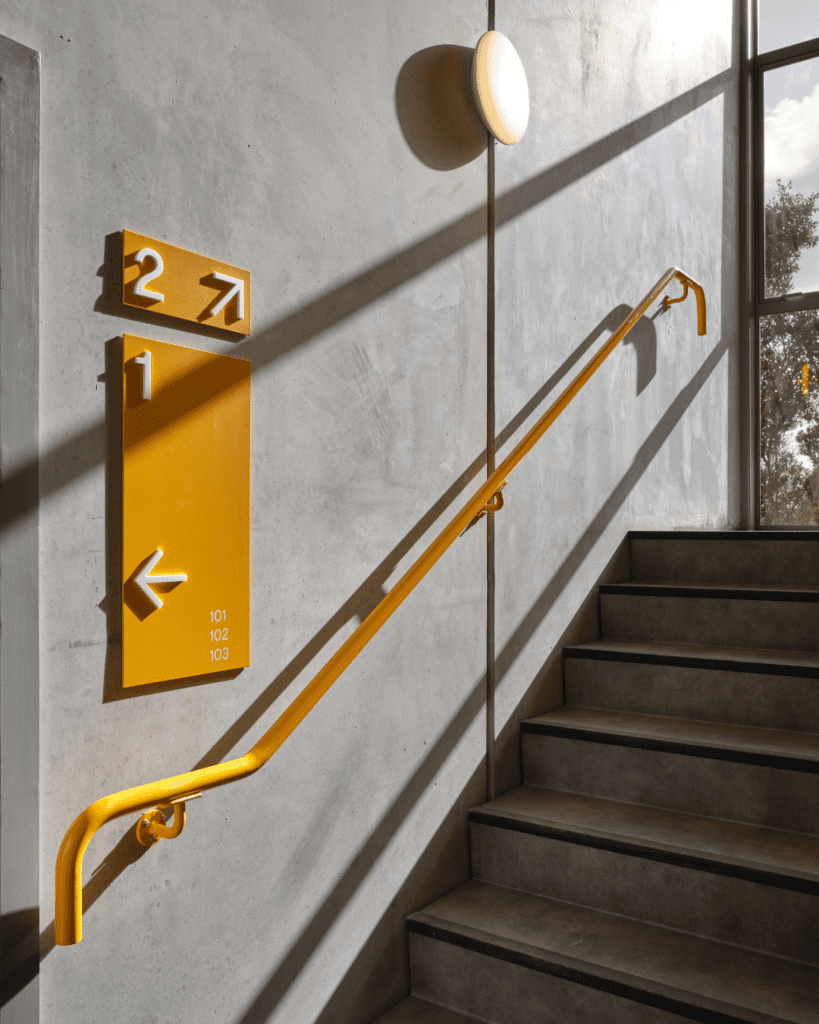 In Auckland, Strachan Group Architects’ Zion Apartments introduce a bright canary yellow across structural steelwork and graphic elements, bringing an optimistic energy to the building’s light brick façade.