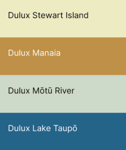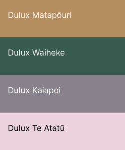 The canvas holds a rich sequence of hues, from the golden warmth of Dulux Matapōuri to the dusky mauve of Dulux Kaiapoi, the soft sugary pink of Dulux Te Atatū, and the deep green of Dulux Waiheke. Together, they evoke a place that is both expansive and intimate.