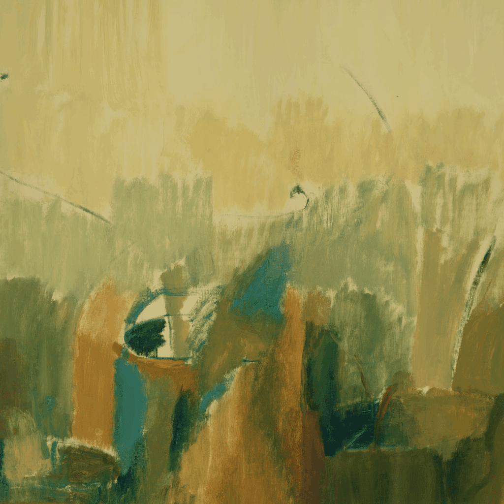 Across this foundation, Andrea floats gestures of ochre, blush, and green — moments that disrupt and animate the calm. Like the strait itself, the painting is a space between — charged with movement and changing light.