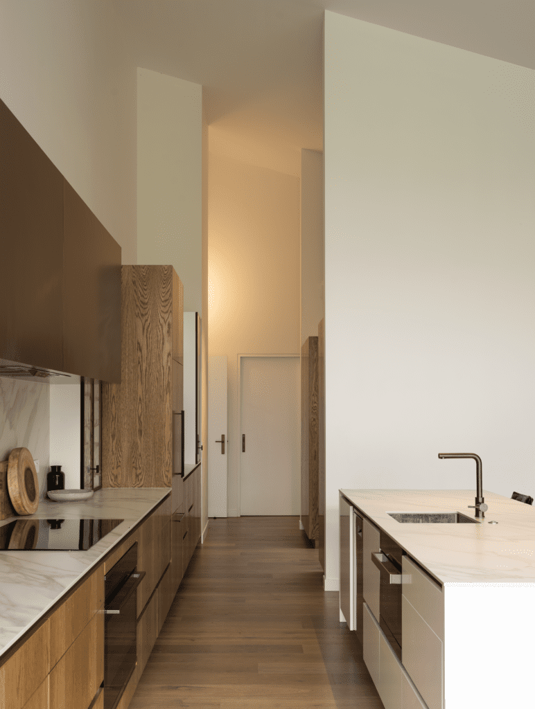 Inside, the noise of the road disappears. In the hallway, storage is hidden behind a wall of timber board and batten panelling — a nod to the exterior. A cocooned TV room is tucked in behind it, making it the only room in the public wing that isn’t oriented to the park.