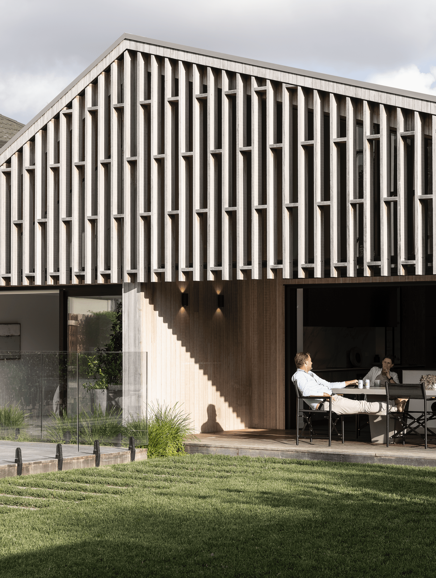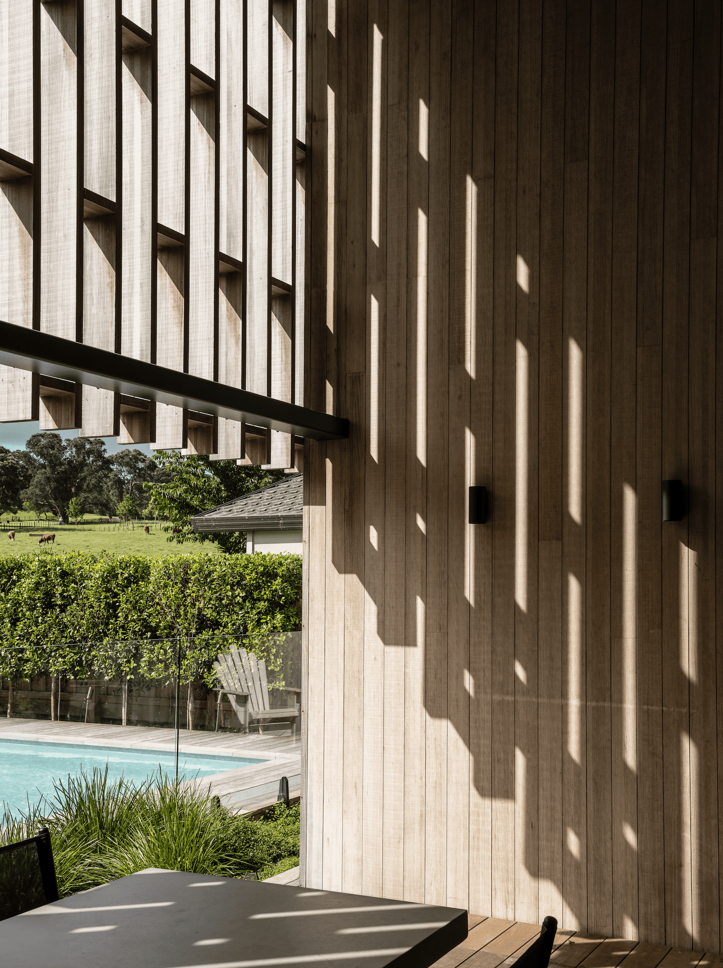 Outside, a flat lawn, a pool, an outdoor fireplace, and sitting area right by the green paddocks maximise al fresco living. So does a deep deck, sheltered by a board and batten roof and a patterned timber screen that throws dabbled shadows on the space. Just like the site and the layout, this exterior screen is a game of two halves: functional but also beautiful.