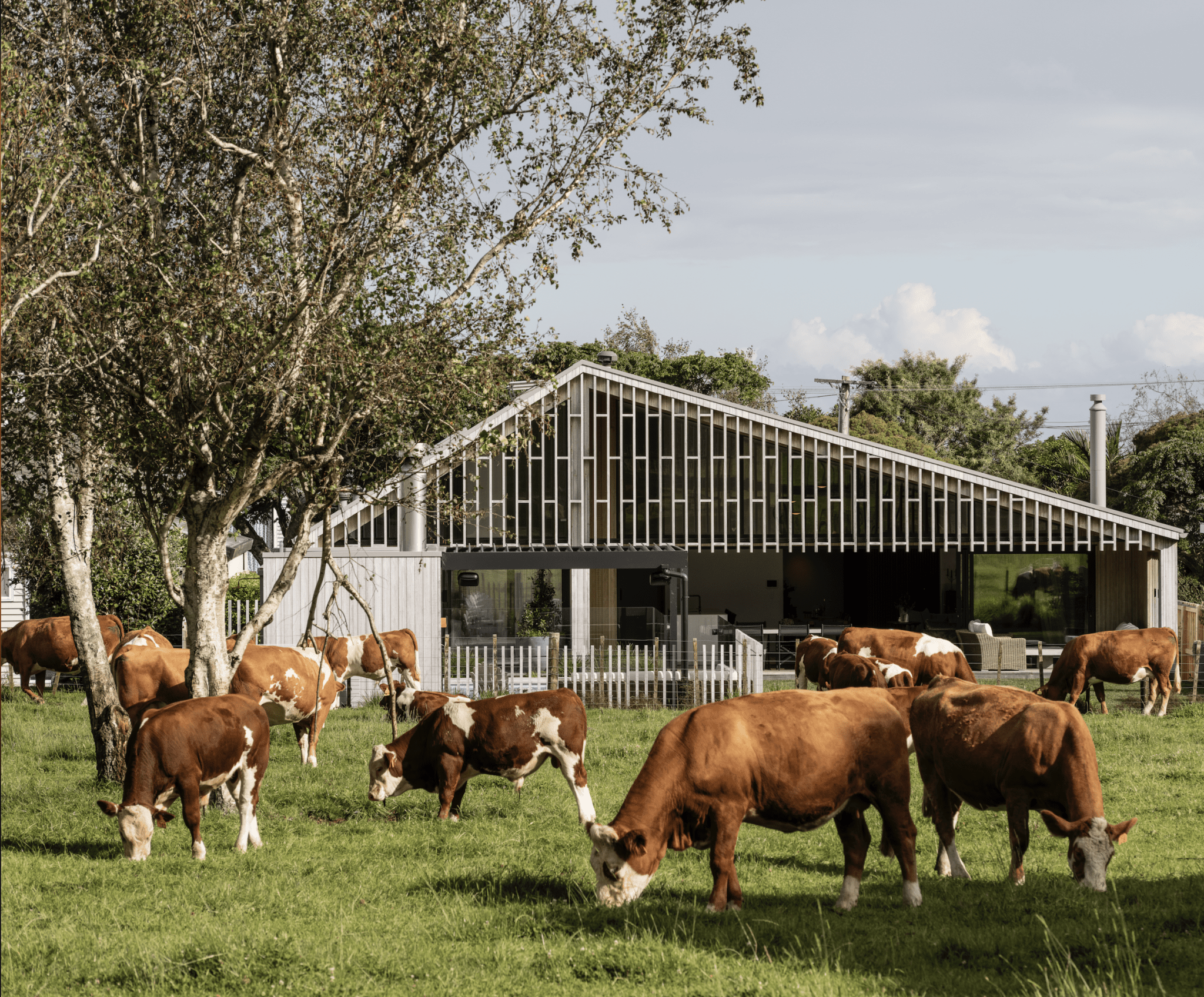A ‘game of two halves’ is a well-worn cliché, but bear with us while we apply it to a Tāmaki Makaurau dwelling. First, there are the two halves of the site. At the front, a noisy arterial route, moving thundering trucks and commuters in cars, and lined with unremarkable homes, can be seen and most definitely heard. At the back, paddocks, cows, sheep, and number 8 wire fences fill the vista. It’s a pastoral scene, a stark departure from the aforementioned trappings of suburban sprawl, and the quiet is deafening.