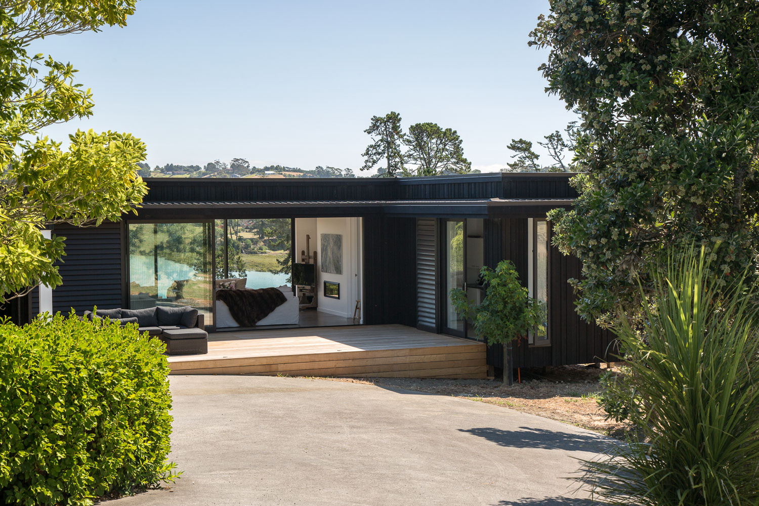 The resulting form spread out across the site, from north to south, facing east towards Kapiti Island. To achieve Passive House certification, double layers of insulation were installed along with triple glazing to ensure there was no thermal bridging between the glass and the frames.