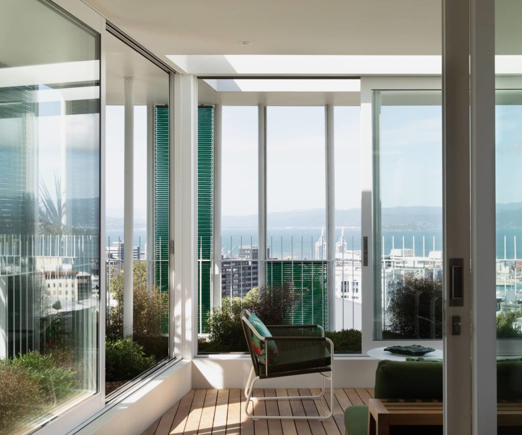 Designed for a couple by Parsonson Architects, this two-apartment project offers a panoramic view of Wellington Harbour. On an exposed hillside site, Passive House principles were used to ensure this home will protect against the famous Wellington southerlies.