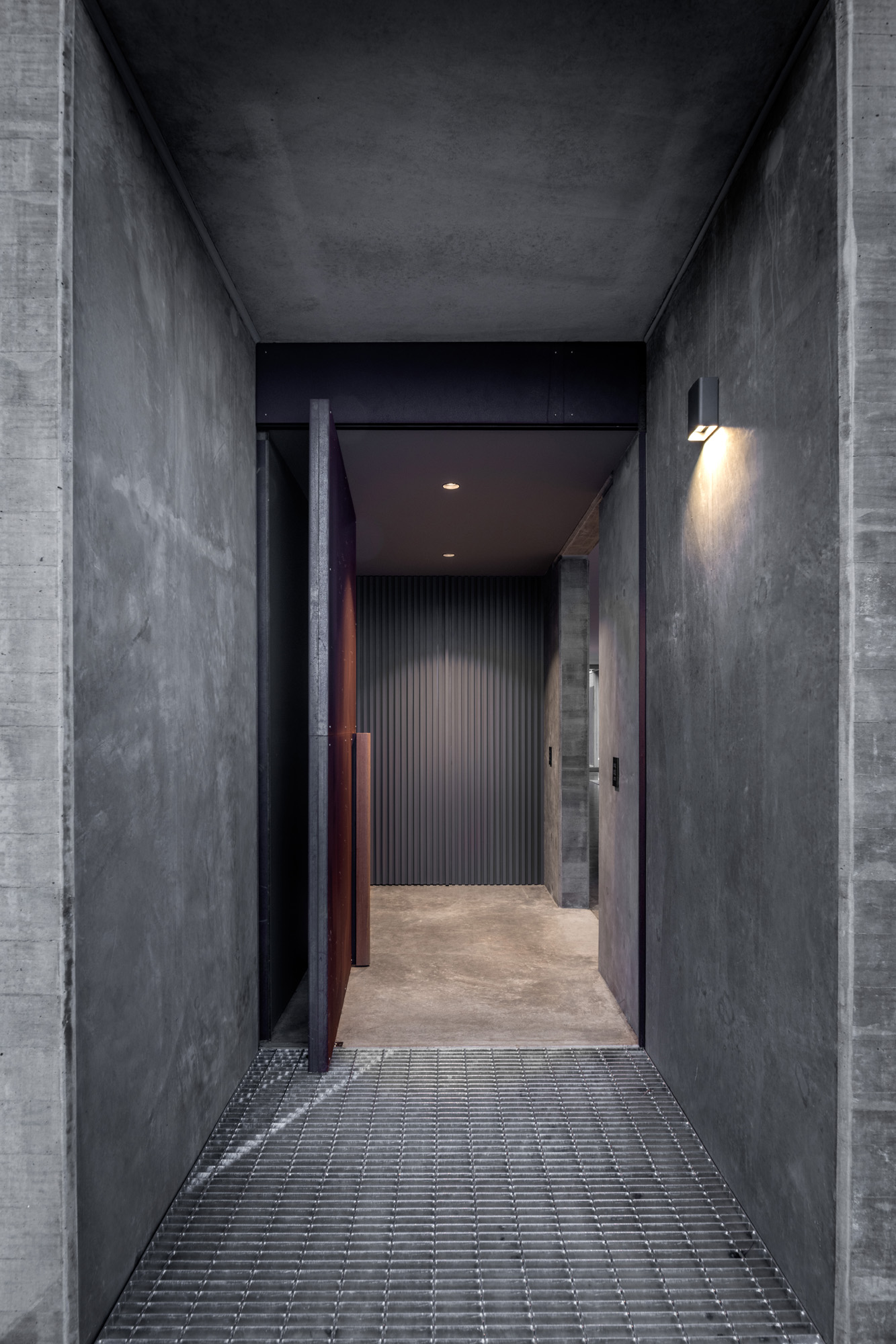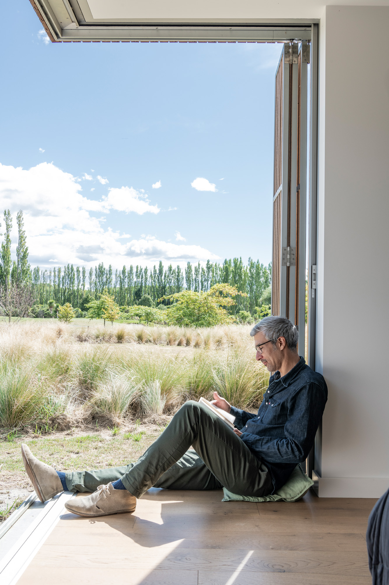 Every door and window in this house — aside from one near the bespoke Corten steel entry door — was designed to slide away into a cavity, to accentuate the sense of the building being a pavilion.