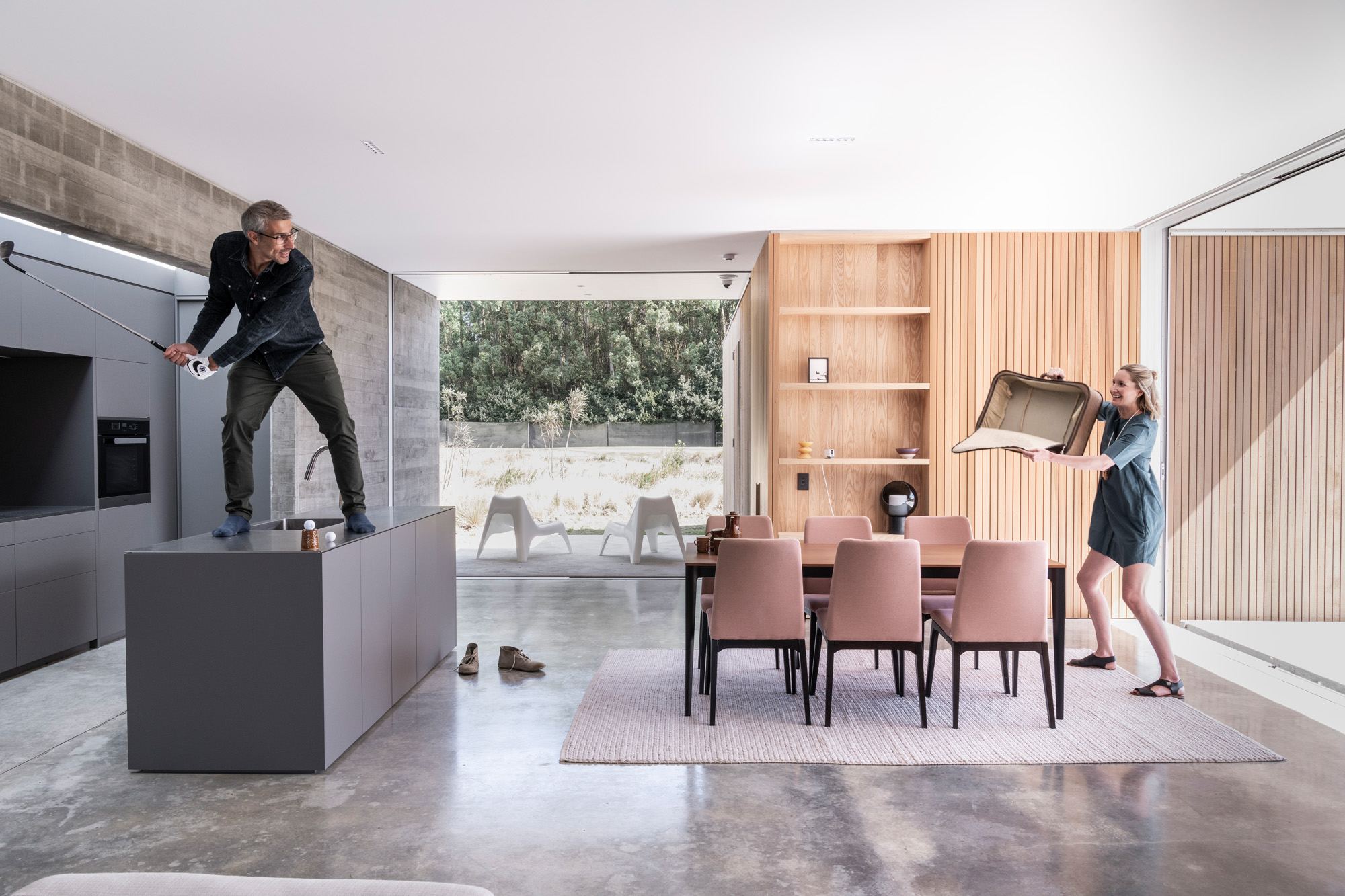 Marion says that part of the design of the bedrooms was centred around ensuring they would open up in a complete way to the outdoors. The result is rooms where glazing on two sides slides away, leaving a corner of each room completely open to the elements — and the golf course. Exterior folding timber screens allow for privacy and shading when the rooms are open.
