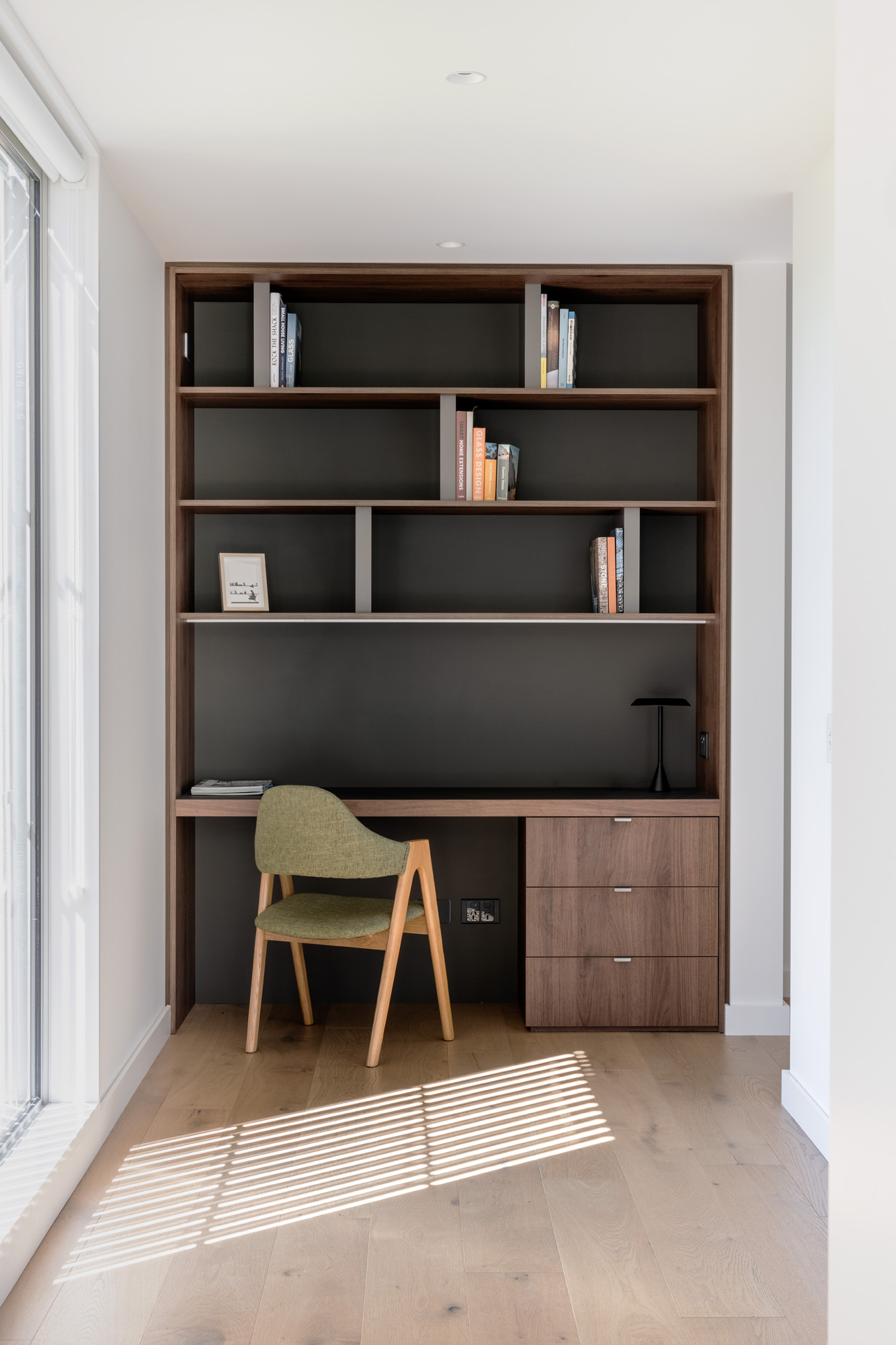 Additional lighting is incorporated into inbuilt shelving units.