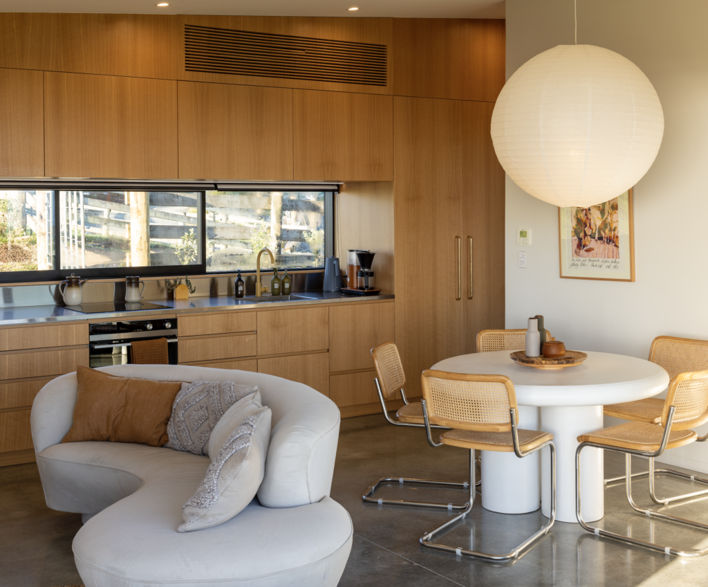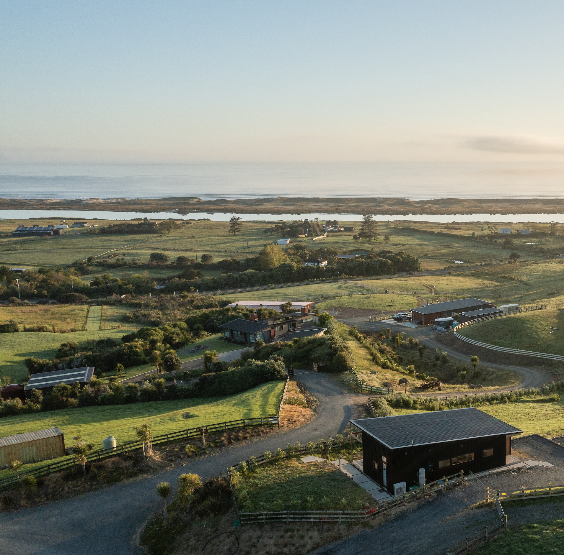 Preferring a sheltered inland section to a beachfront site, they found an elevated rural one-acre with views of Bream Bay that fitted the bill. The couple then approached their friend, Dominic Glamuzina, director and founder of Glamuzina Architects. The brief was for a large, four-bedroom house with good separation away from a minor two-bedroom dwelling — to rent out one or house extended family — and a pool.
