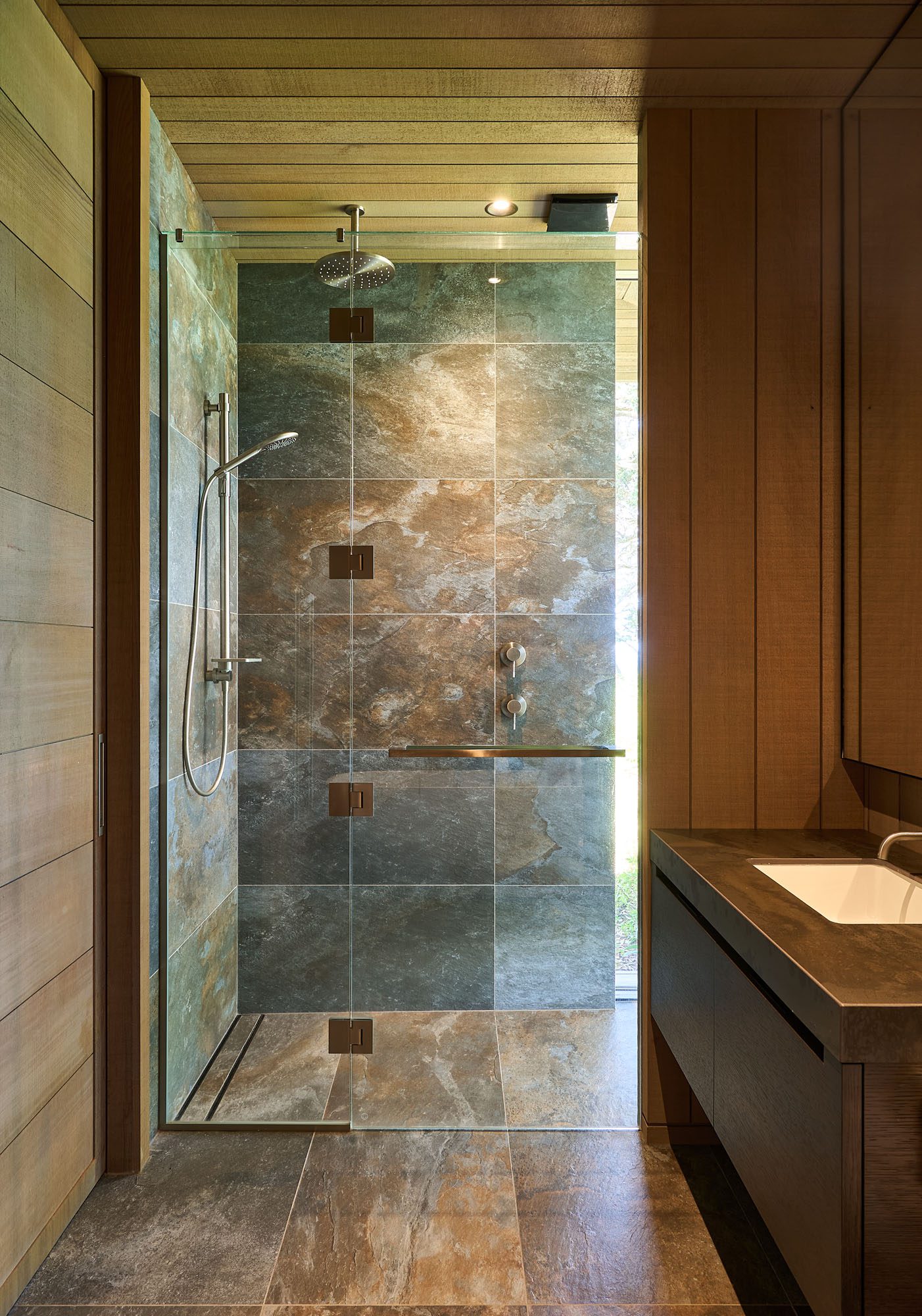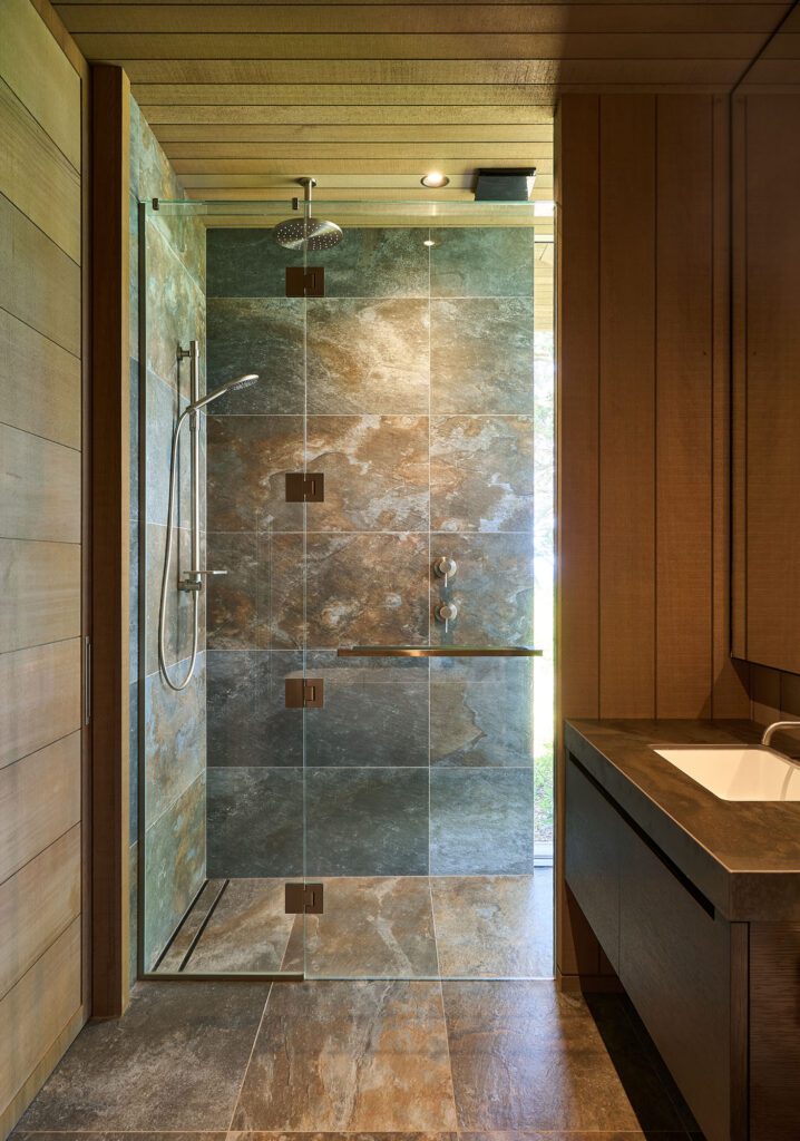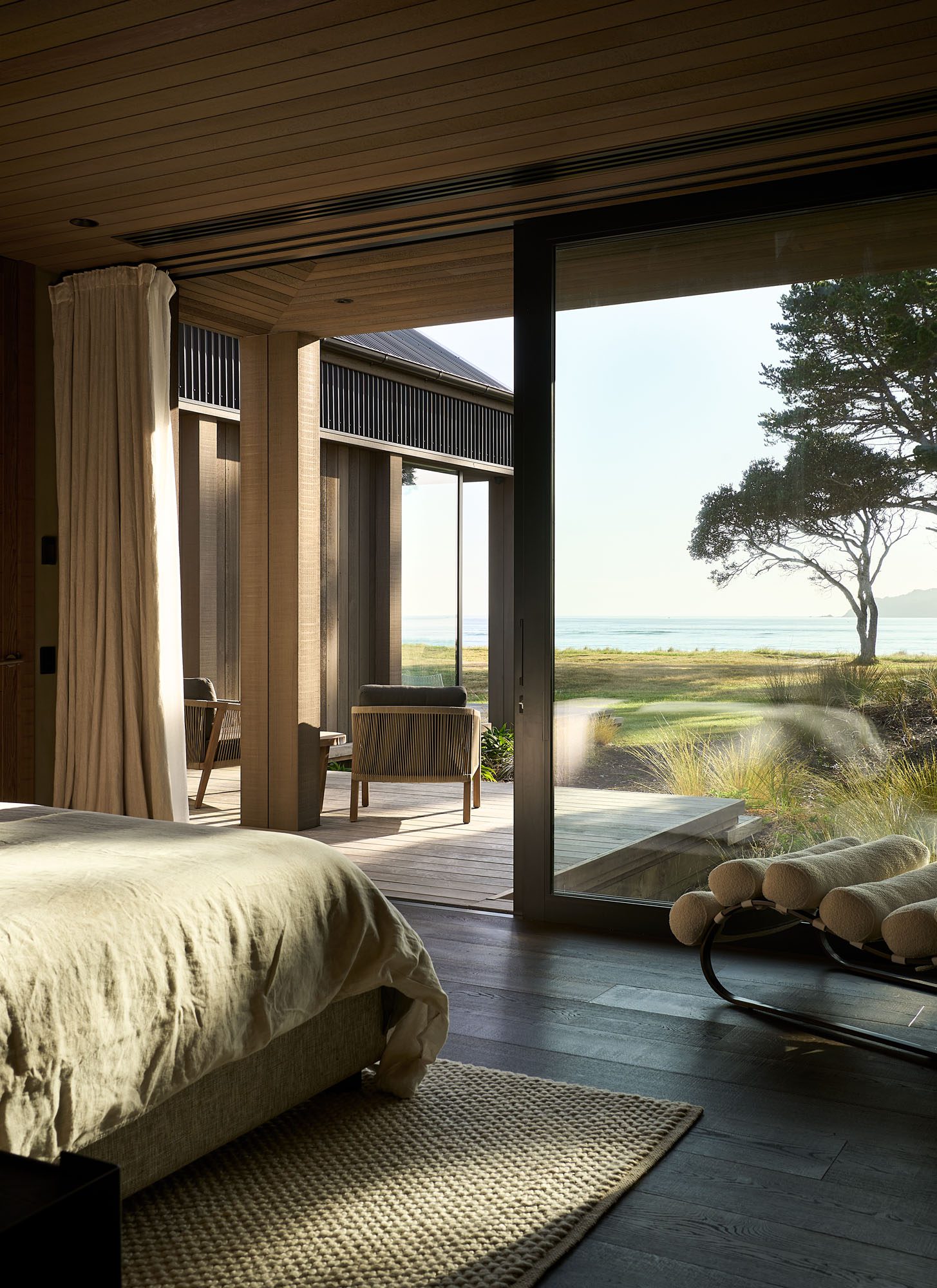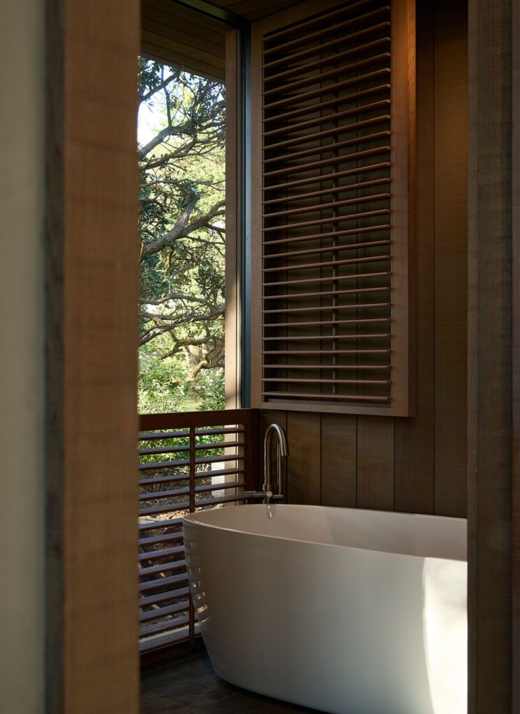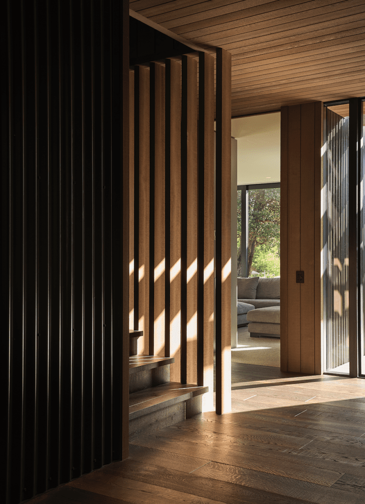 “If you imagine that you took the roof off any section, the pavilions read as a true corrugate form. It comes back to that concept: wherever we cut big recesses or openings, we return to the cedar,” says the architect. “It’s quite a simple concept, really, but we spent a lot of time trying to work out how to make you feel like you’re constantly blurring what is inside with what is outside, and taking away some of the formality, given that it is a beach house.”