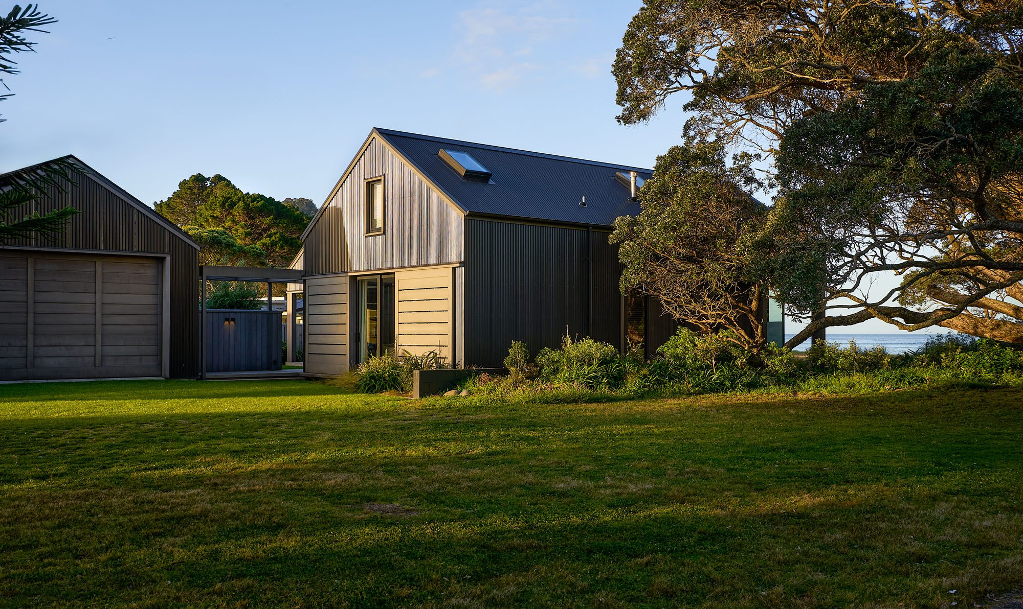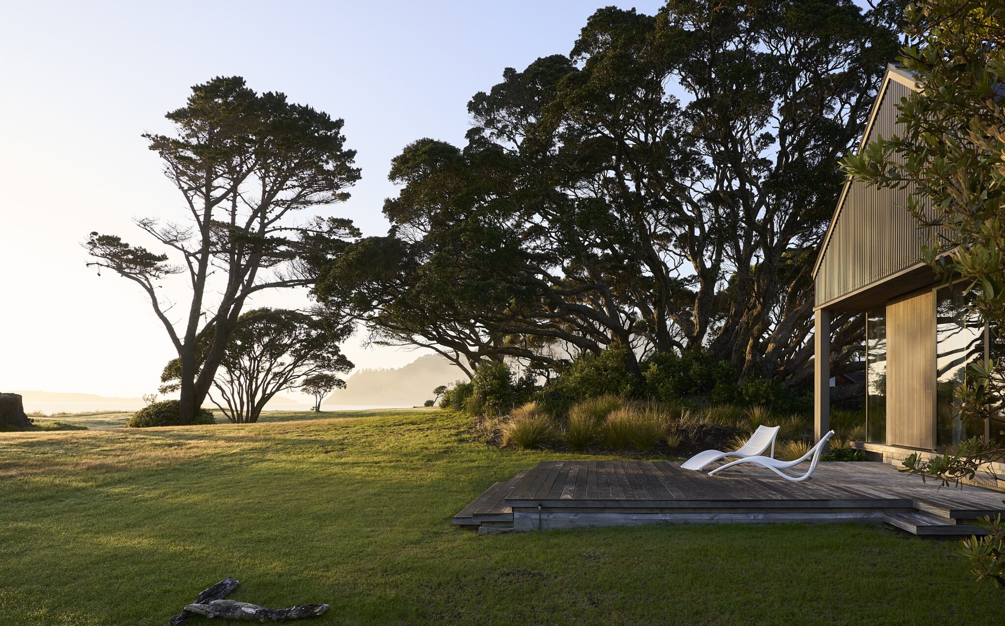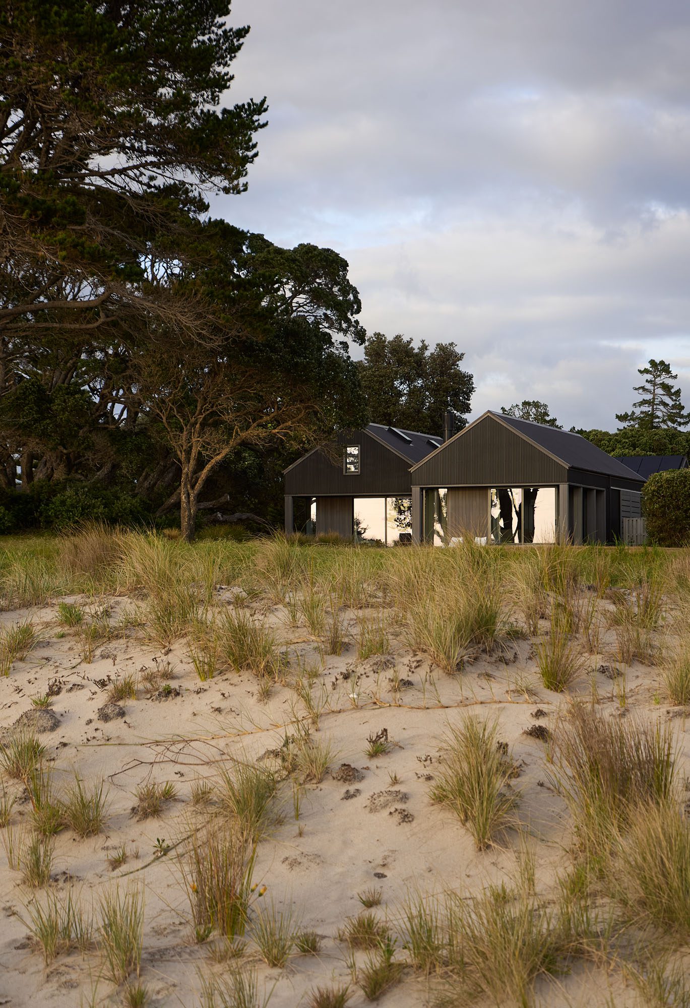 Outside, a pōhutukawa that drapes about 30 per cent of the site, Norfolk pines, and other evergreens provide further drama and contrast with the dunescape of Pauanui.